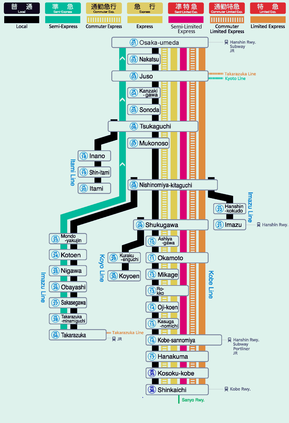 아울러 타카라즈카 본선, 고베본선, 교토본선 등 3개의 노선과 지선 몇 개를 가지고 있는데, 오사카에서는 한큐철도와 간사이공항을 오가는 난카이철도가 가장 중요한 노선으로 간주하고 있습니다.