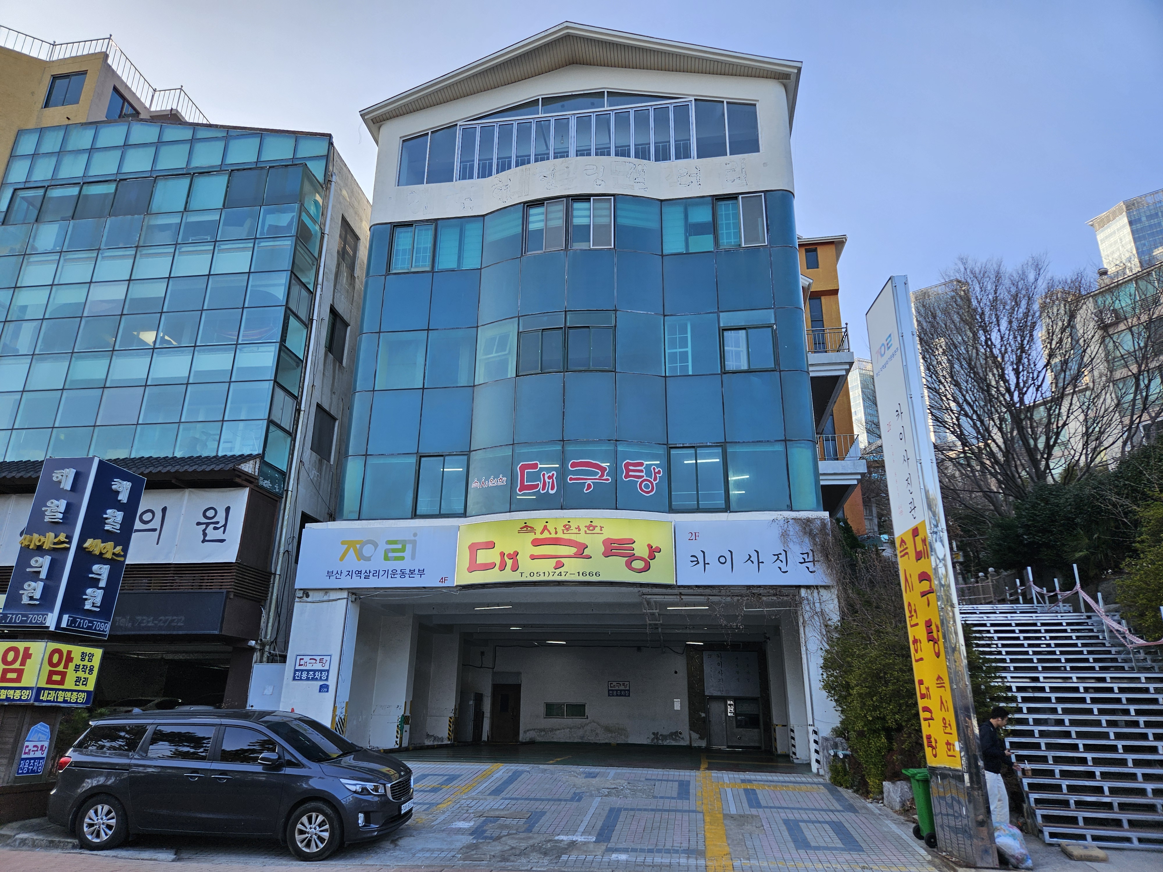 달맞이길에서 보면 1층은 속시원한 대구탕 주차장이 있고, 옆 계단으로 올라가면 식당이 있습니다.