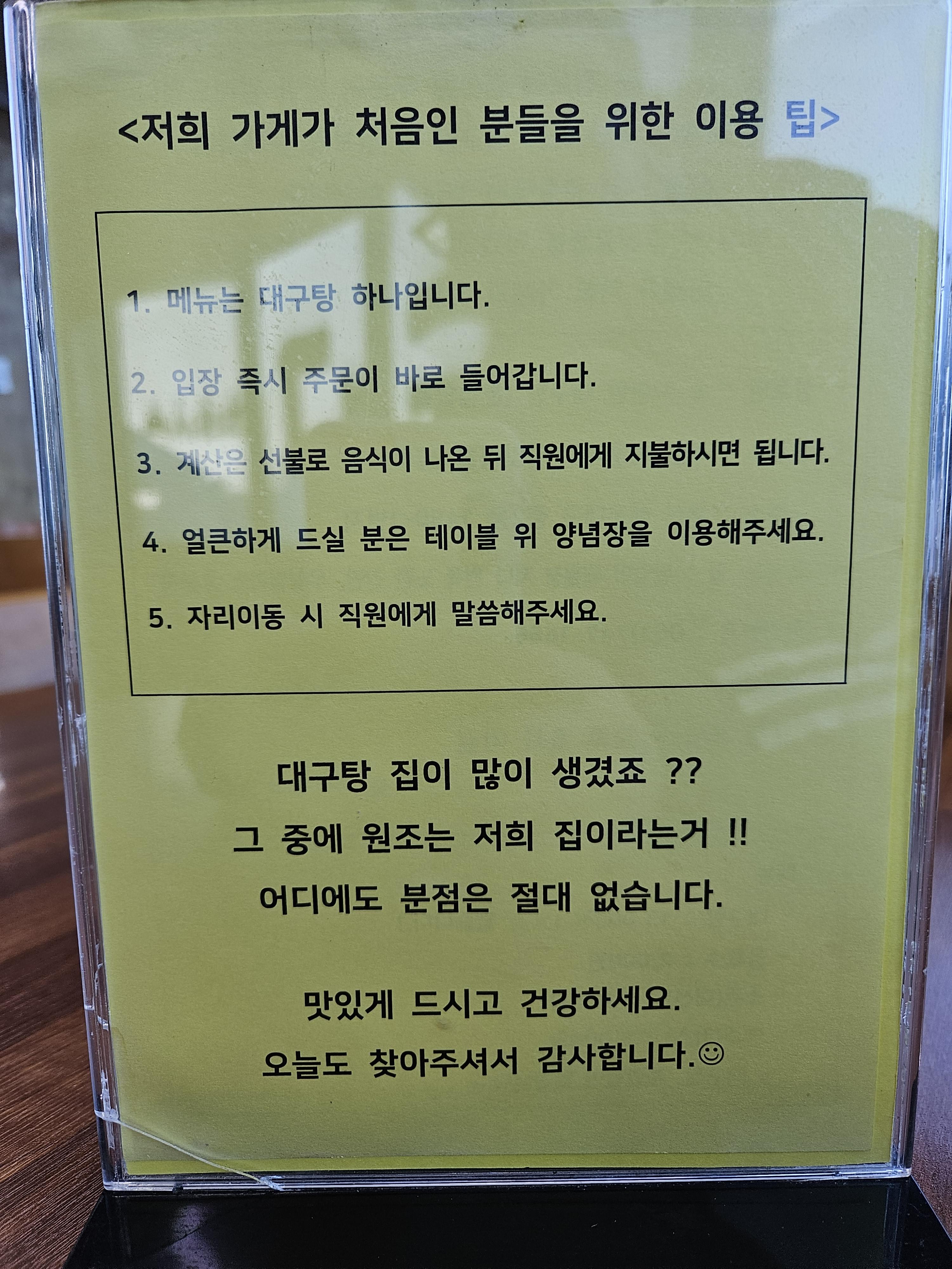 그리고 유사한 상호명의 대구탕 가게가 몇 군데 생겨서 그런지 원조는 이곳이라는 점과 분점이 없다고 강조하고 있습니다.