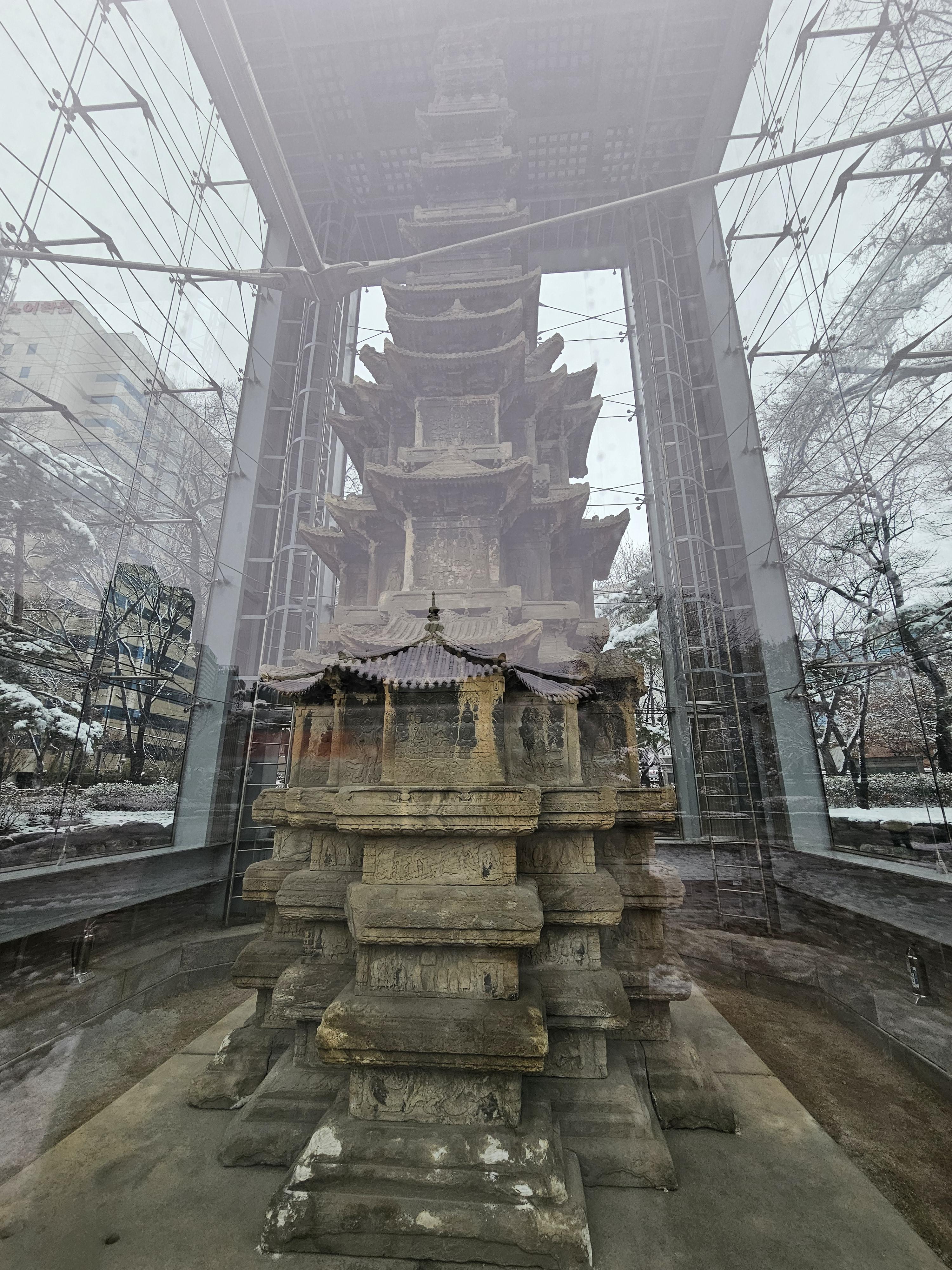 석탑 보호를 위해 유리로 둘러쳐져 있습니다.