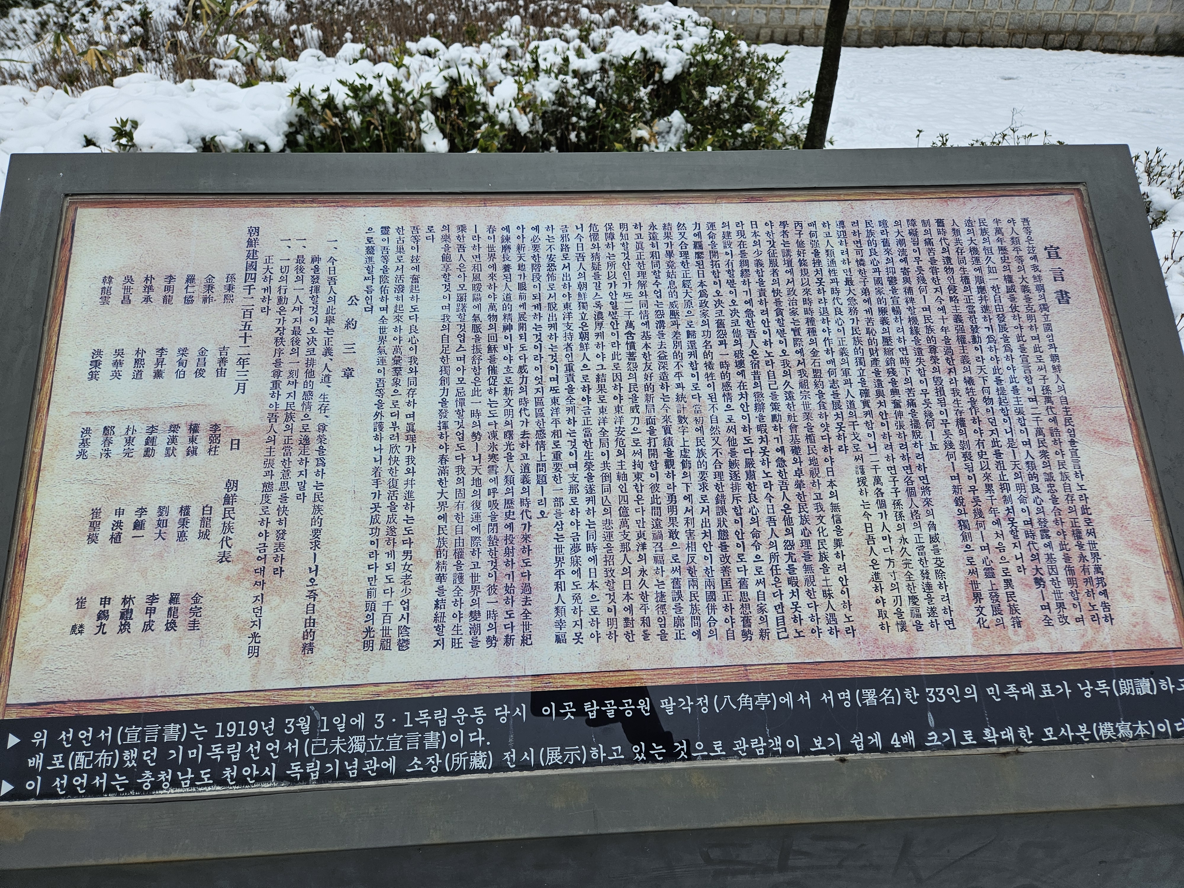 1919년 3월 1일, 3.1 독립운동 당시 탑골공원 팔각정에서 서명한 33인의 민족대표가 낭독하고 배포한 기미독립선언서 내용입니다.