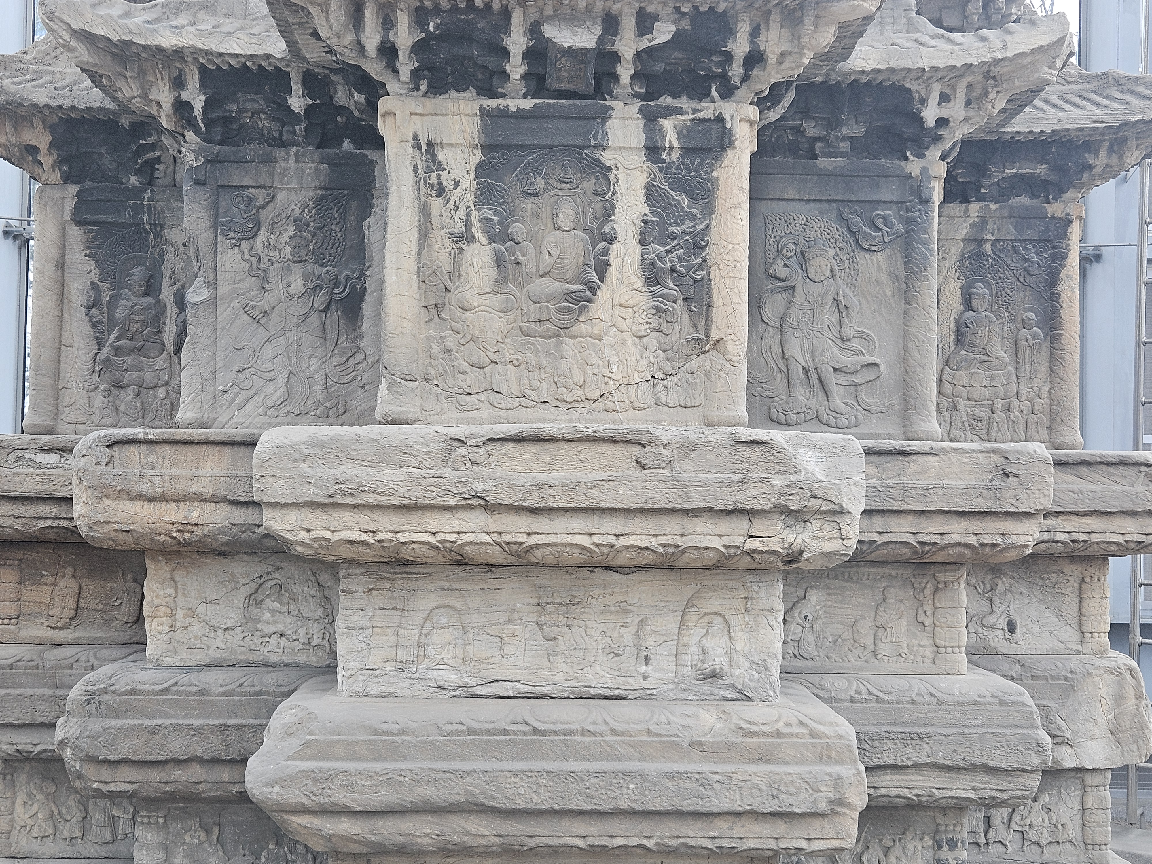 '亞' 자 모양의 기단은 세 겹인데 아래에는 용과 연꽃같은 무늬를 새겼고, 중간에는 삼장법사와 손오공과 저팔계, 사오정 일행이 인도에서 불법을 구해 오는 과정을 새겼습니다.
