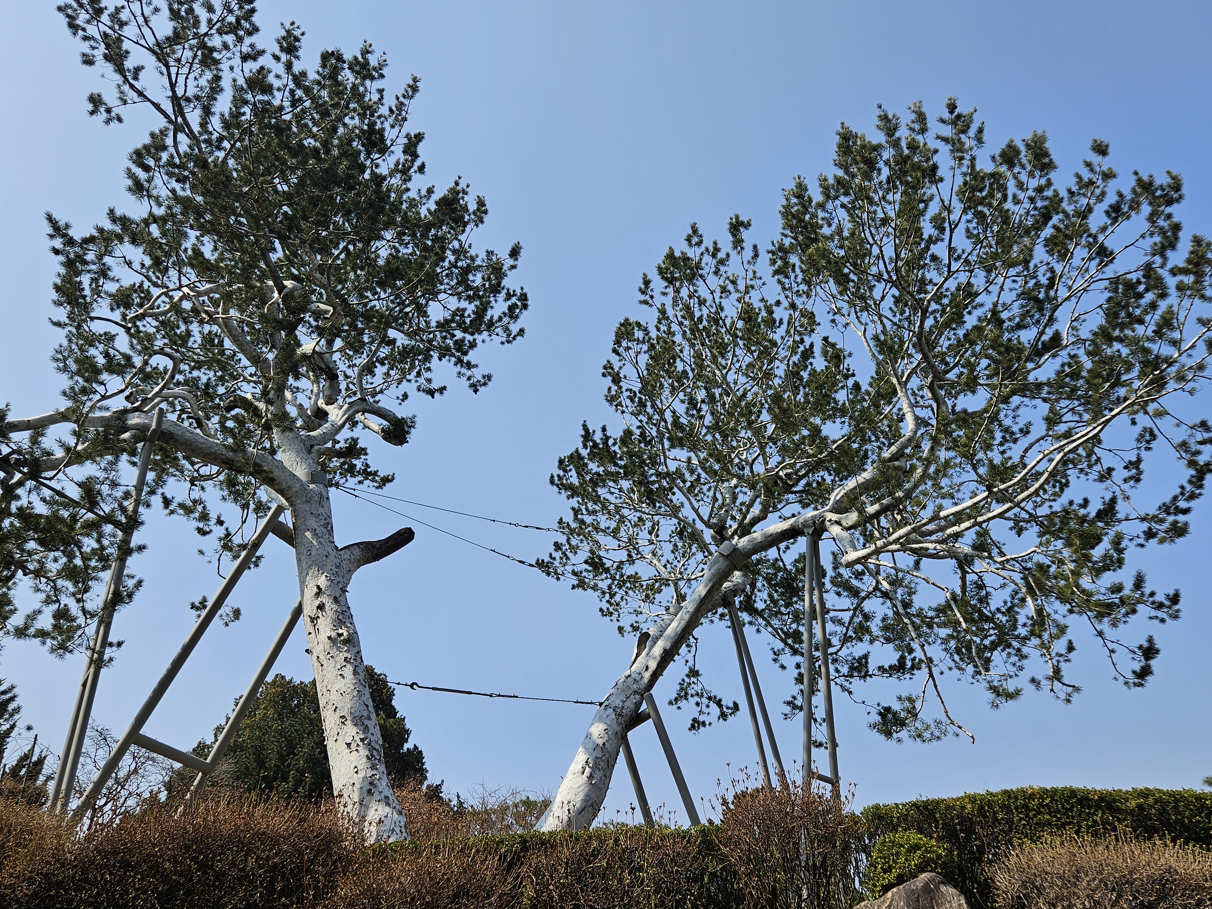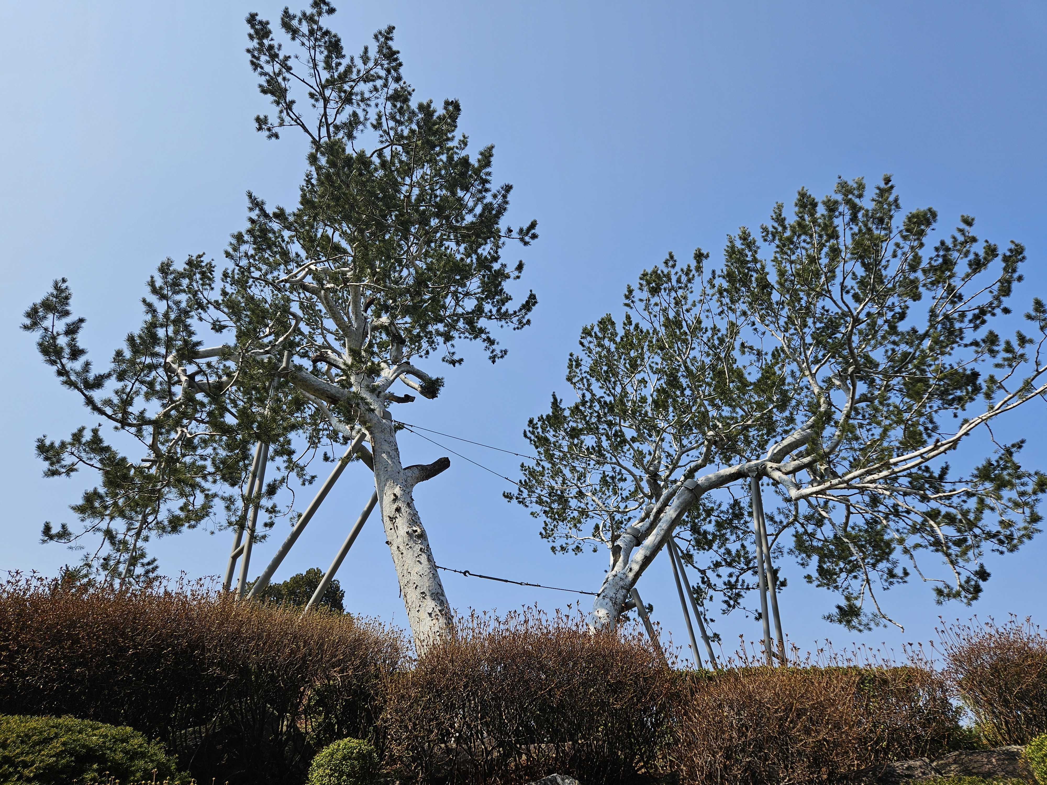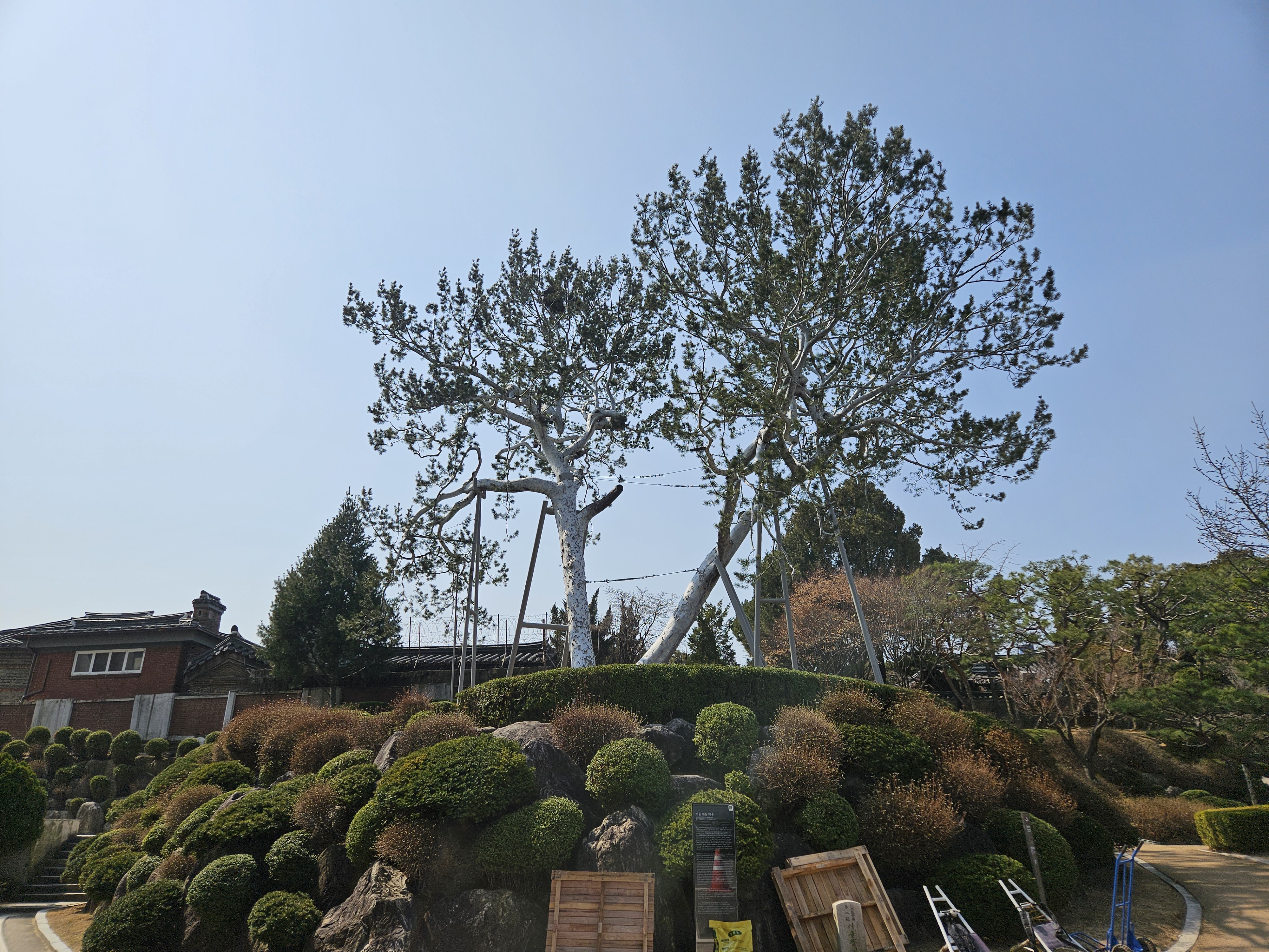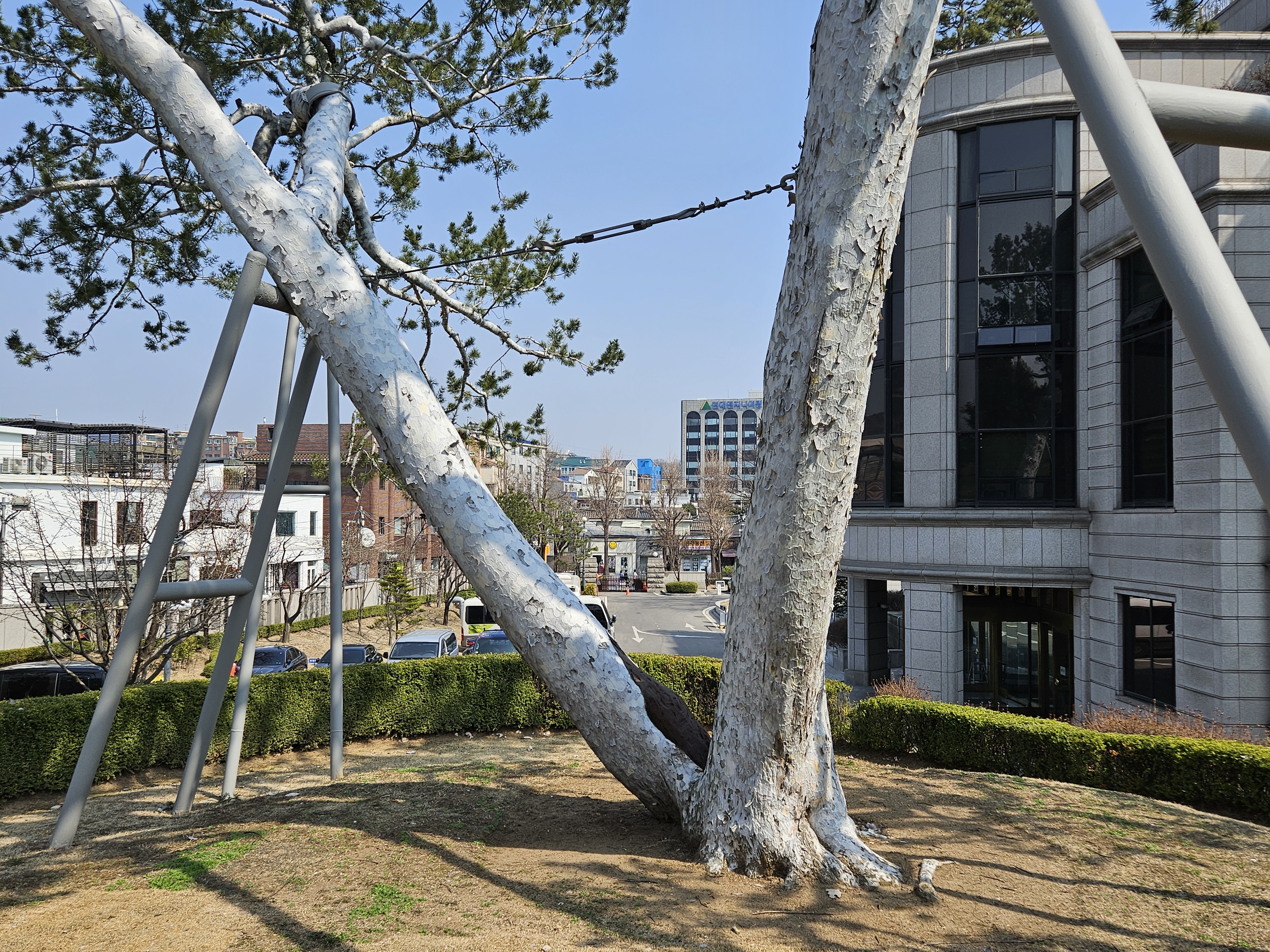이 둘로 나뉜 굵은 줄기가 넓게 벌어져 큰비와 바람에 찢겨나갈 수도 있는 불안한 모습이지만, 백송 특유의 하얀 줄기 껍질만큼은 더없이 인상적입니다.