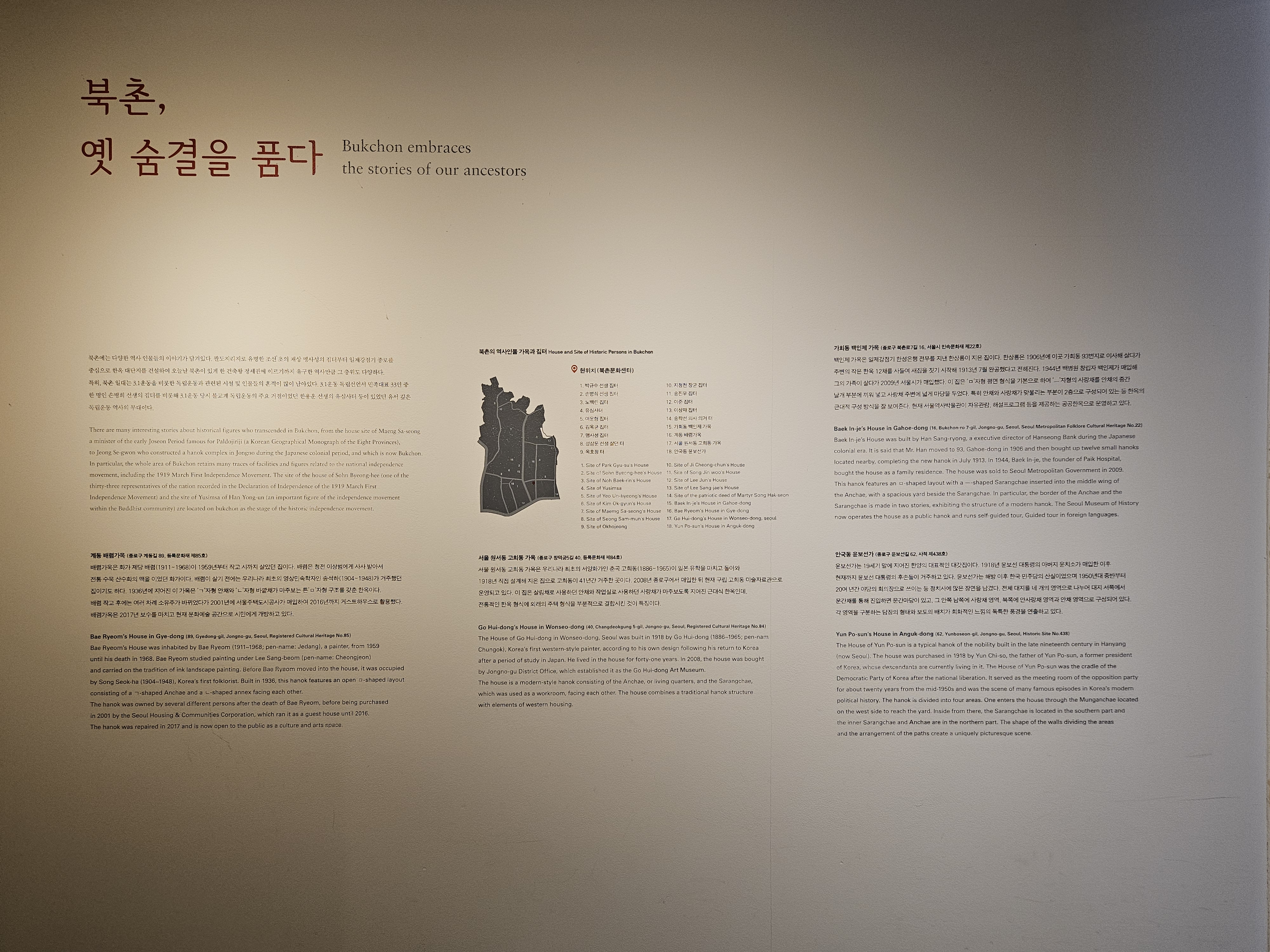 북촌엔 팔도지리지로 유명한 재상 맹사성의 집터부터 일제강점기 대단위 한옥을 건설한 건축왕 정세권까지, 3.1 운동을 비롯한 독립운동 관련시설과 인물의 흔적까지 남아 있습니다.