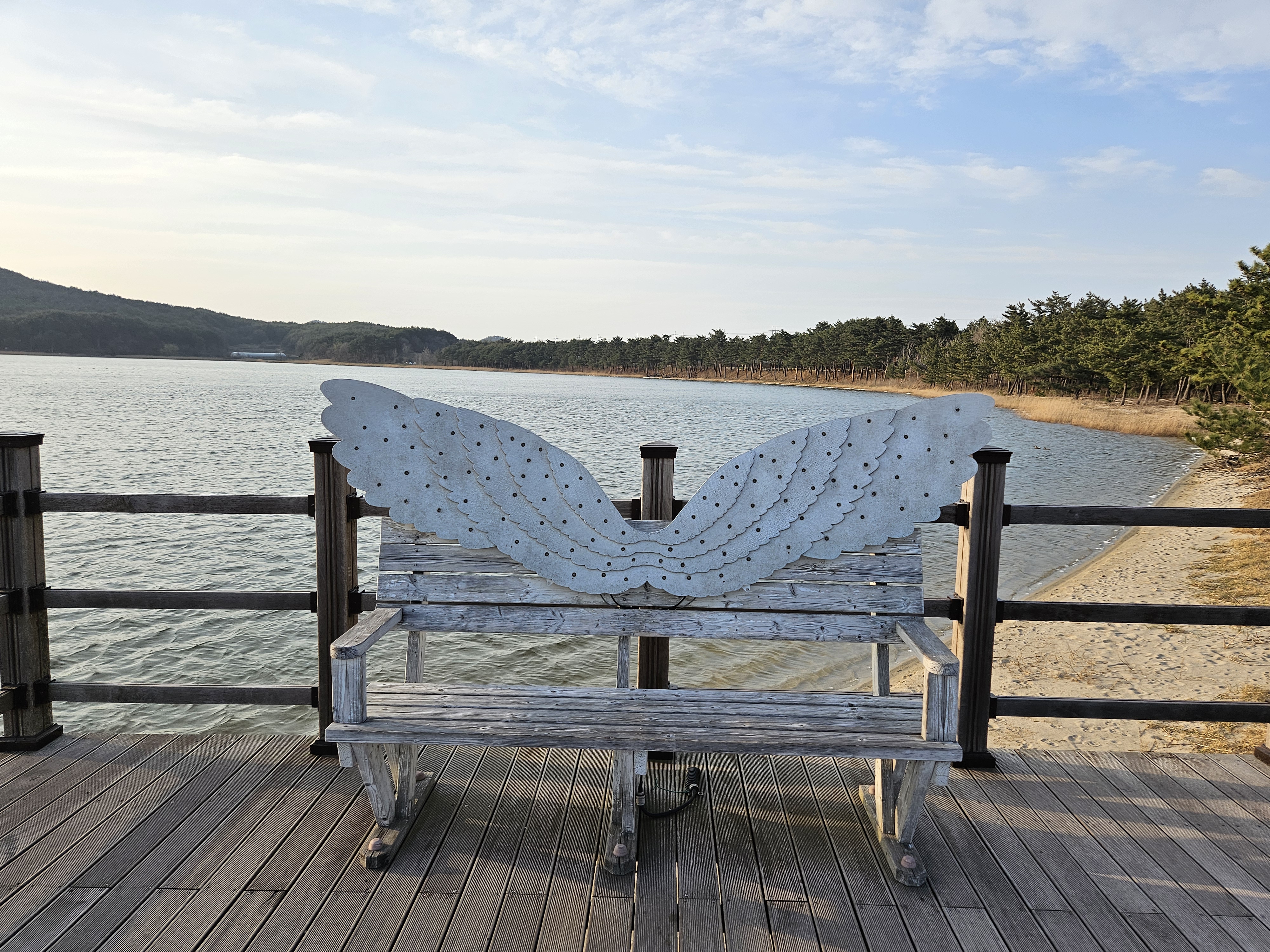 송지호 관망타워애소 호수방향으로 100여 미터 가면 전망데크가 있고, 반대편엔 송지호 해수욕장과 서낭바위가 있습니다.
