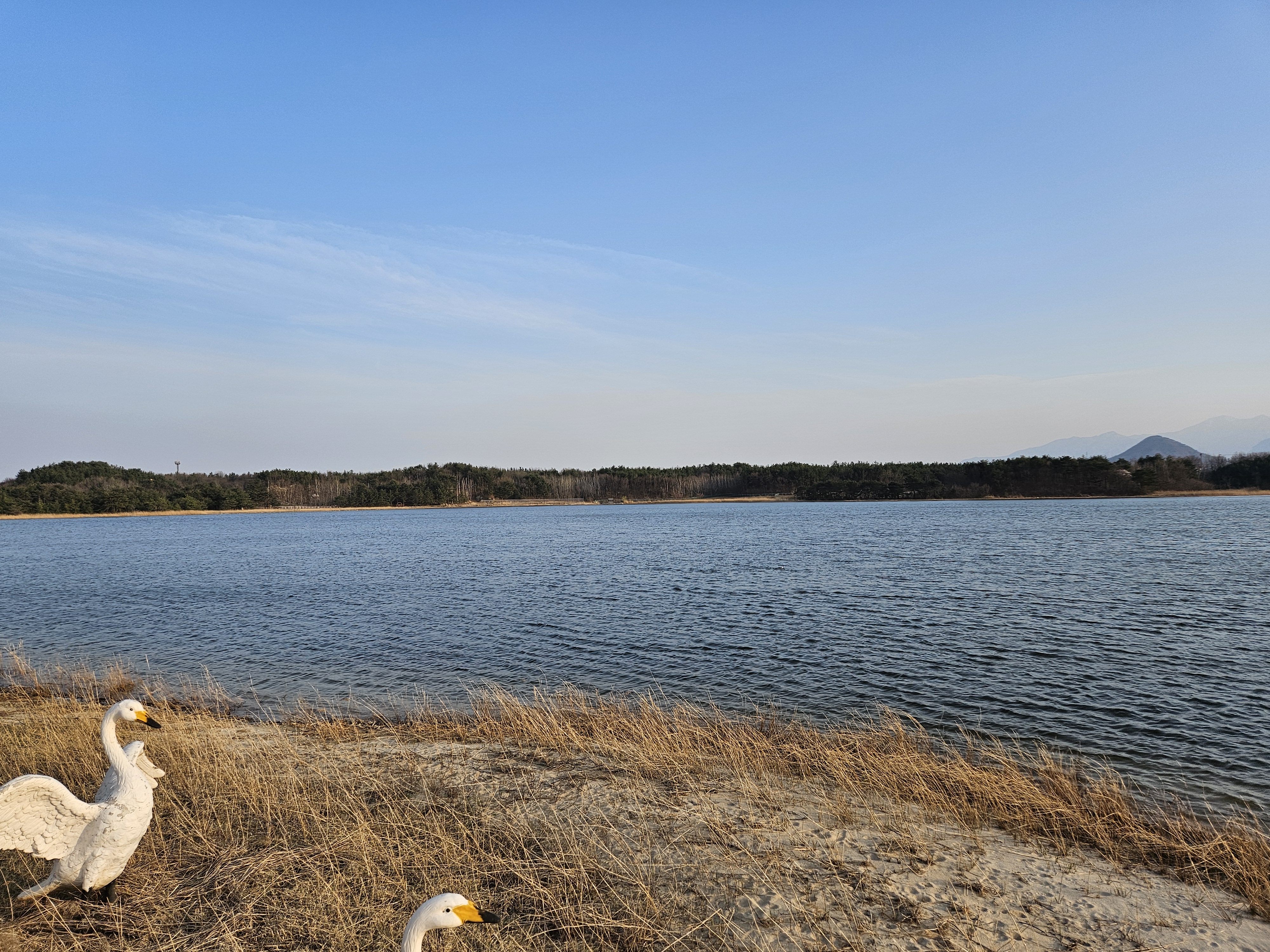 송지호 앞에는 송지호를 조망할 수 있는 송지호 관망타워가 있고, 조금만 걸어 나가면 송지호를 구경할 수 있습니다.