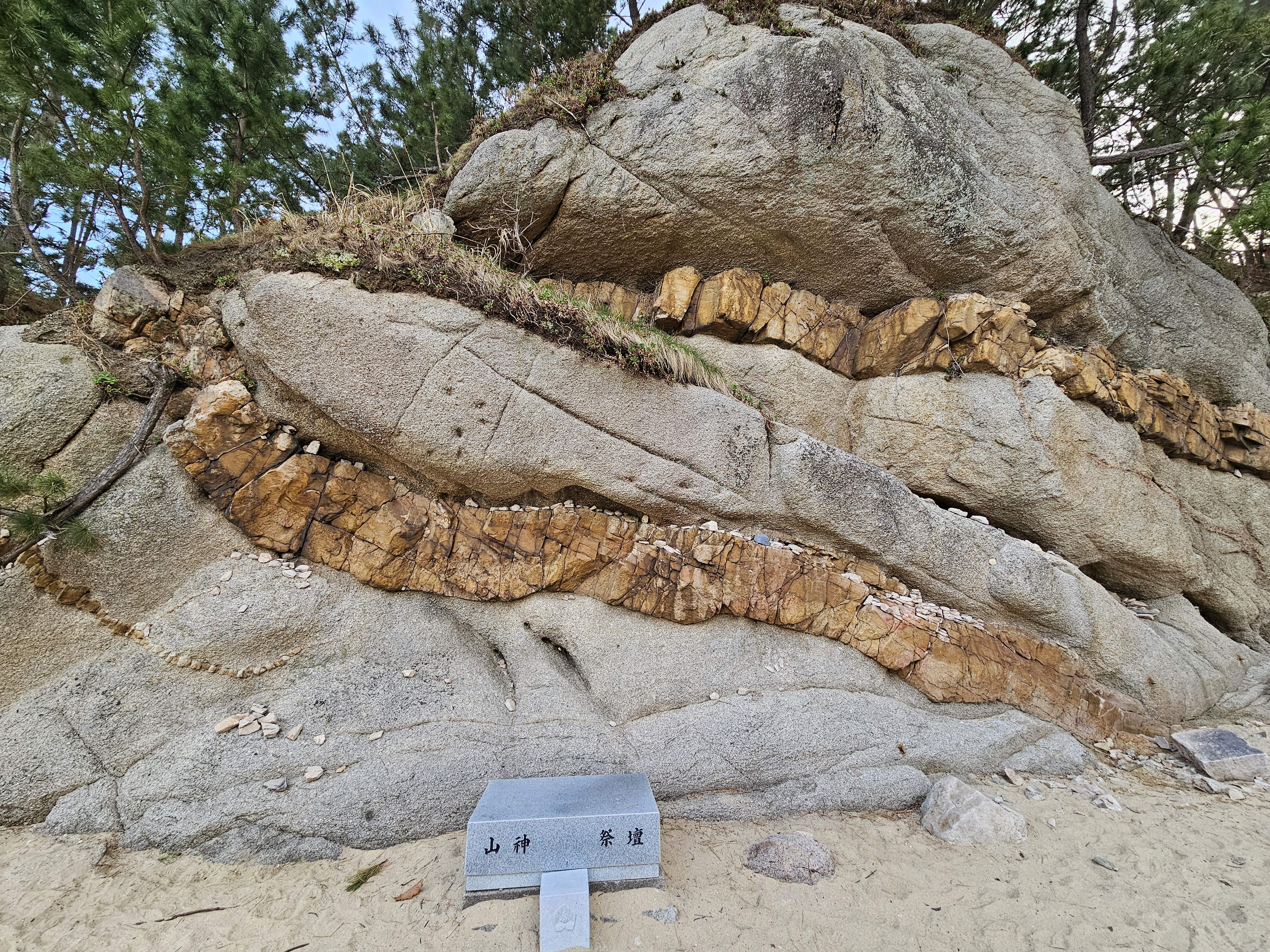특히, 화강암층 사이로 두터운 규장질 암맥(dike rock)이 파고든 형태를 이루어 독특한 경관을 형성하고 있습니다.