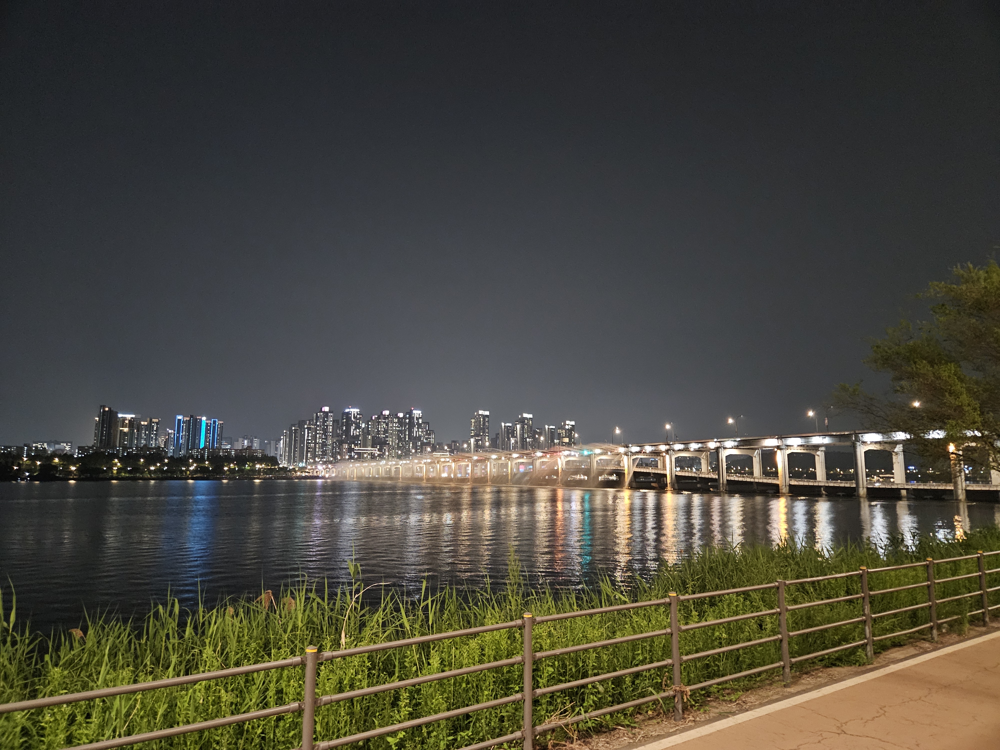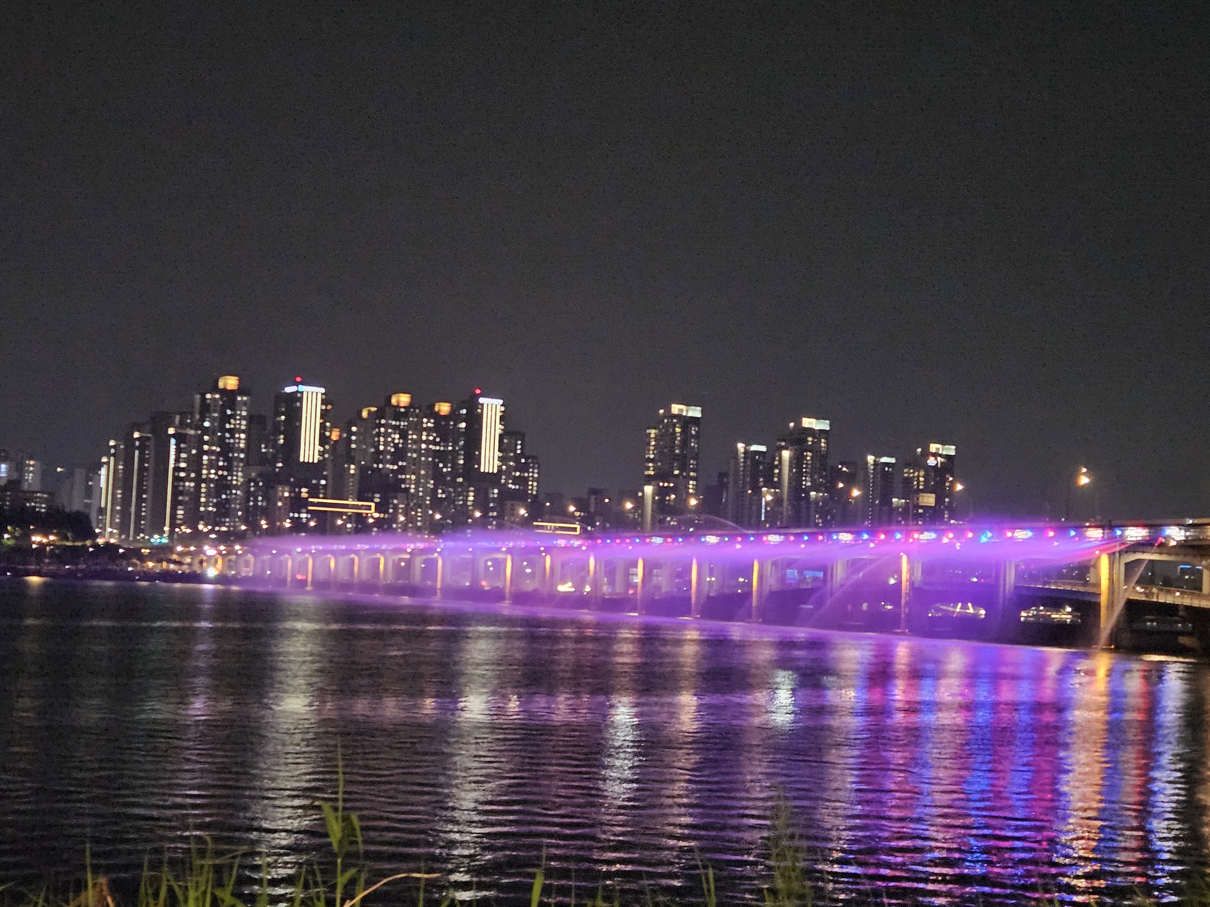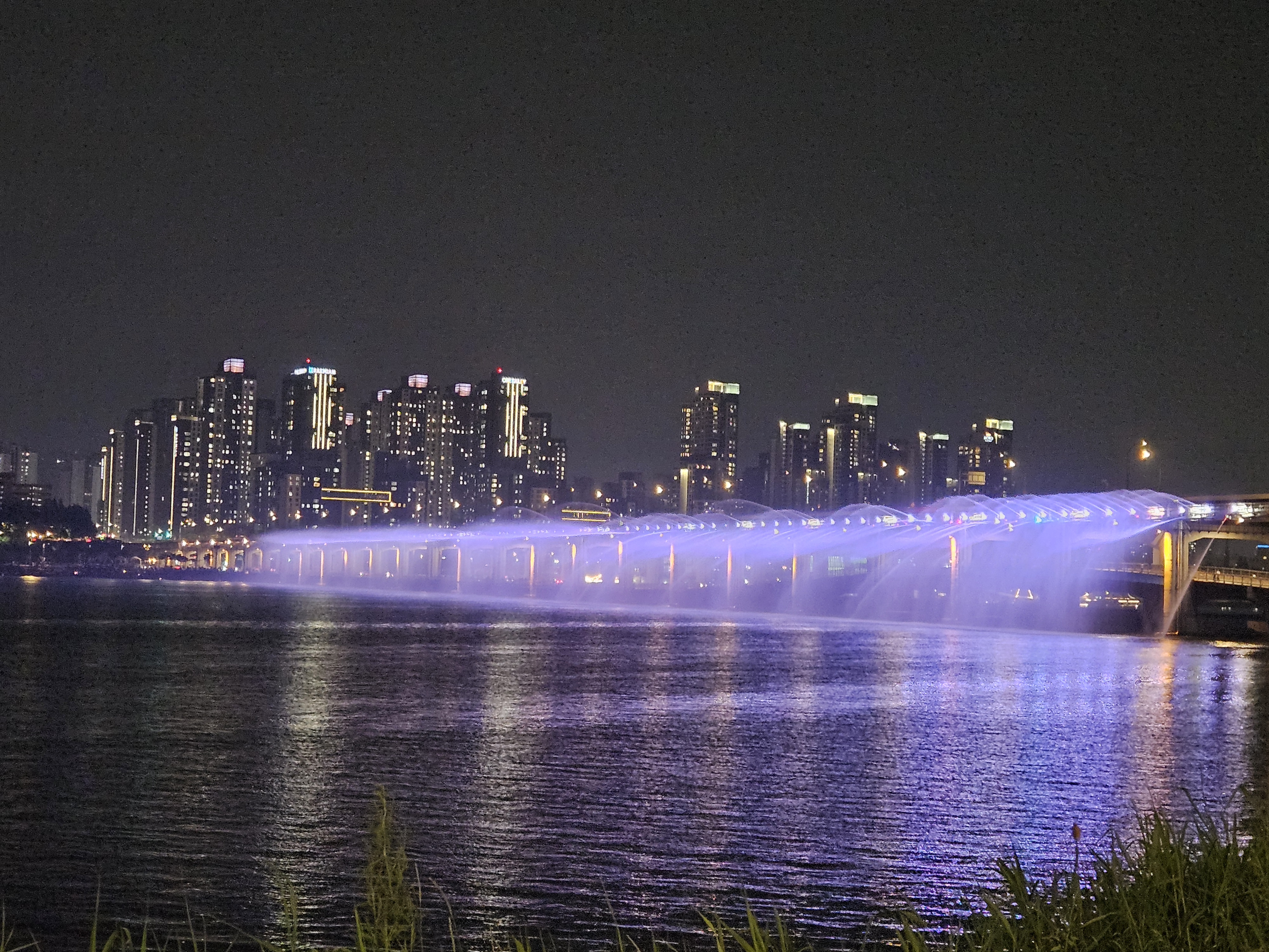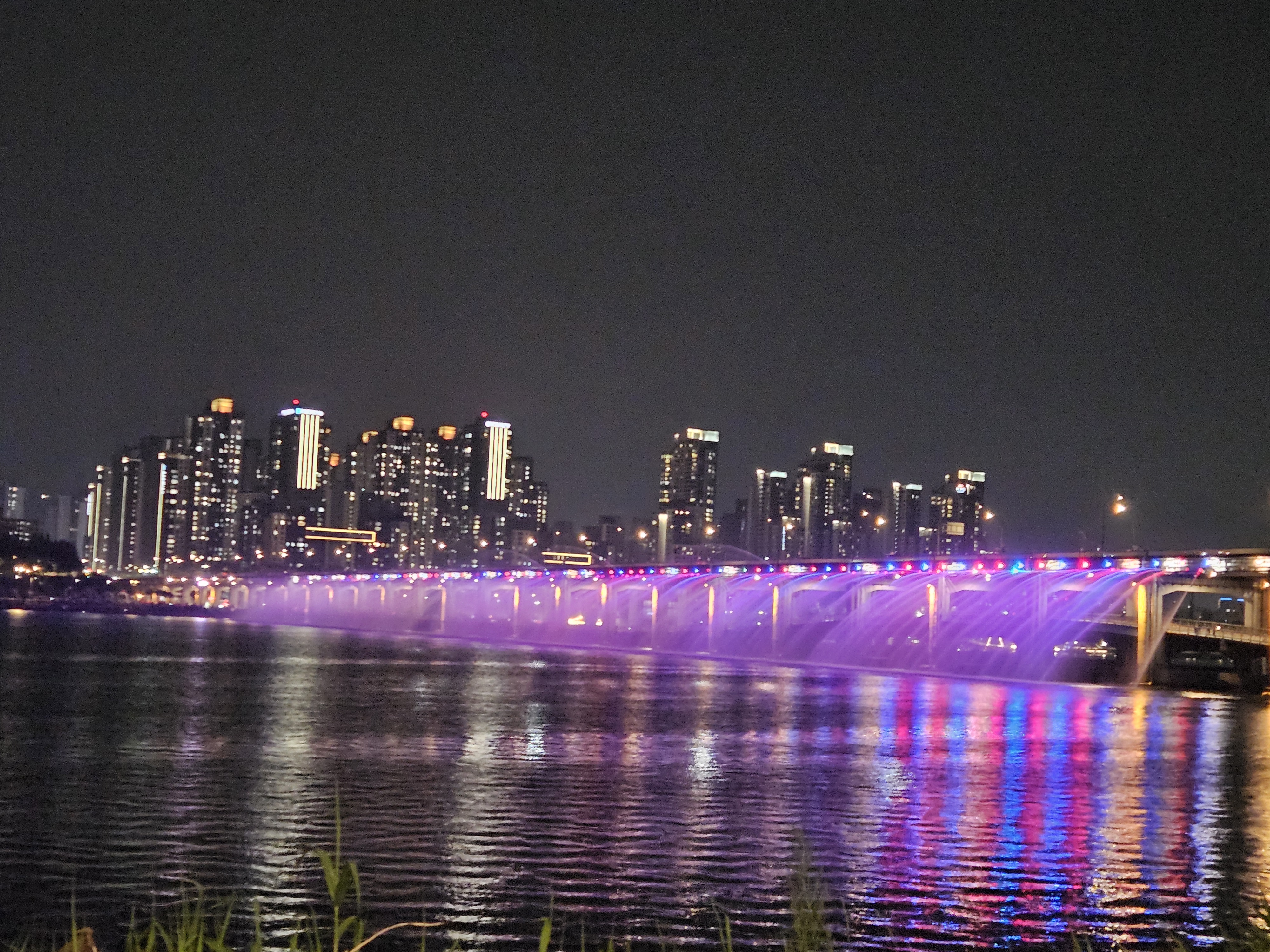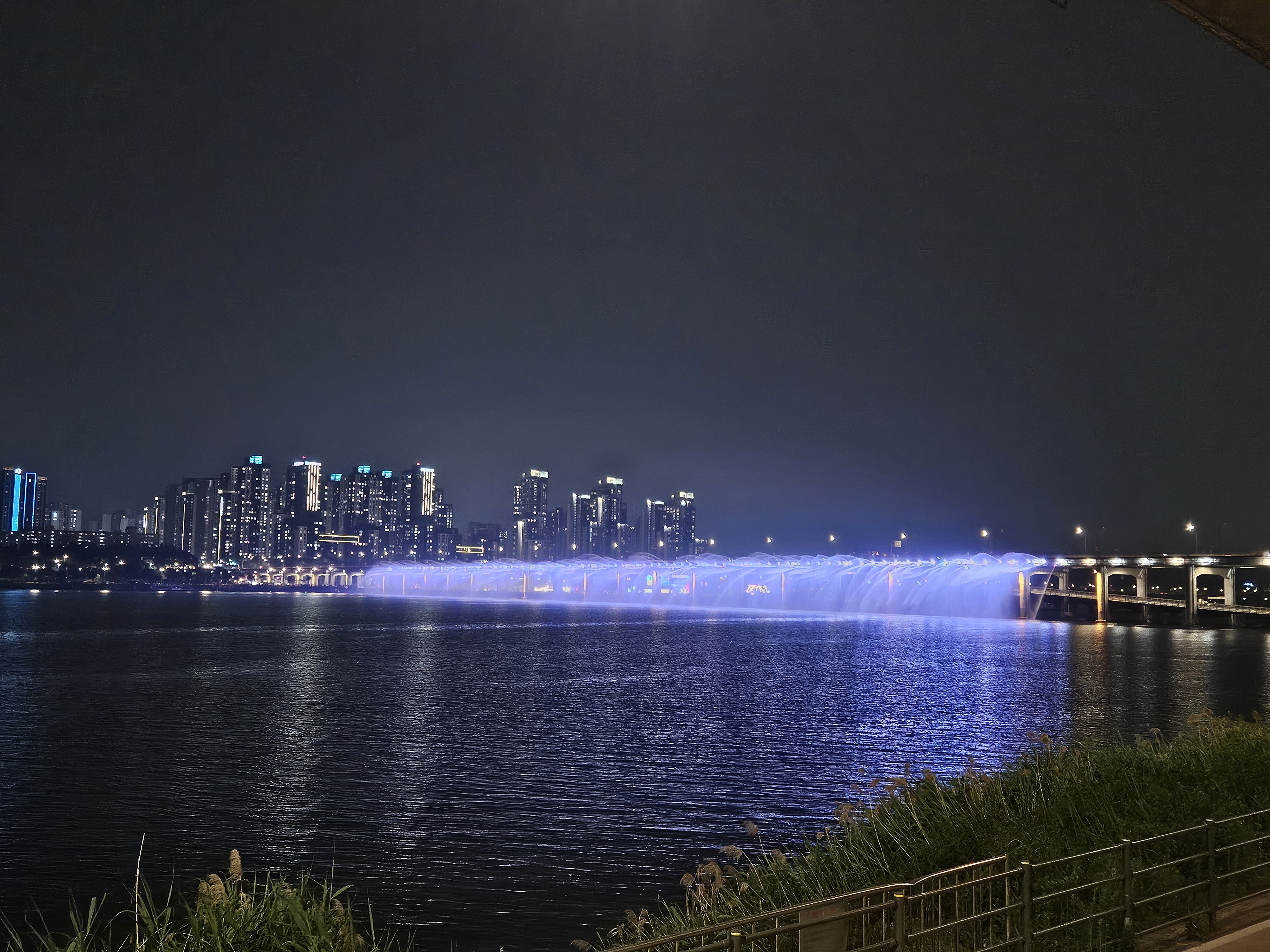 잠수교 북단 동쪽 벤치에 앉아서 바라본 반포대교 달빛무지개분수 모습입니다.