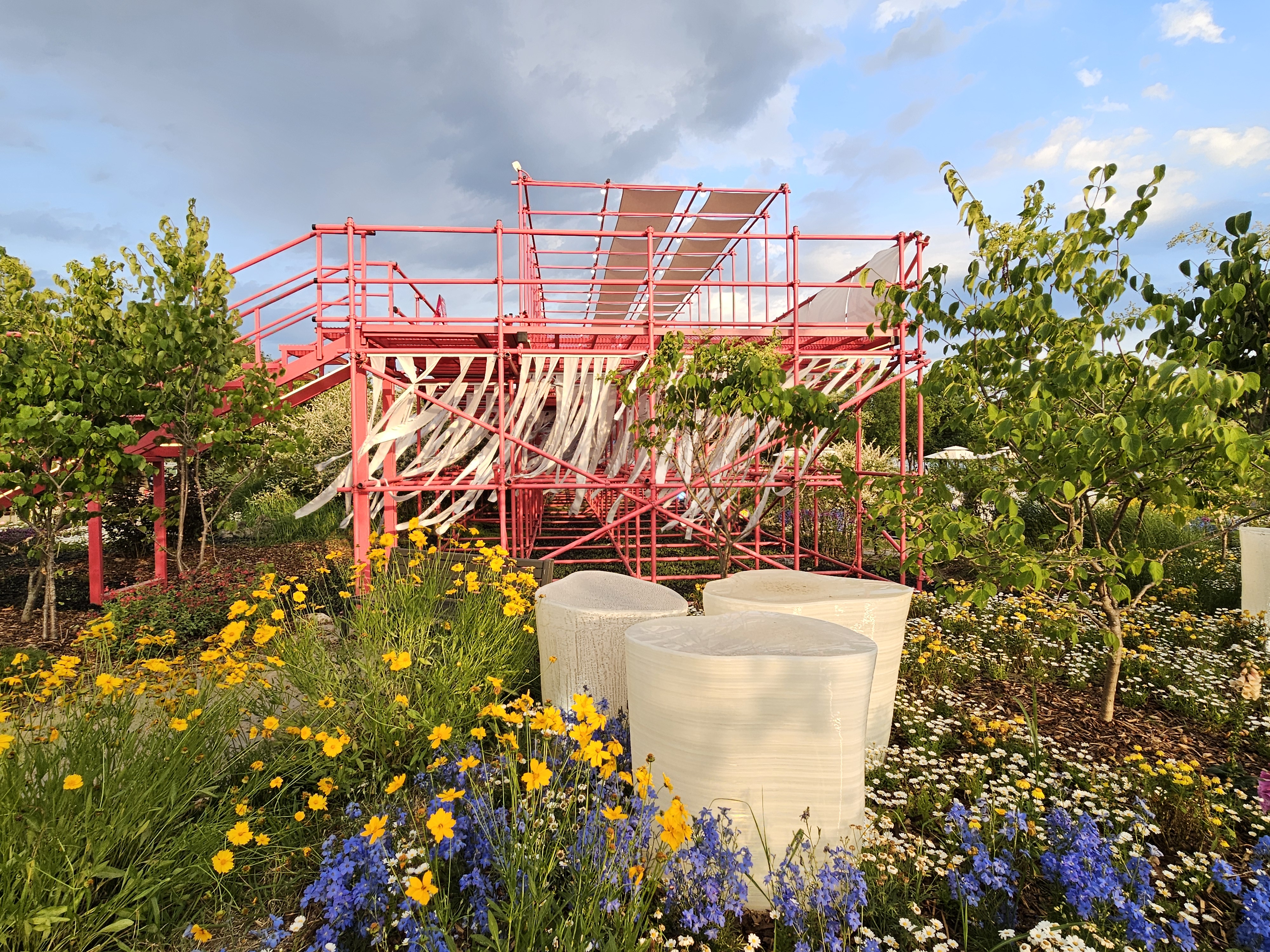 ‘깨비정원’은 젊은 세대의 유쾌함을 담아낸 정원으로, 낮은 언덕을 지그재그로 오르면 노란색의 집 모양이 보이고, 그 안의 골드바 의자에서 사람들은 재미있는 사진을 찍을 수 있습니다.