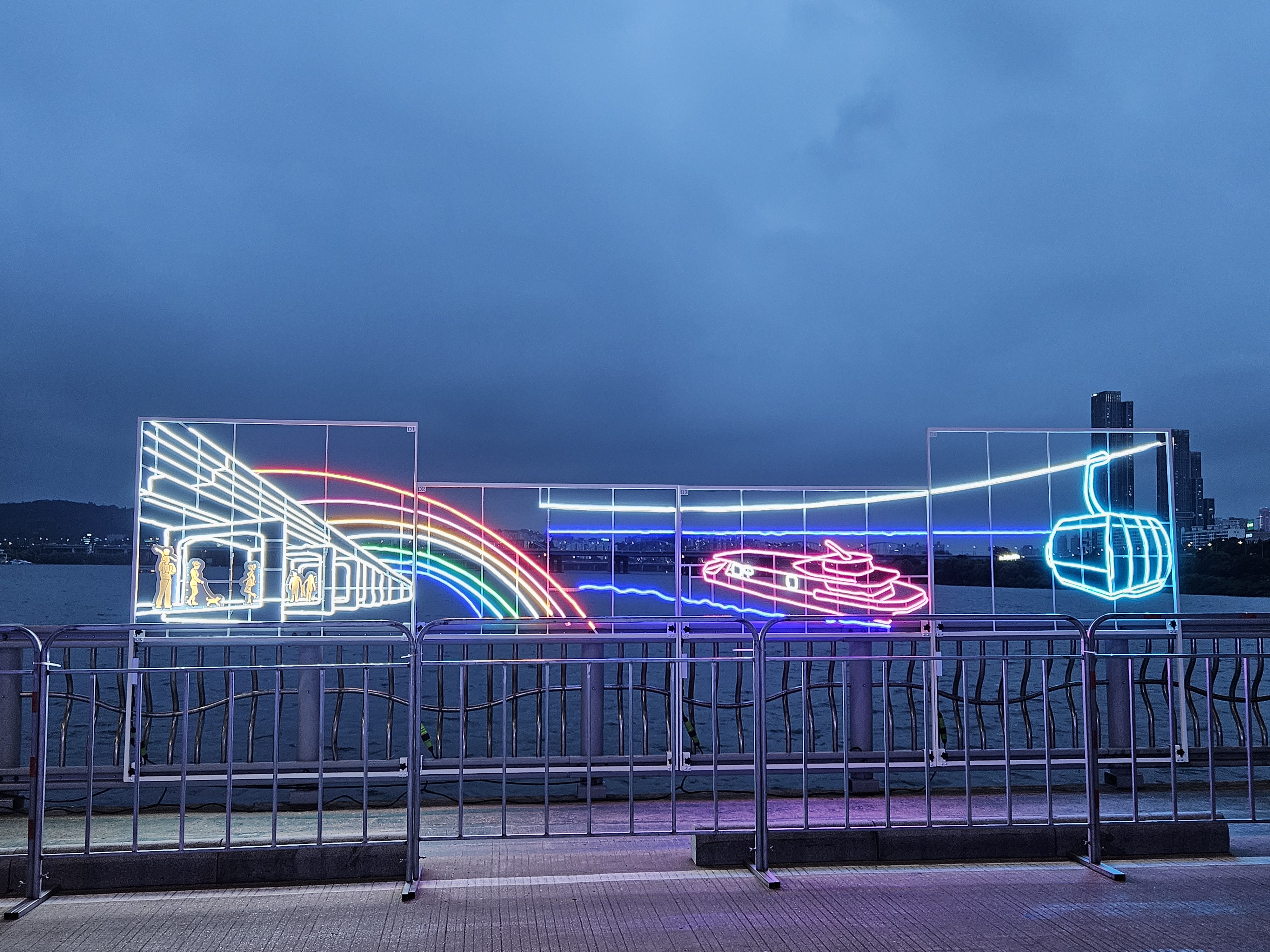 반포대교 달빛무지개분수 모습과 도심 서울의 모습을 표현한 빛 LED입니다.