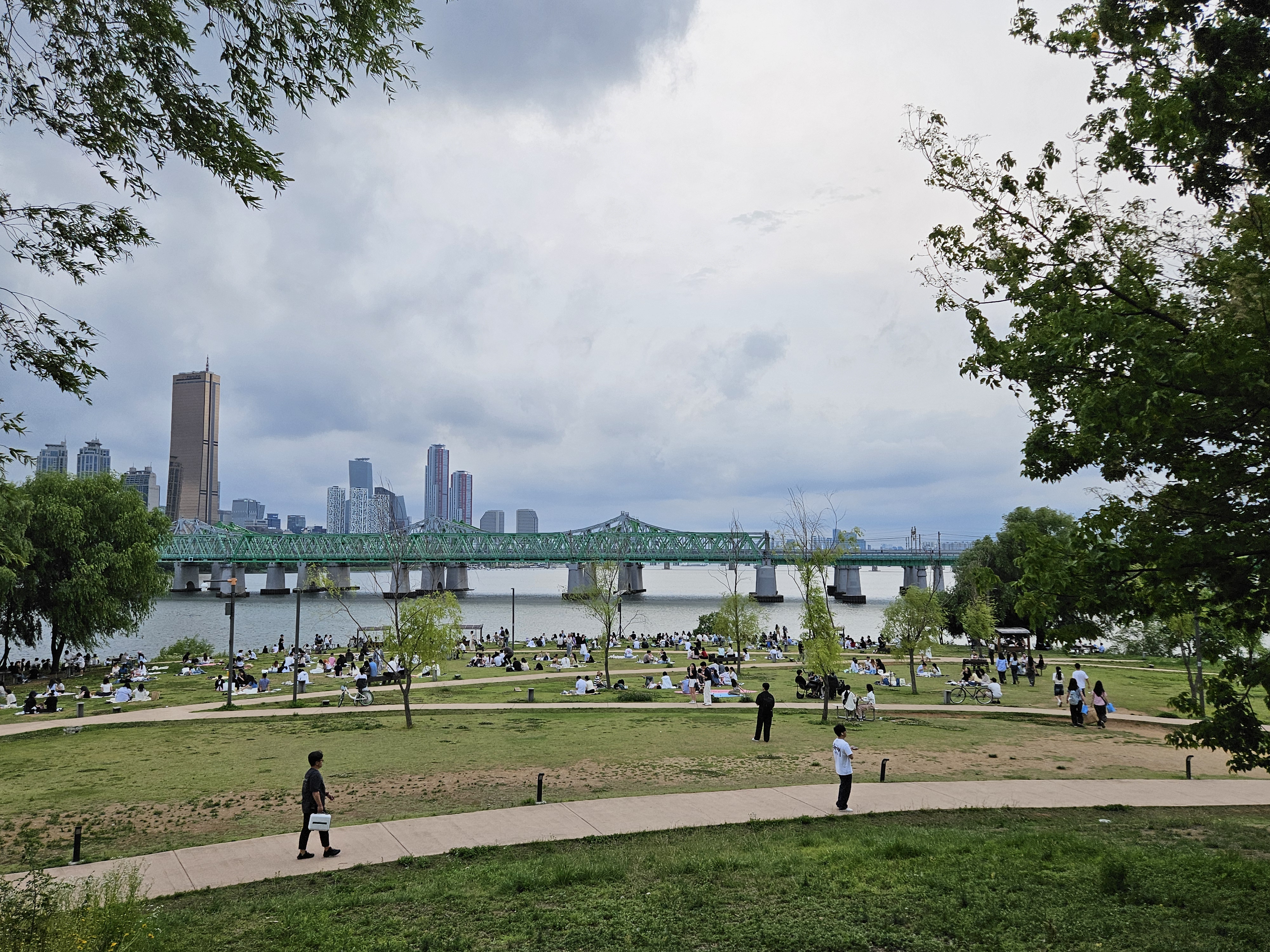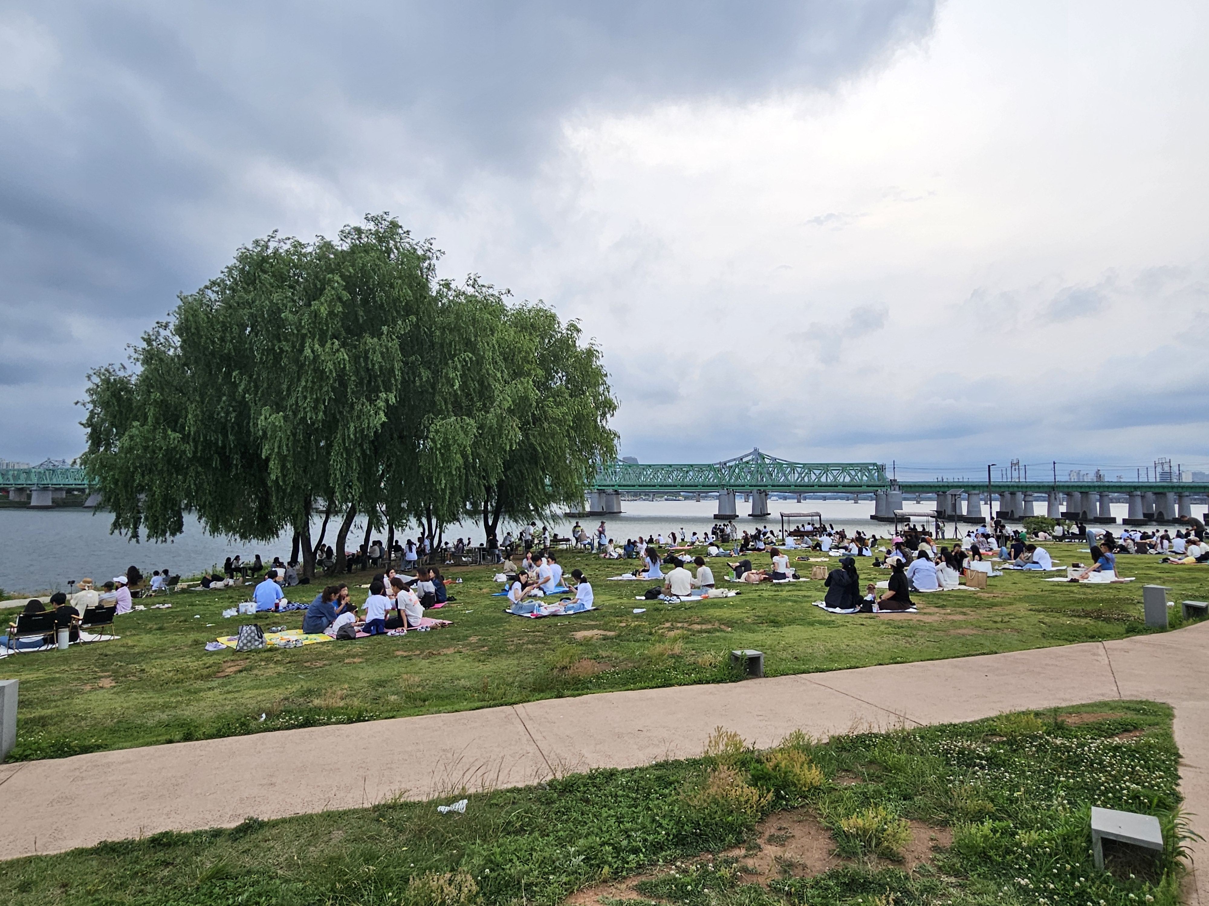 전날에 장마가 시작하더니 이튿날엔 맑아져서 노들섬 서쪽 석양 스폿엔 많은 시민들이 나들이를 나와 있습니다.
