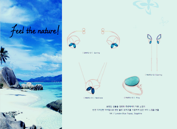 소재는 14K 골드와 실버 925로 제작되며, 자연에서의 페리도트, 차보라이트, 토파즈의 그린계열과 바다에서의 아쿠아마린, 토파즈, 진주 등의 블루계열의 스톤을 사용합니다.