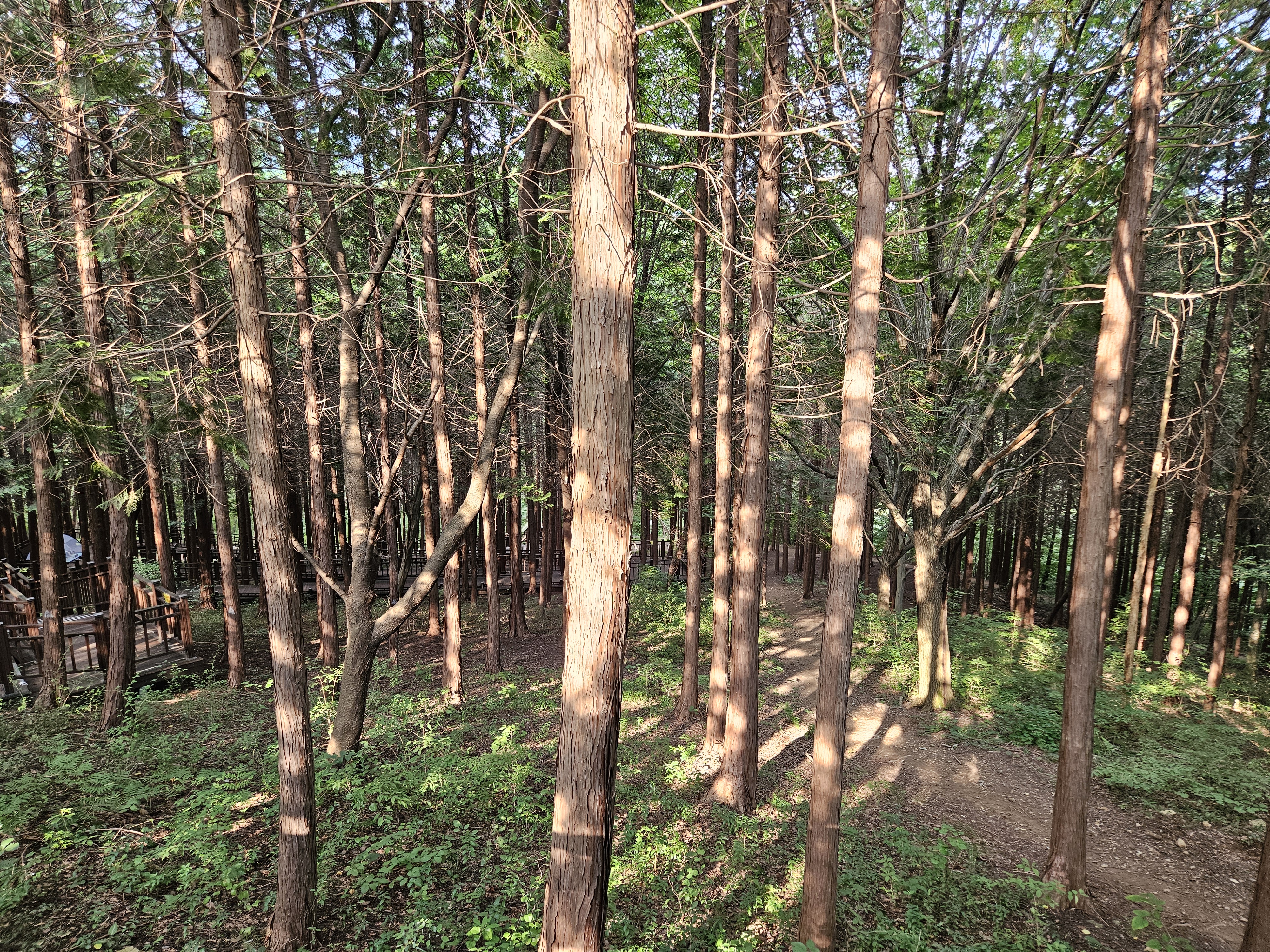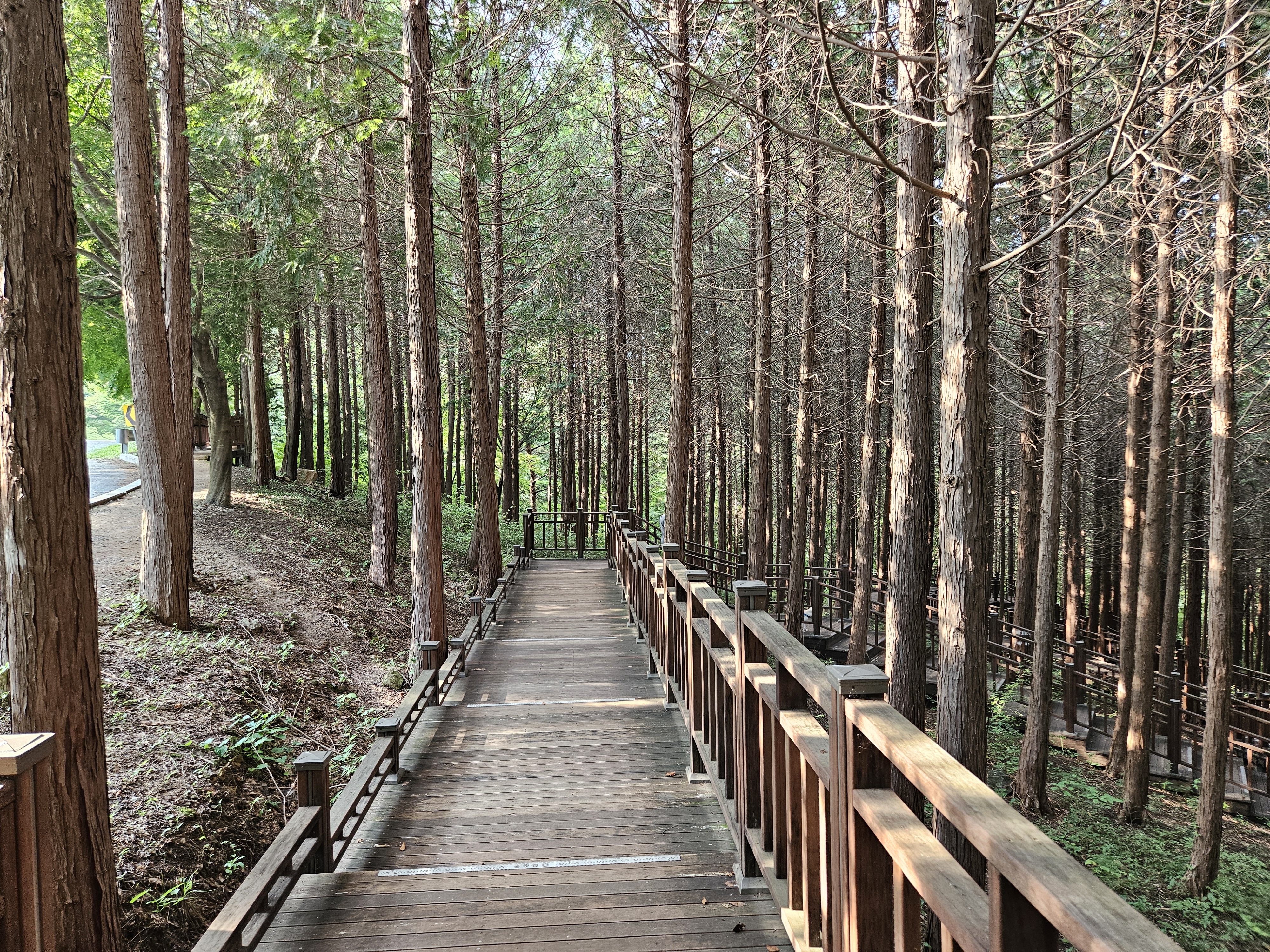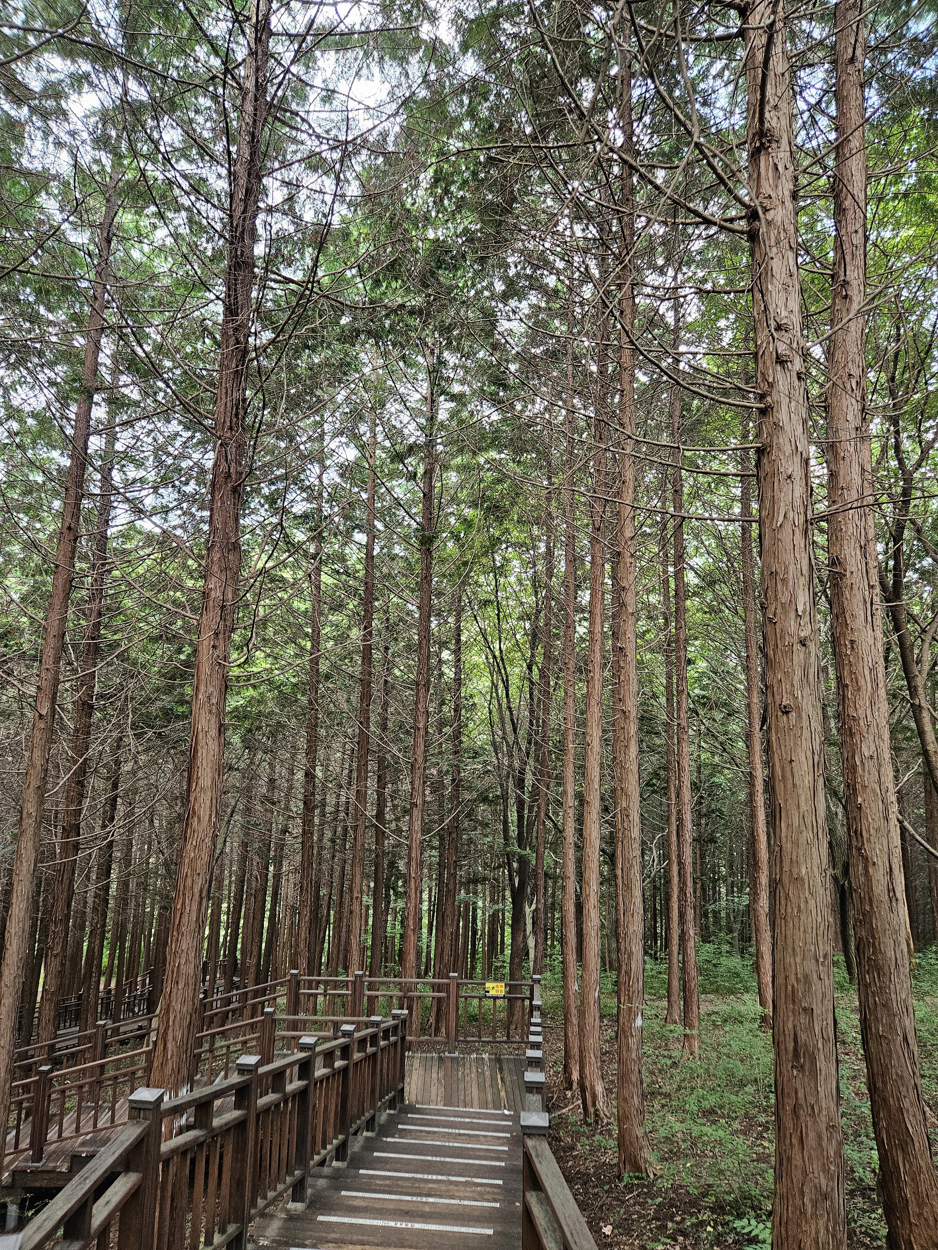 편백나부 사이로 이어지는 나무데크 산책로