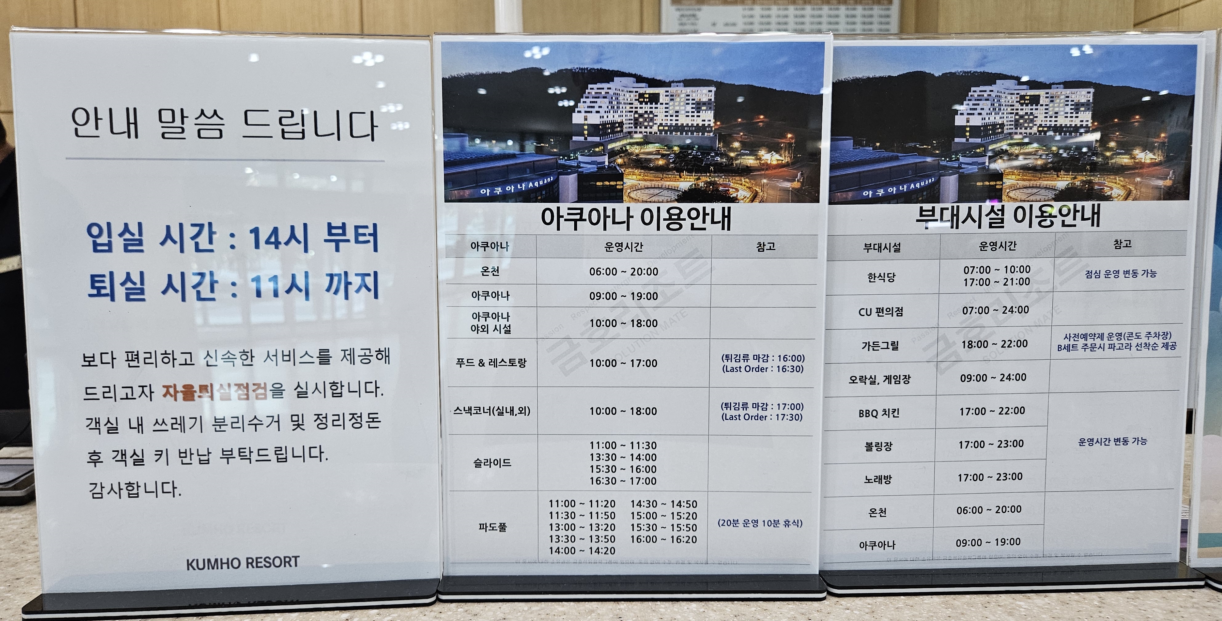 화순 금호리조트에서 운영하는 아쿠아나 이용 정보와 부대시설 이용정보입니다.