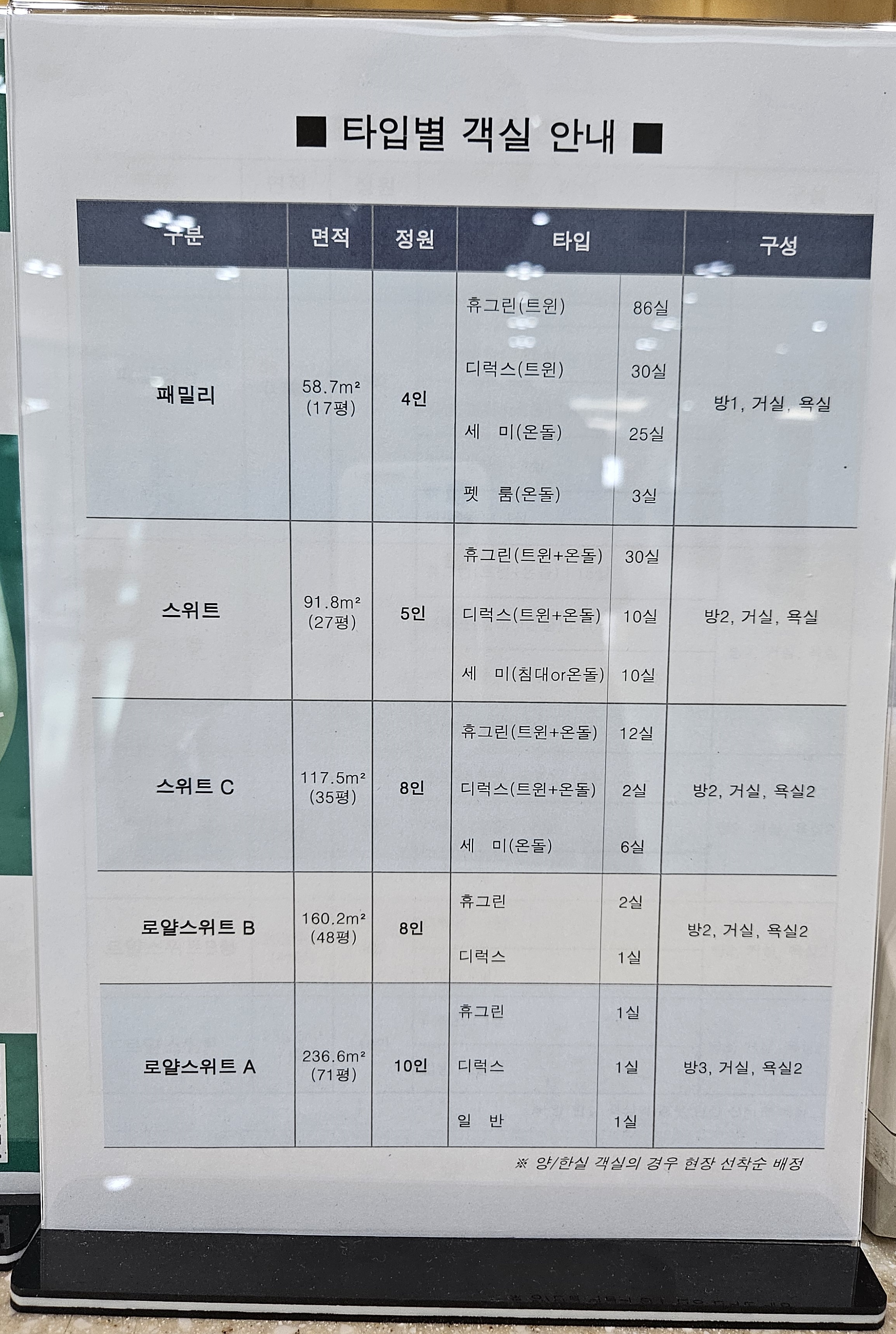 4인 기준의 패밀리형(58.7㎡) 140여실과 5인 기준인 스위트형(91.8㎡) 50실, 8인실인 스위트 C형(117.5㎡) 20실, 로얄 스위트 B형(160㎡) 3실, 10인실로는 로얄 스위트형(236.6㎡) 3실이 있습니다.