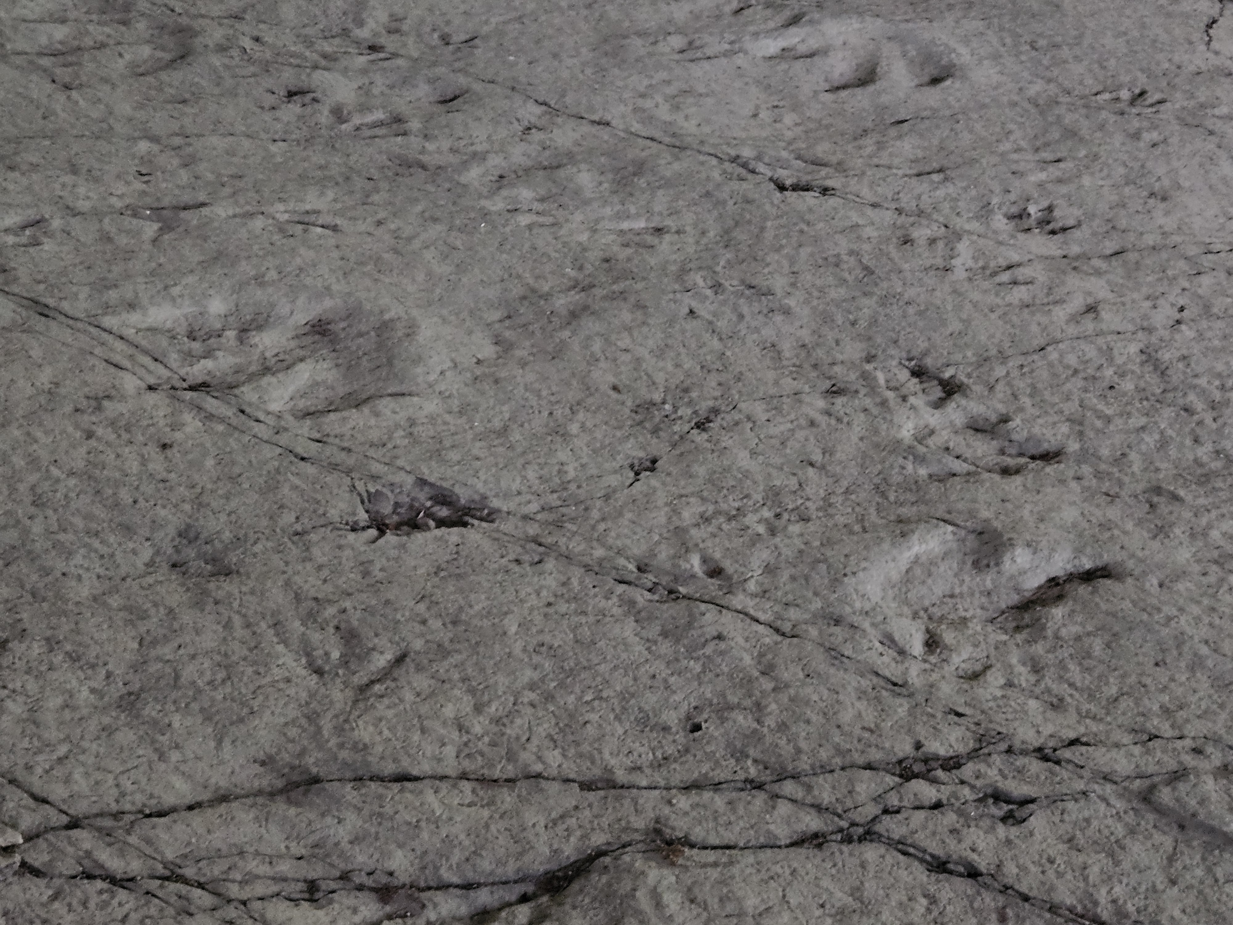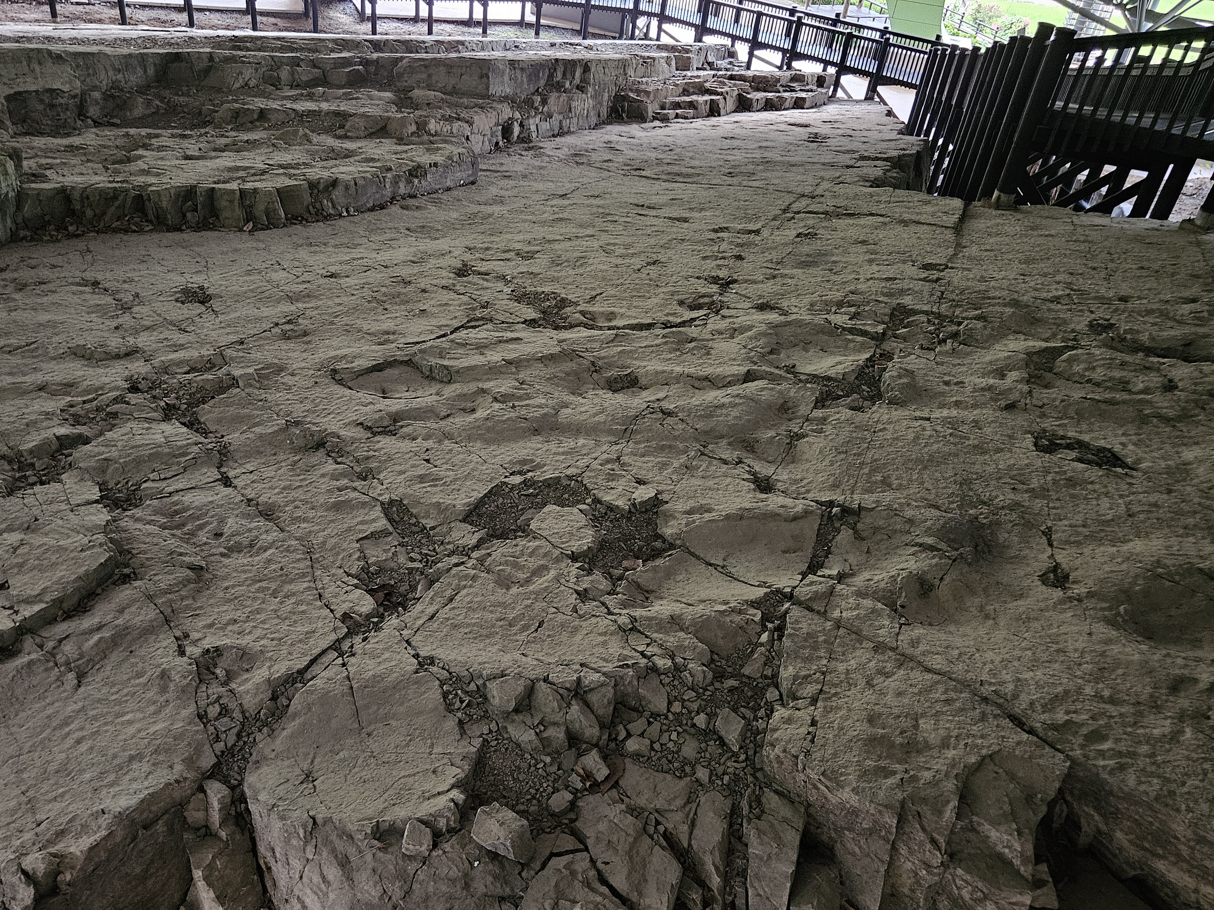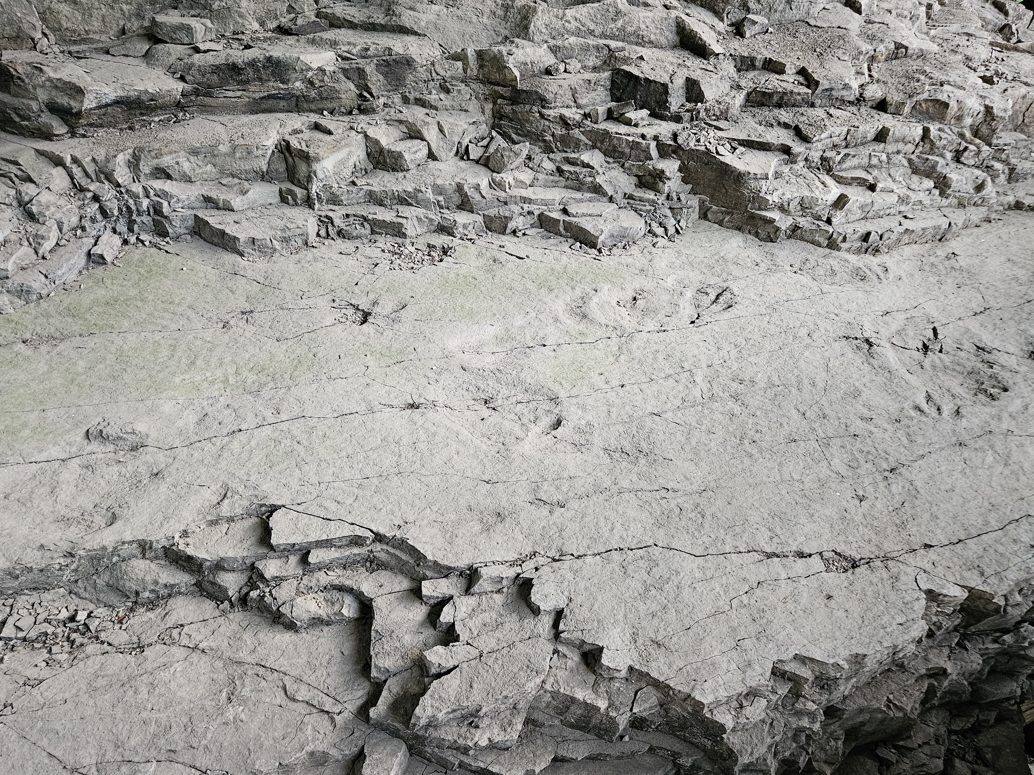 뚜렷한 건열구조 위에 나타난 다양한 공룡발자국을 관찰할 수 있습니다.
