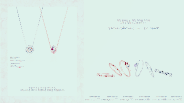 Flower shower 컬렉션의 소프트한 꽃잎의 형태를 모티브로 한 유려한 디자인 세팅인 Petit petal setting과 Vergin road 컬렉션의 깨끗한 라인을 살린 물방울 형태를 모티브로 디자인 세팅한 Polka setting을 하게 됩니다.