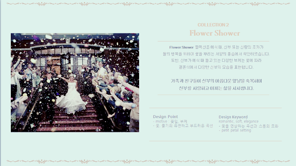 Flower Shower컬렉션은 예식 때 신랑, 신부의 조카가 둘의 행복을 위하여 꽃을 뿌리는 서양의 풍습을 착안한 것이며, 다양한 색의 부케에 따른 다양한 신부의 모습을 표현했습니다.