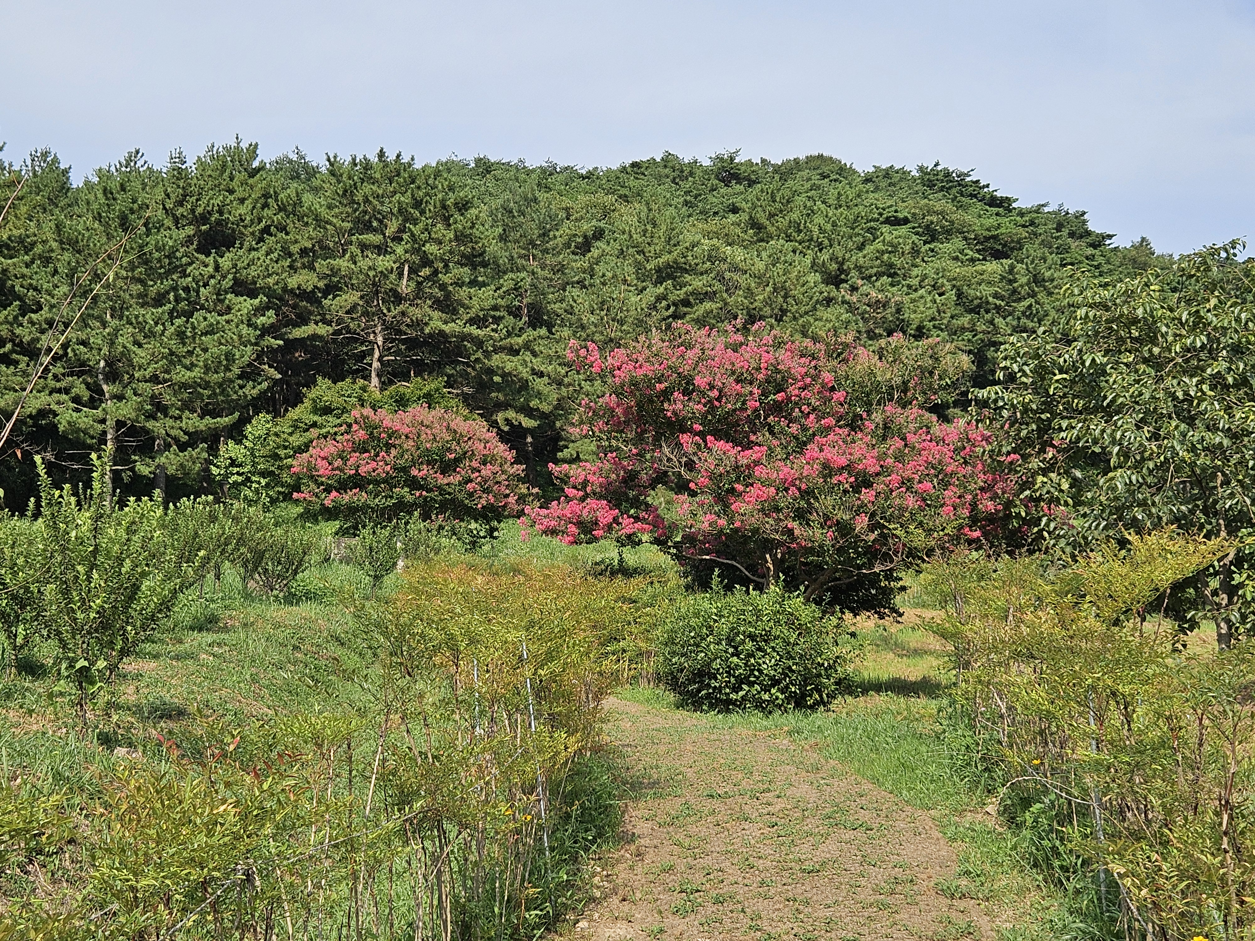 화순 고인돌유적지로 가는 길목에 붉은 배롱나무꽃이 활짝 피어 있습니다.