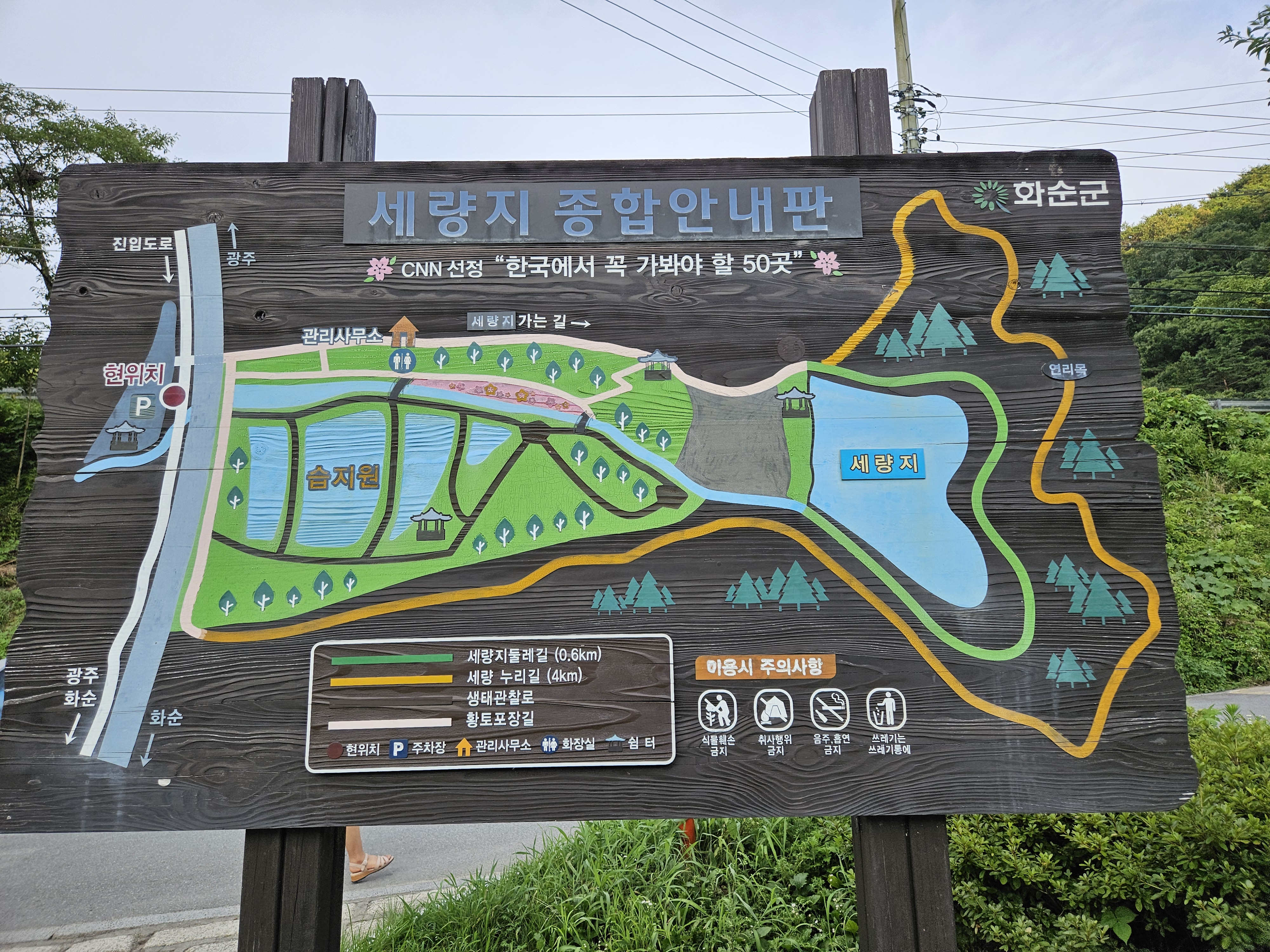 주차장에서 세량지 주변을 크게 도는 탐방로는 세량누리길로 4km이며, 1시간 30분 정도 소요될 것 같네요.