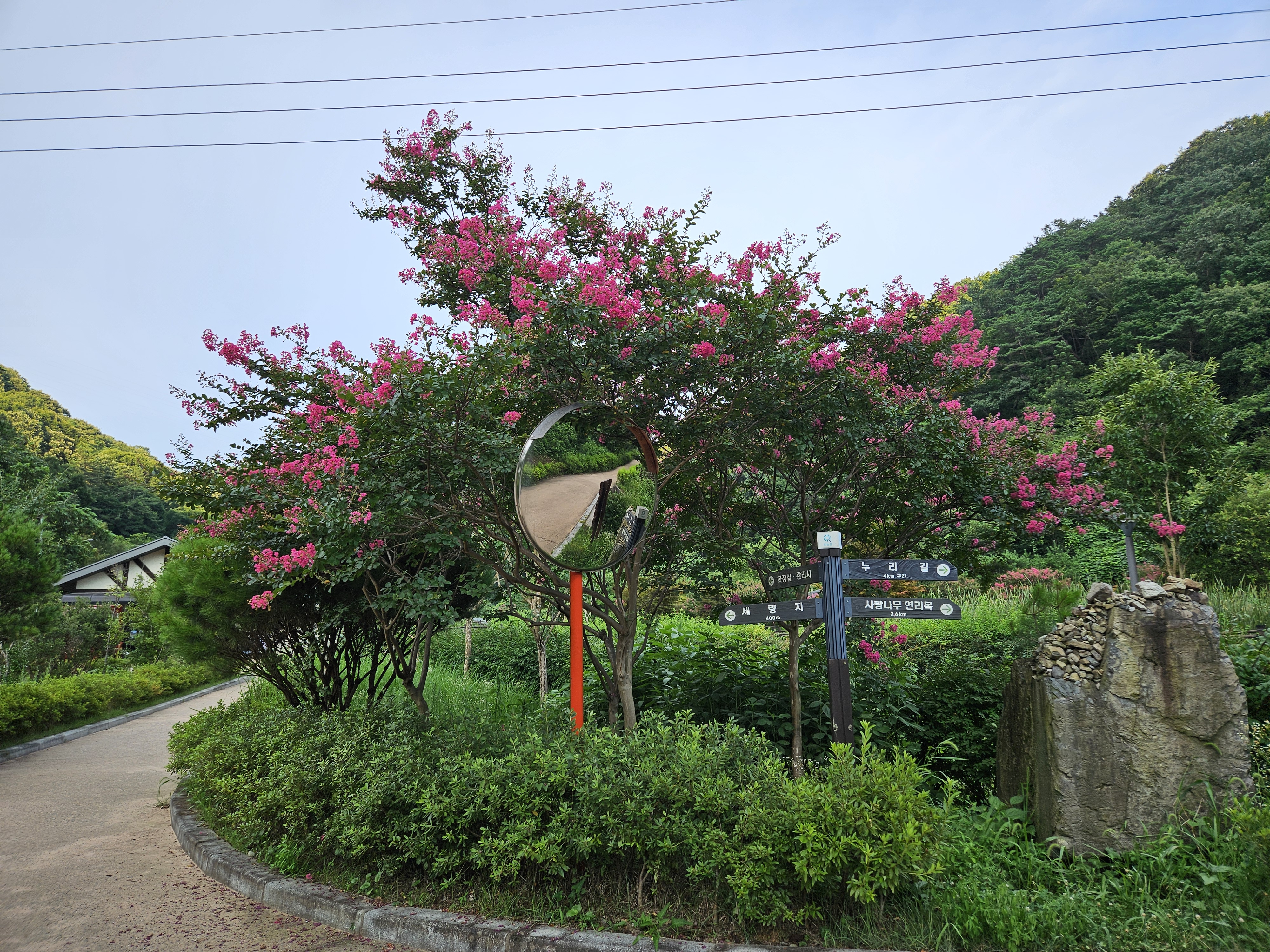 세량지 입구에 배롱나무꽃이 예쁘게 피어 있습니다.