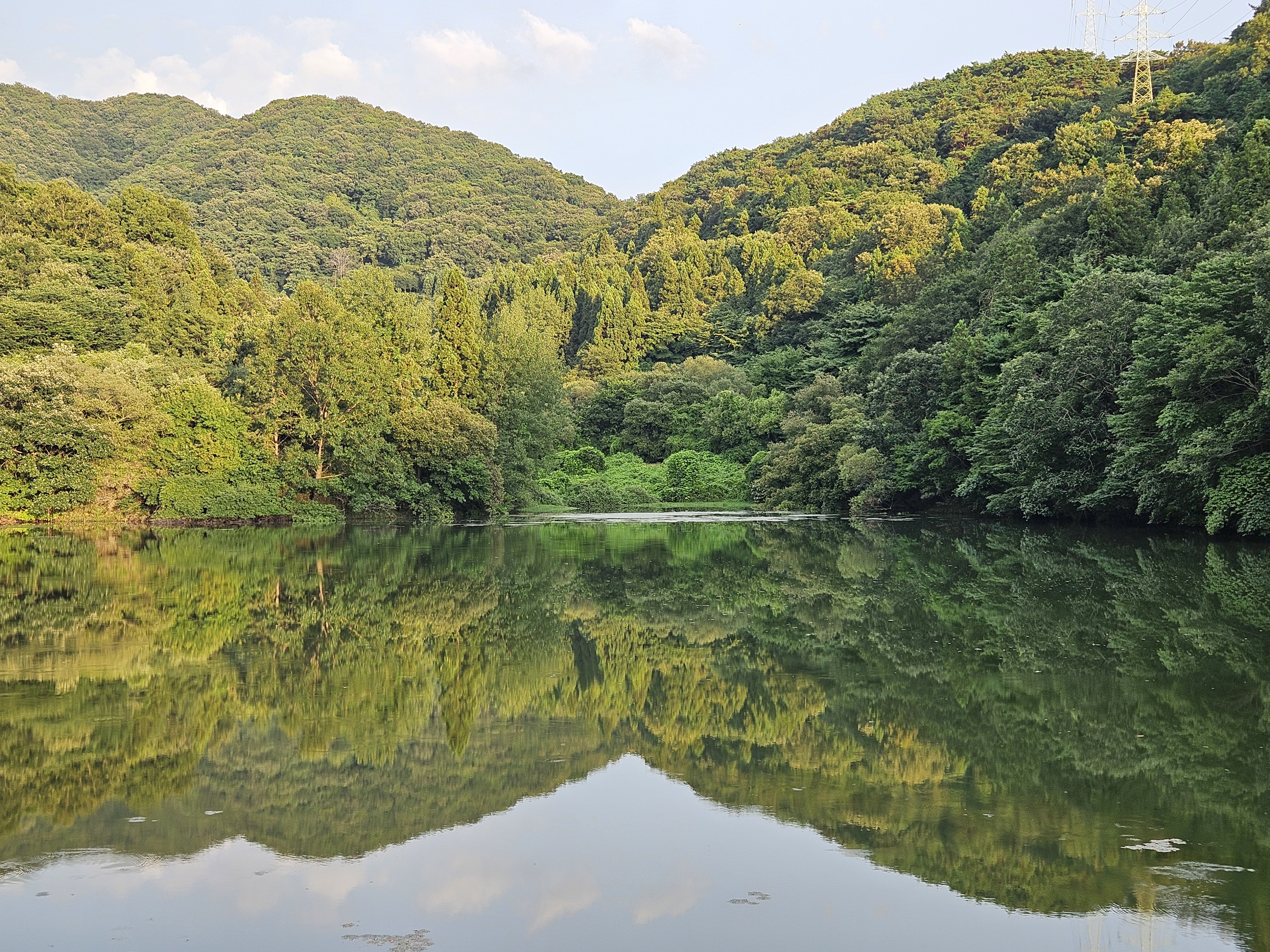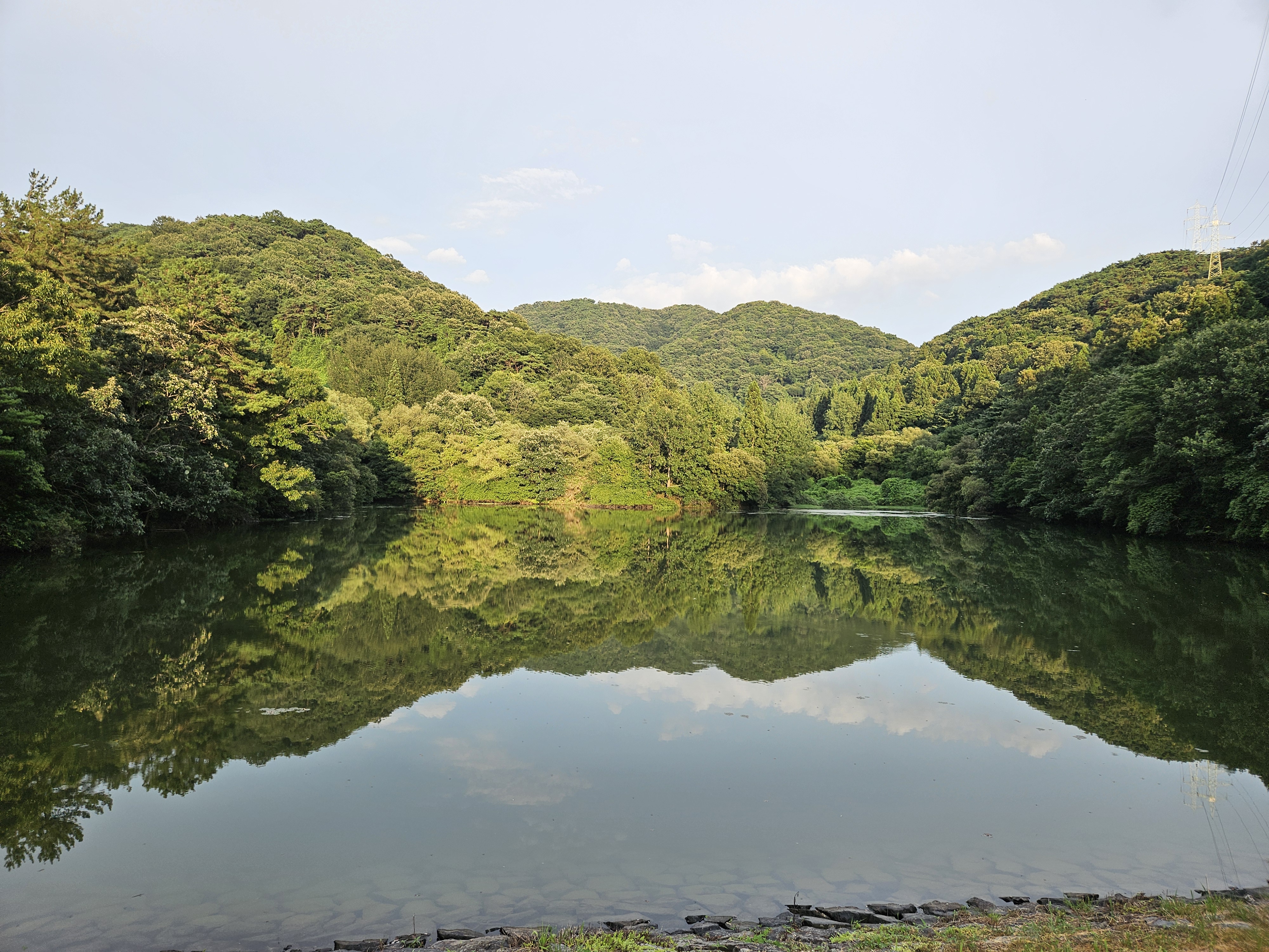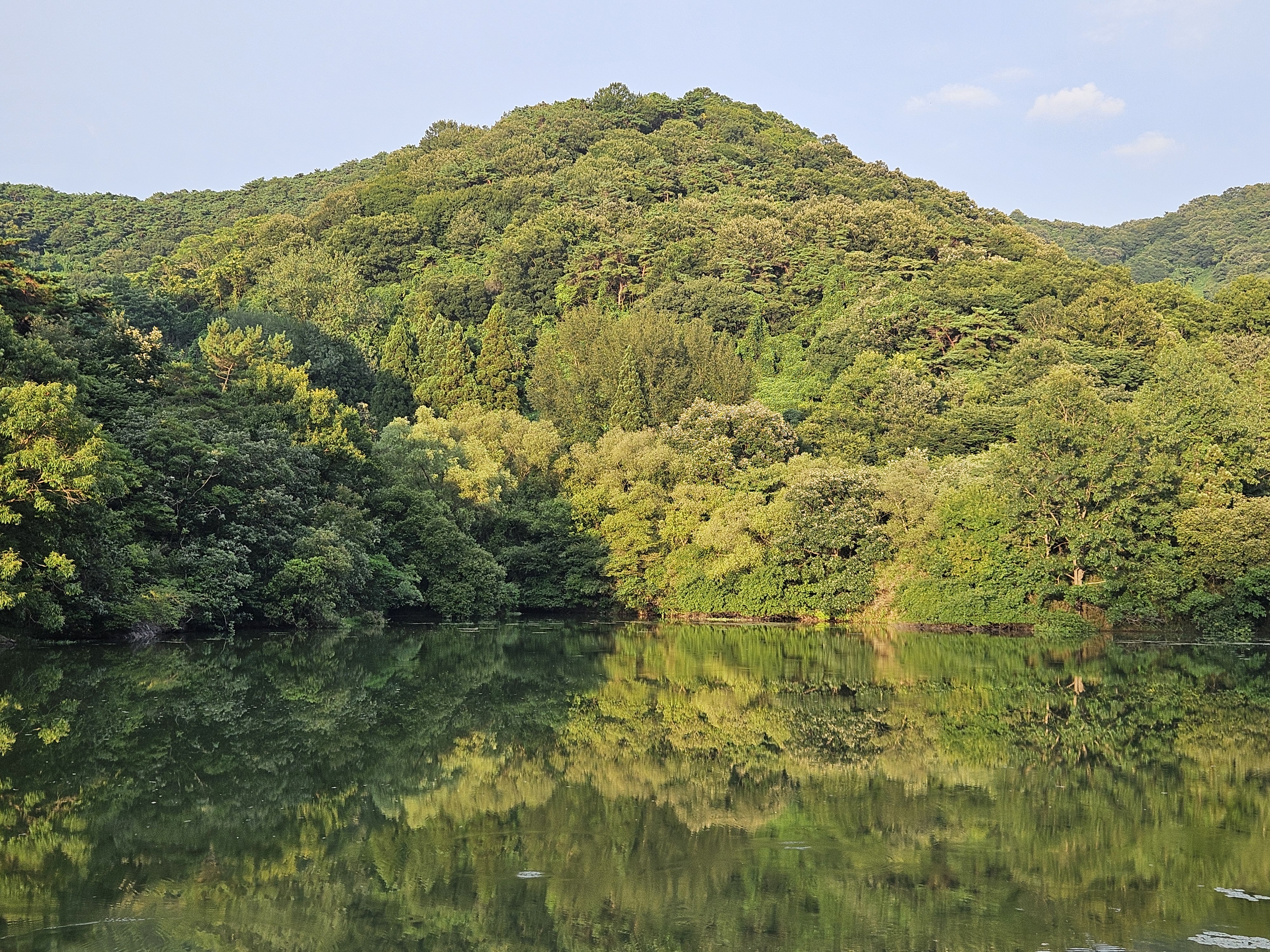 여름의 신록이 호수에 그대로 투영되는 모습이네요.
