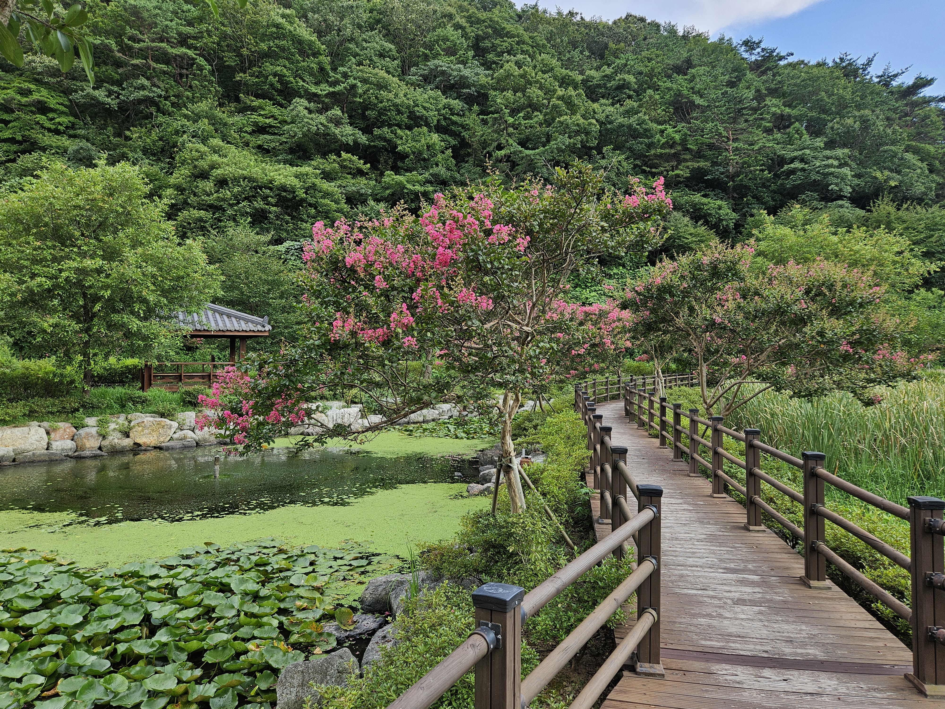 습지에는 연이 심어져 있고, 지상엔 배롱나무꽃이 반겨줍니다.