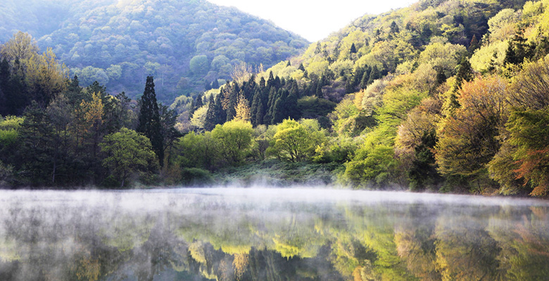 봄이면 연분홍빛으로 피어나는 산벚꽃과 초록의 나무들이 수면 위에 그대로 투영되는데, 햇살이 비칠 무렵 피어오르는 물안개와 어우러져 이국적 풍광을 빚어낸다고 합니다.