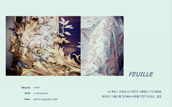 Feuille 컬렉션은 18세기 프랑스 건축양식의 특징인 식물들의 곡선형태와 화려하고 아름다운 장식에서 비롯된 자연주의 감성을 표현합니다.