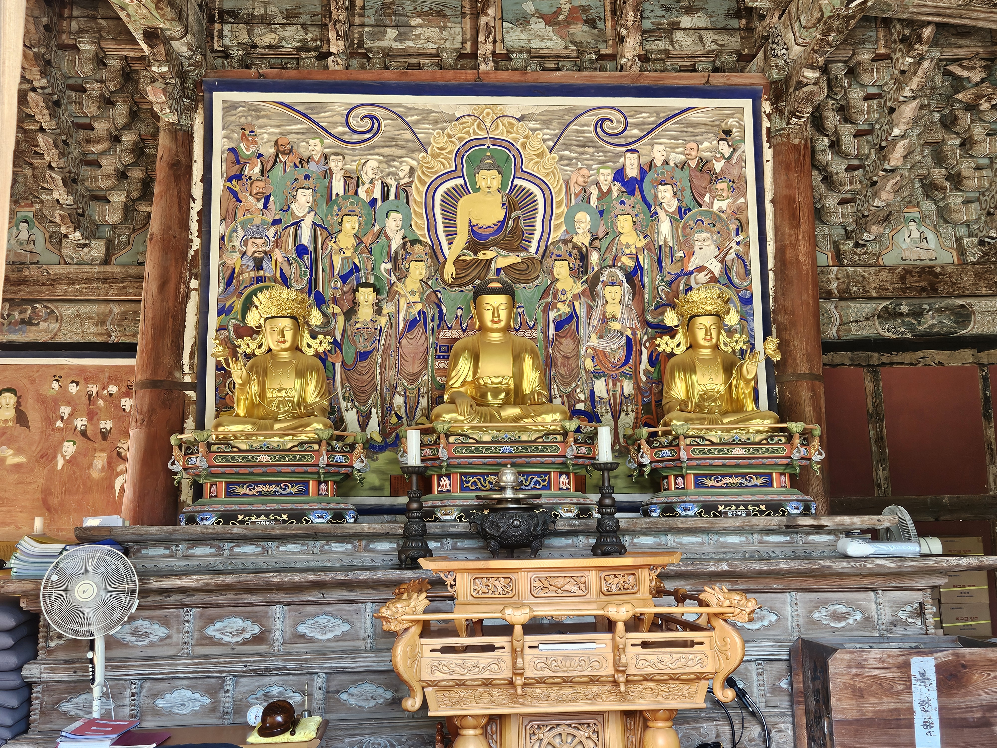 석가모니불을 중심으로 좌우 앞쪽에 문수보살과 보현보살이, 뒤쪽 좌우에는 관음보살과 대세지보살 및 다보여래, 아미타여래 등이 모두 석가모니를 향하여 시립하고 있습니다.