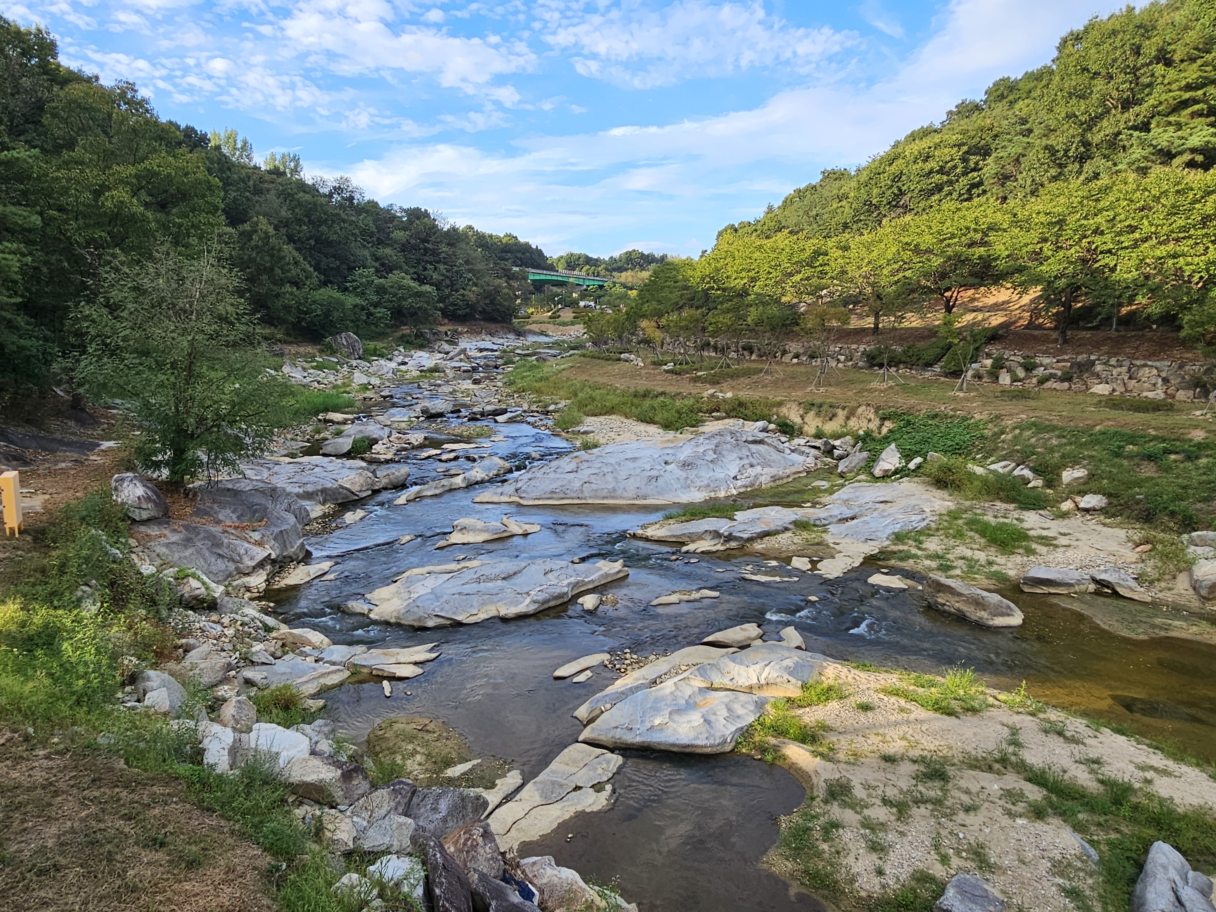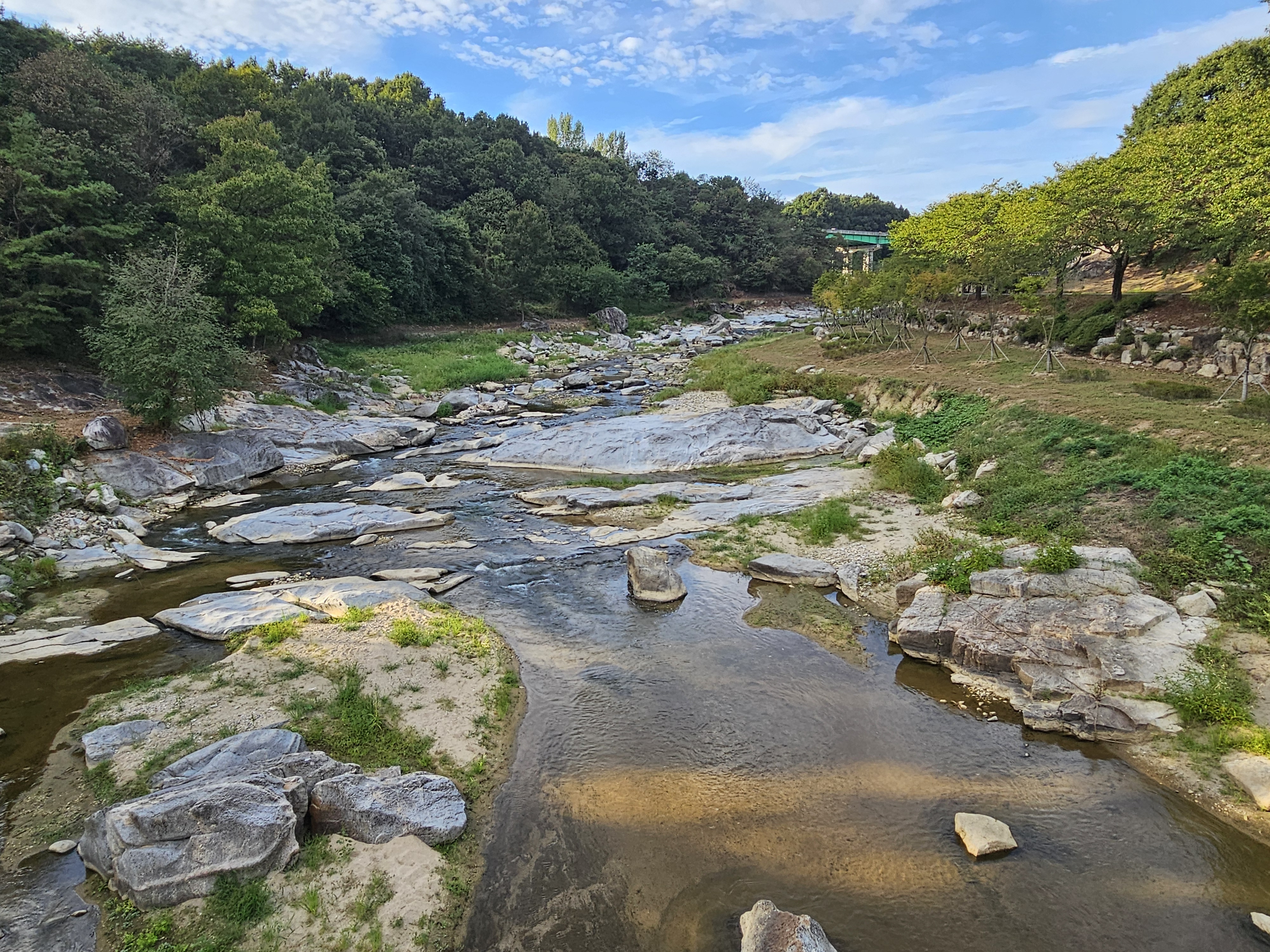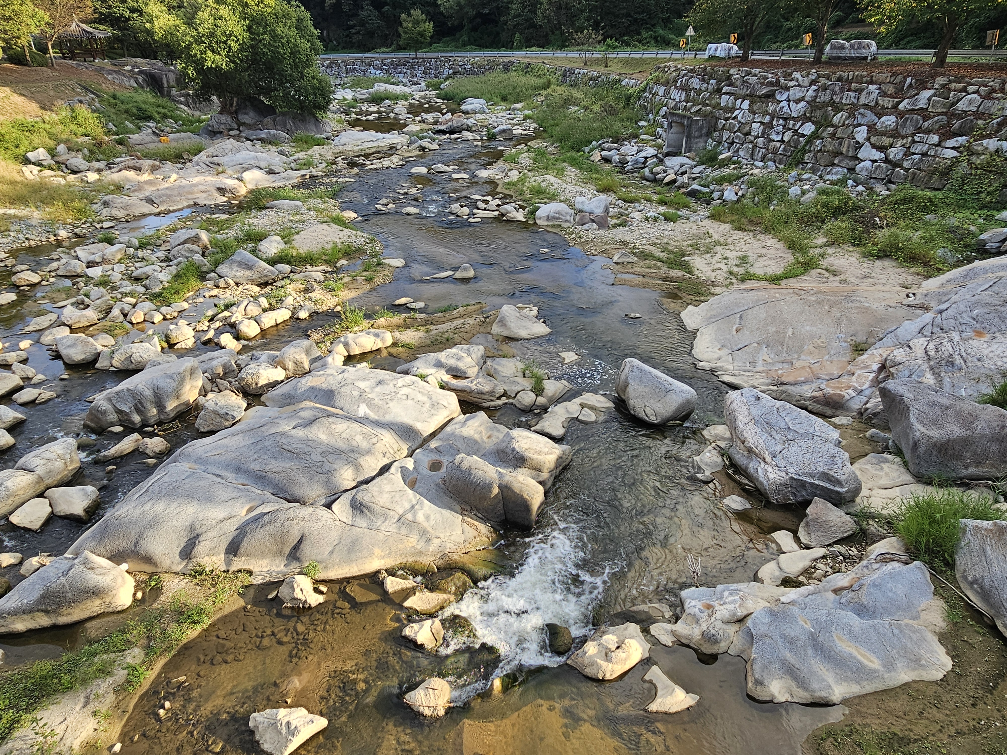 멀리 수락대가 보이고, 그 일대 하천의 암석들이 멋스럽게 보이는 풍경입니다.