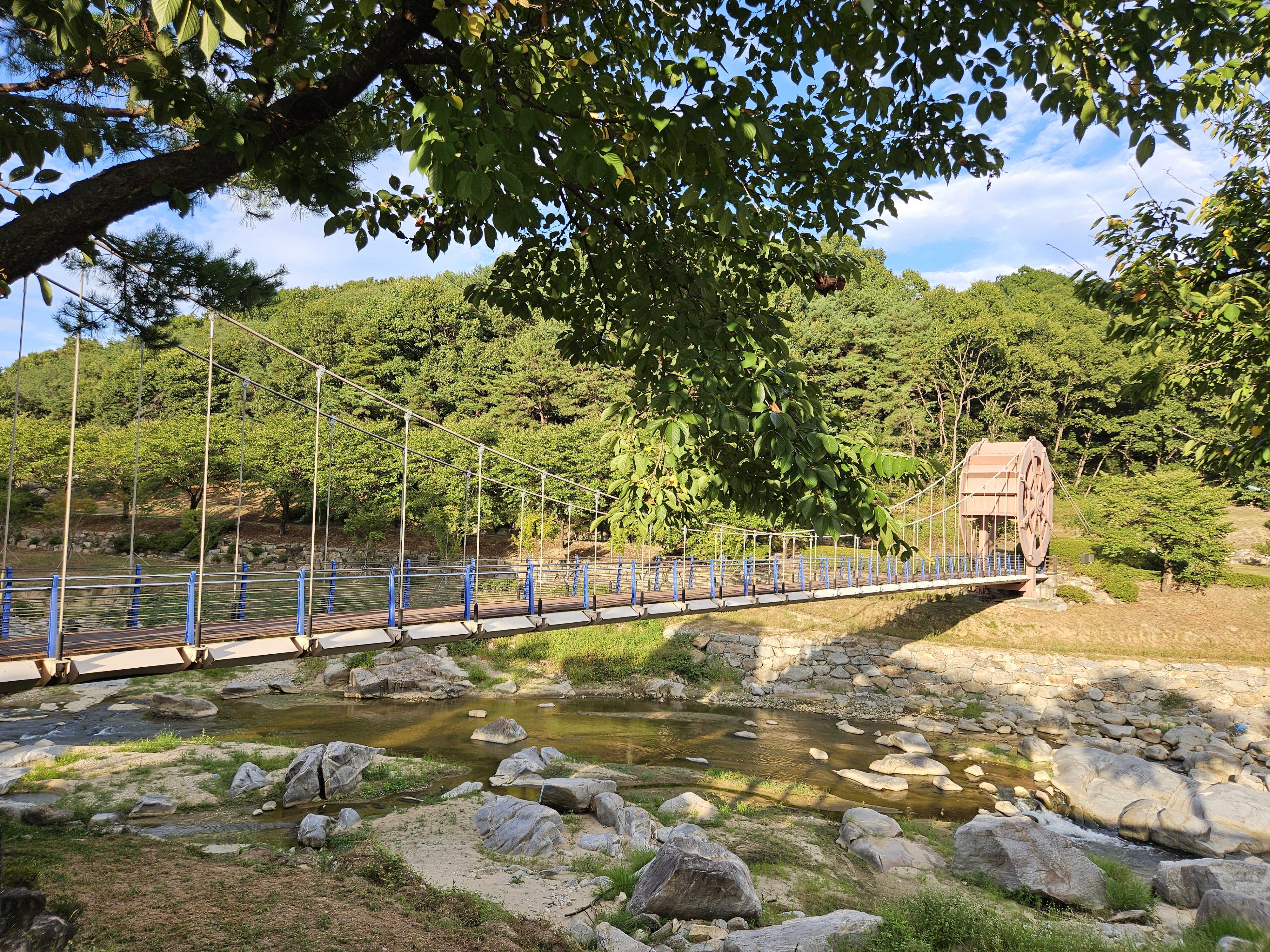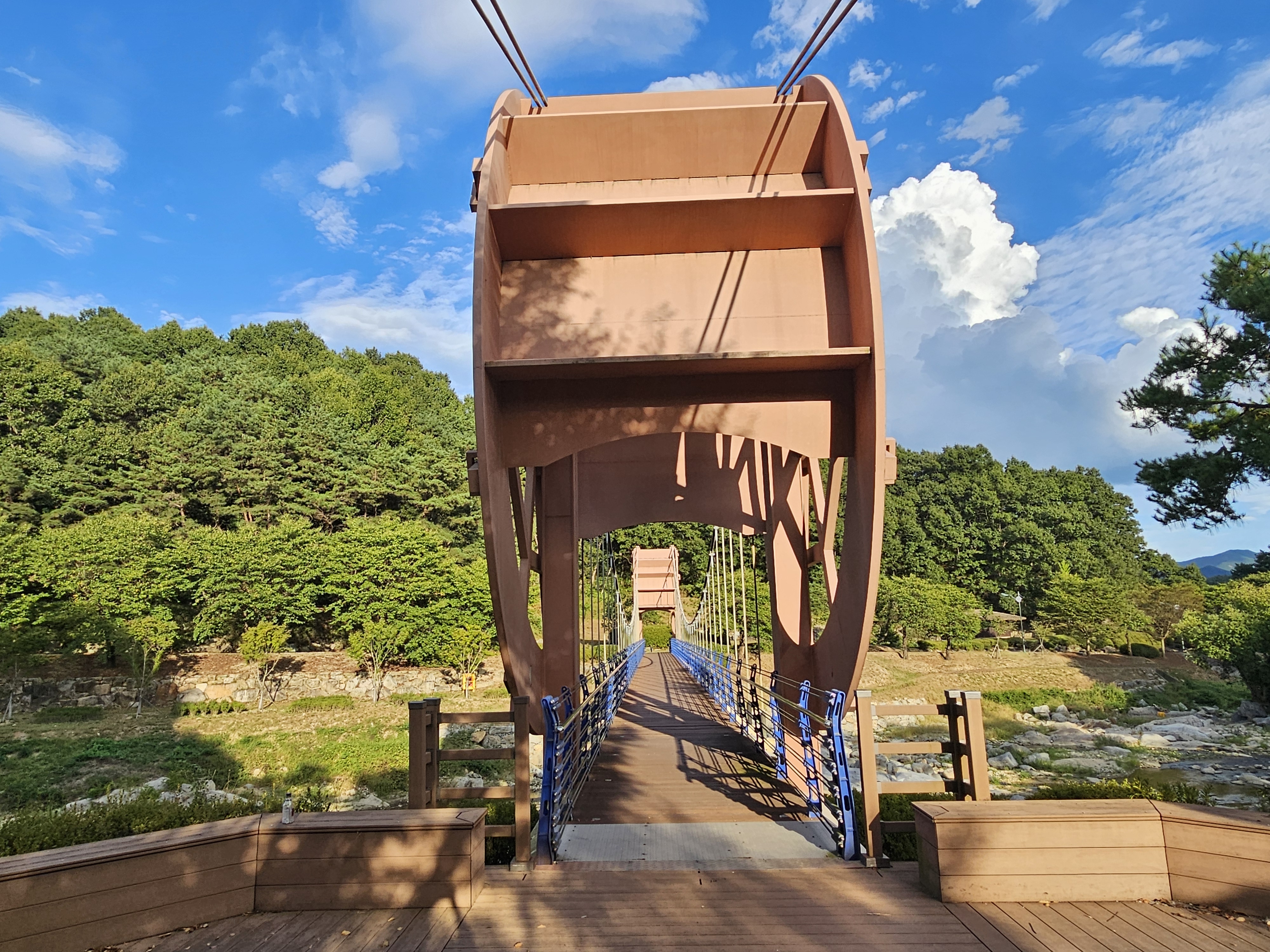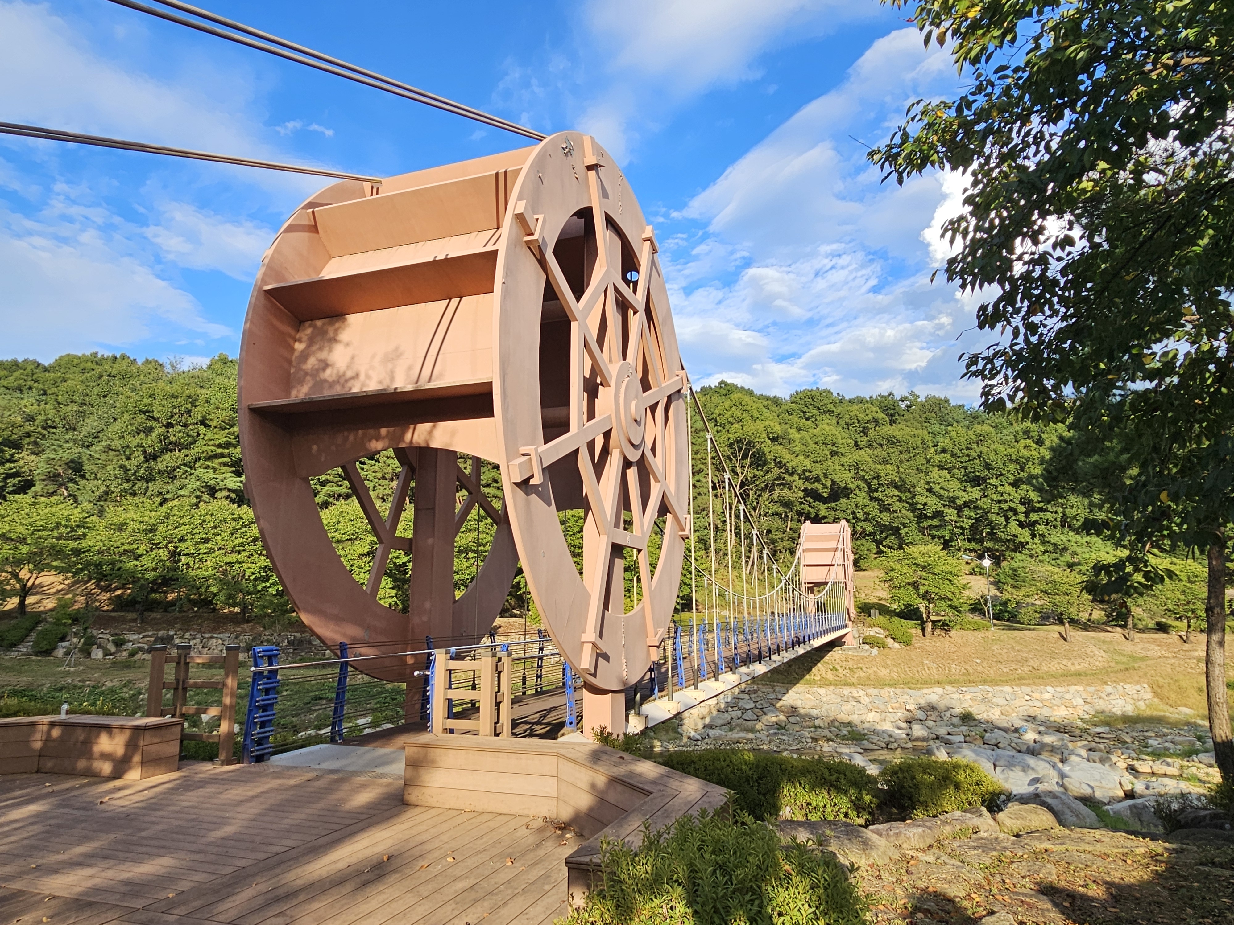 출렁다리 양쪽 조형물은 물레방아를 모티브로 만든 것 같습니다.