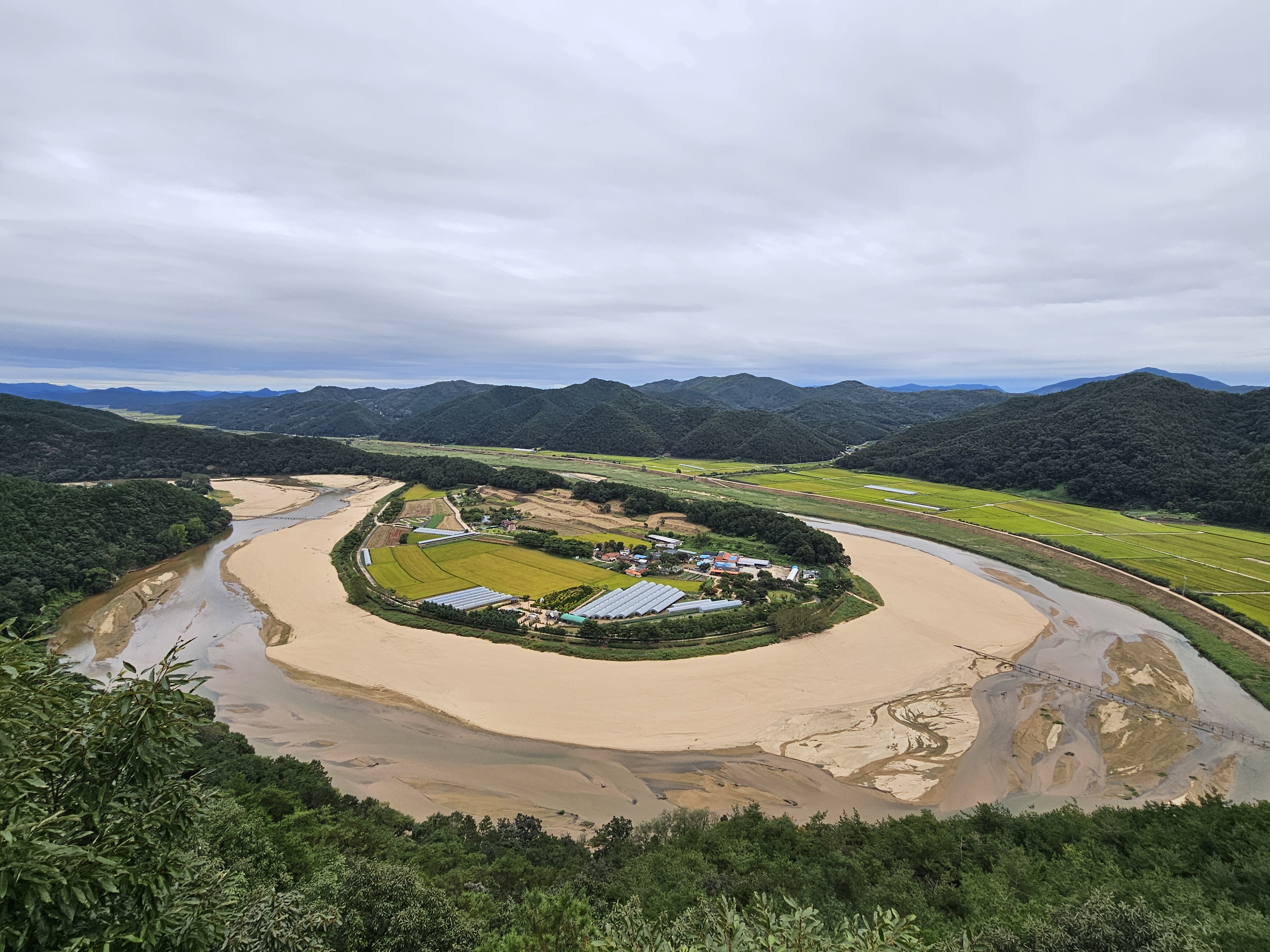 하얀 모래 백사장을 감싸며 돌아가는 물길, 주변을 둘러싼 가파른 산, 강 위에 뜬 것 같은 아름다운 마을 풍경이 어우러져 비경을 만들고 있는 곳입니다.