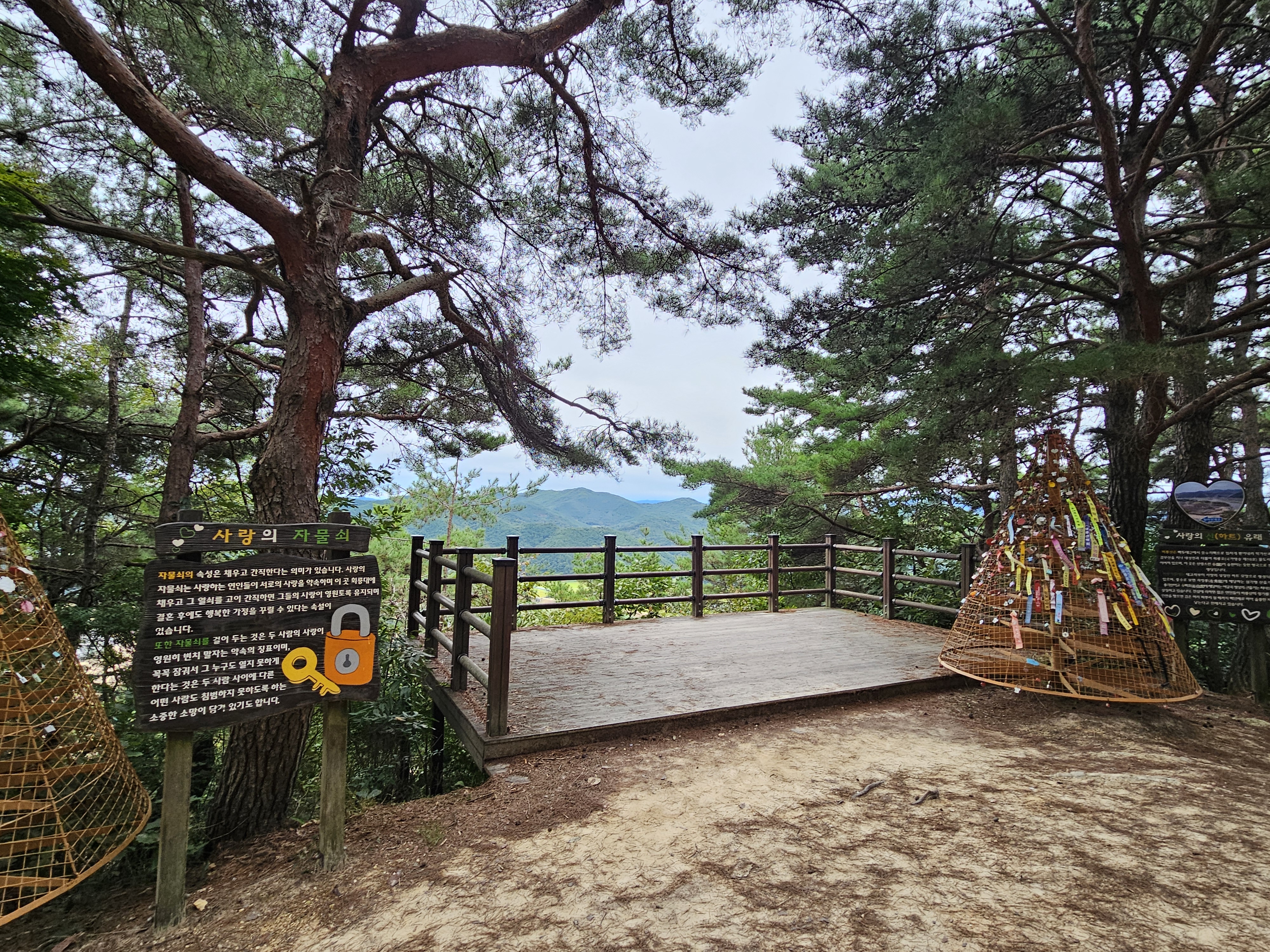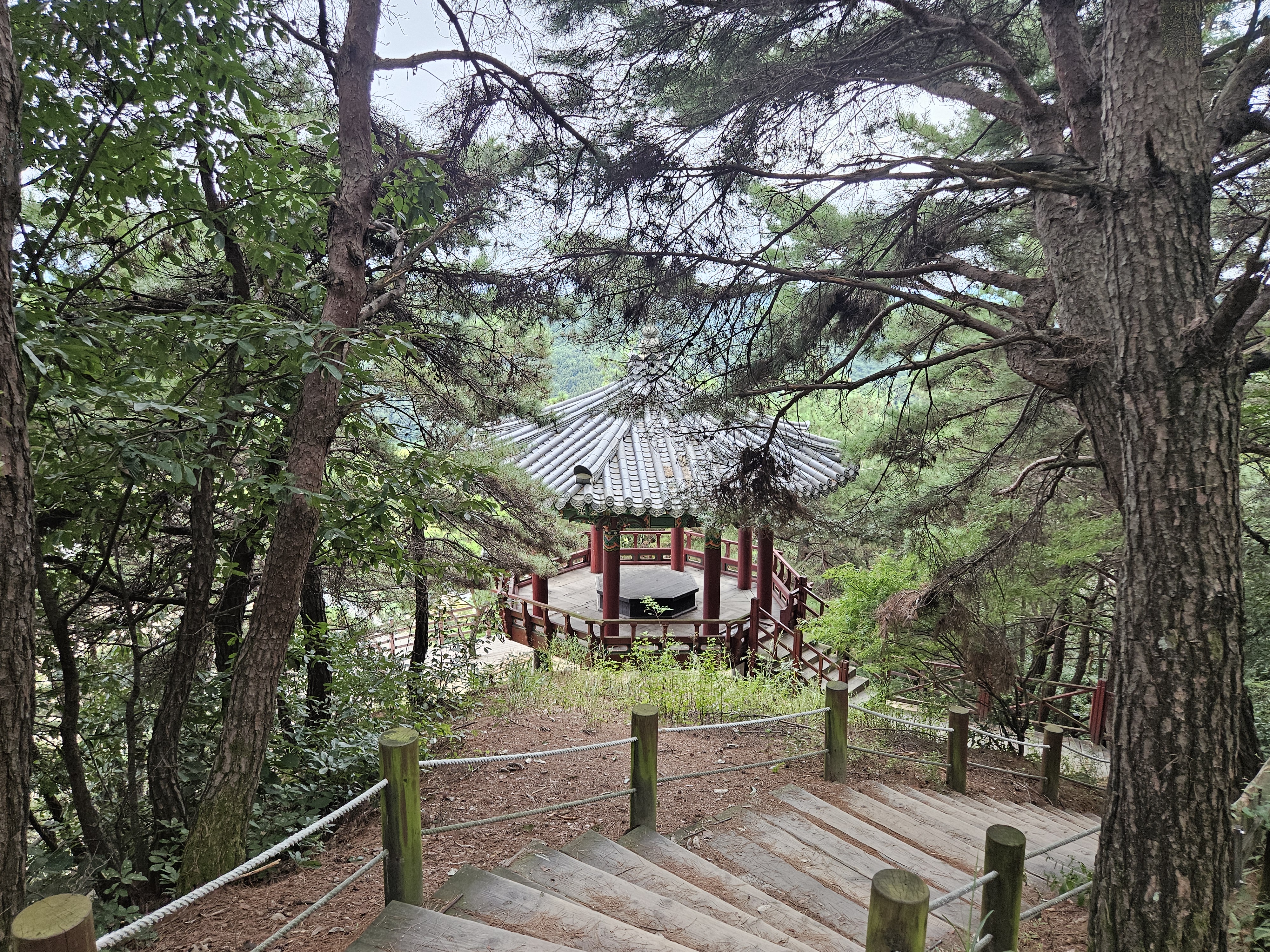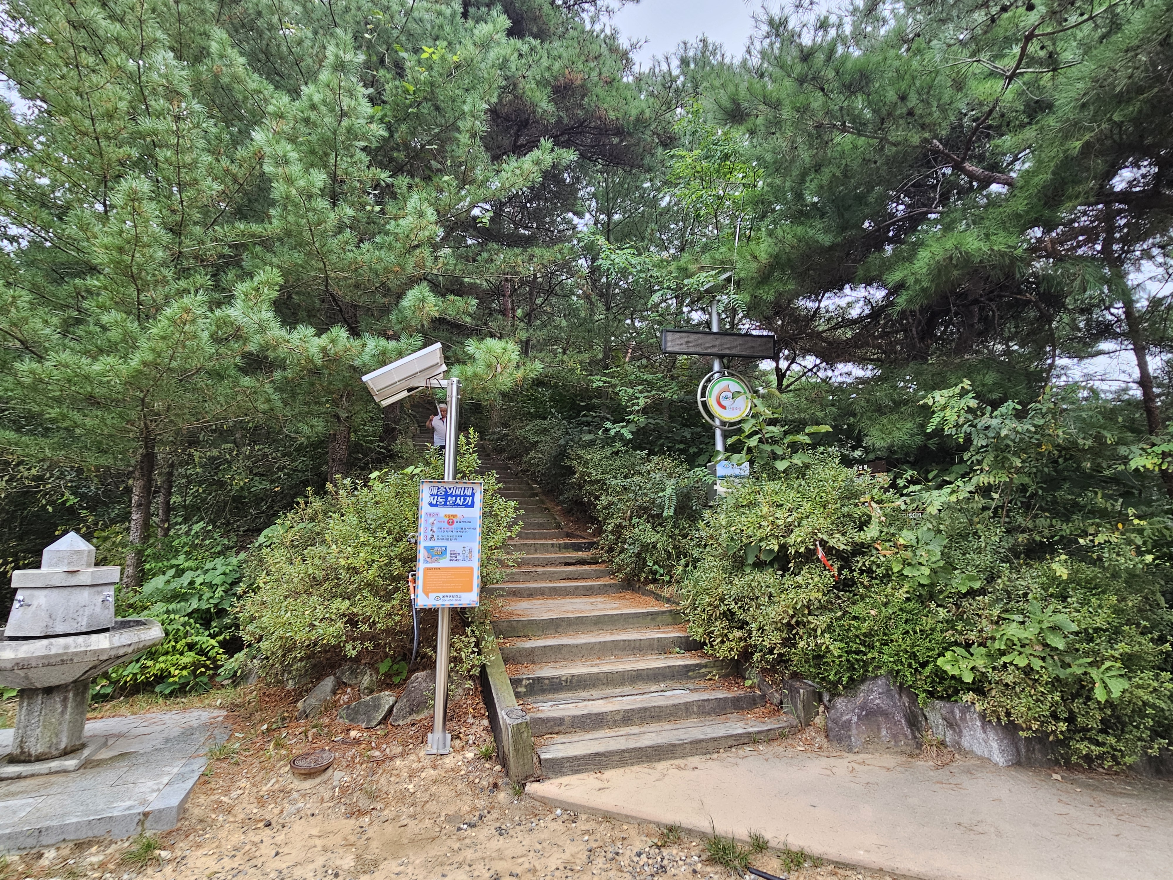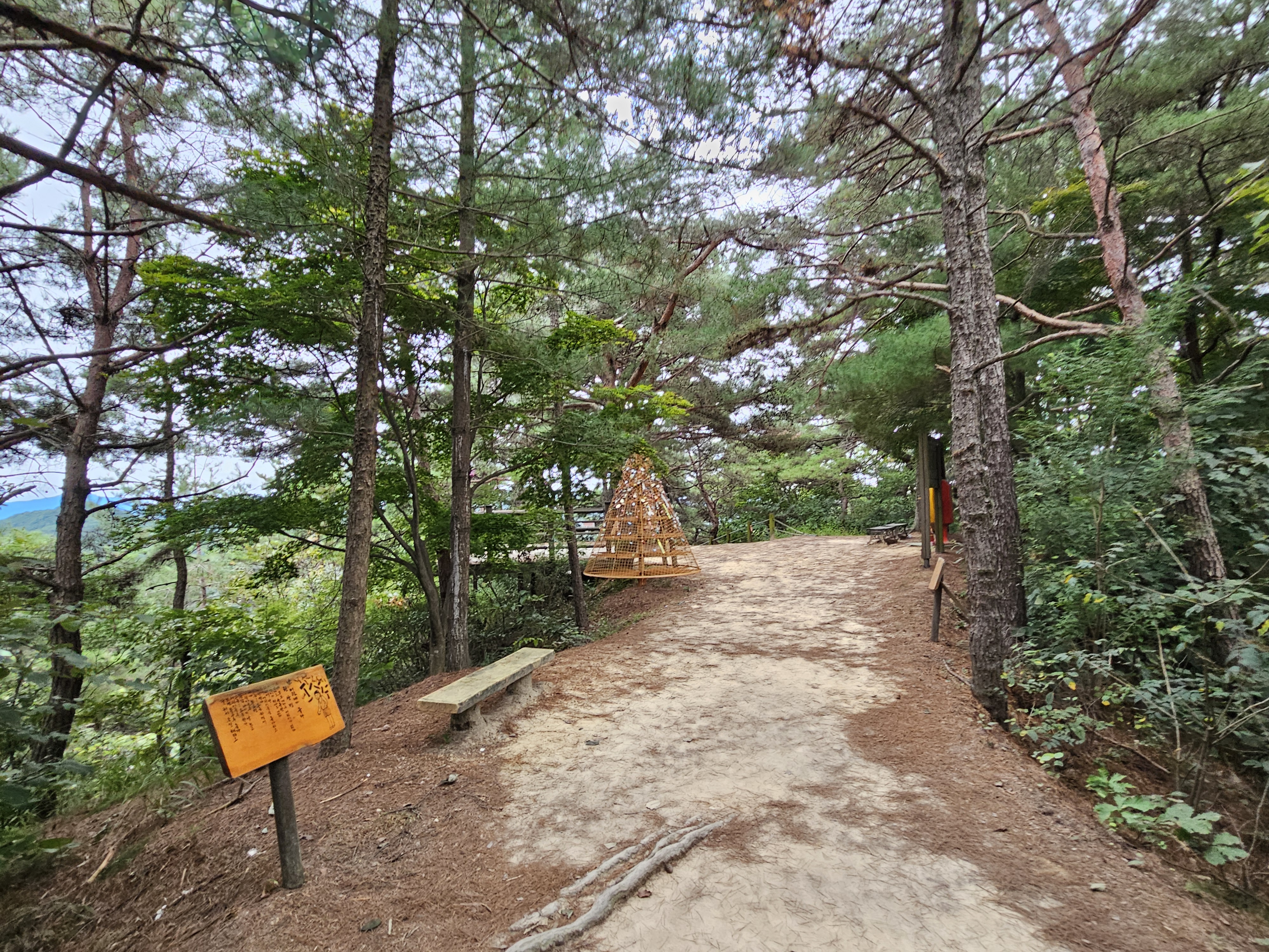 계단이 소박하게 만들어져 있고 양쪽엔 울창한 소나무가 있으며, 시 작품들이 걸려 있어서 심심하지 않게 오를 수 있습니다.