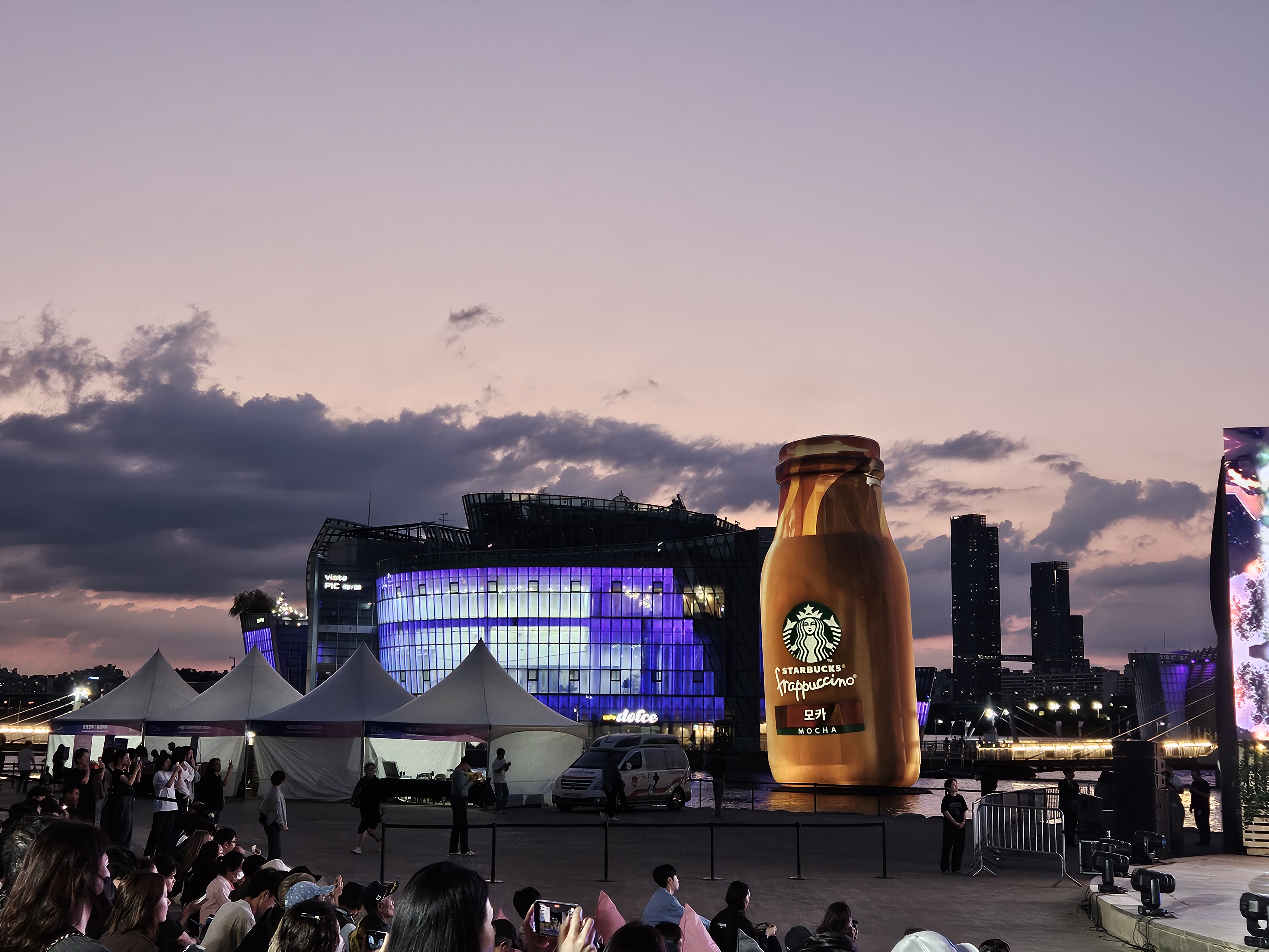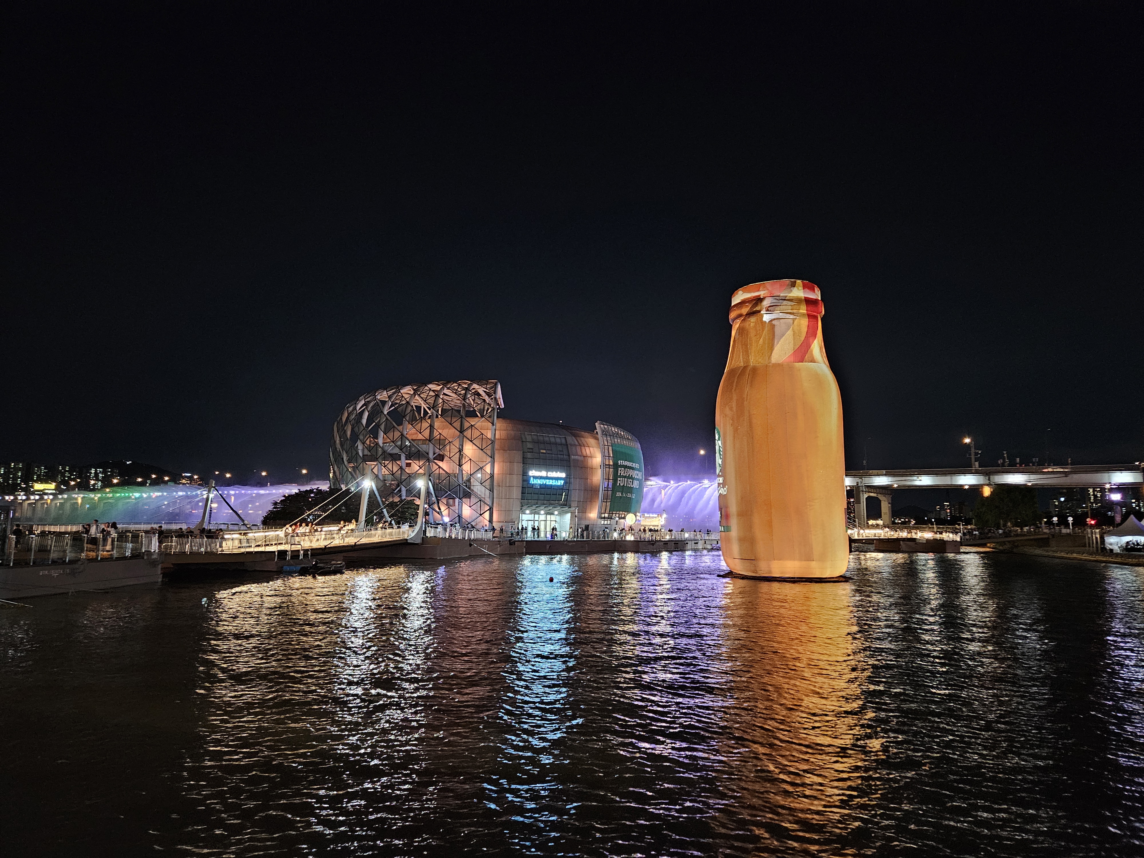 반포한강공원 세빛섬 앞에 떠 있는 스타벅스 프라푸치노 모카 병