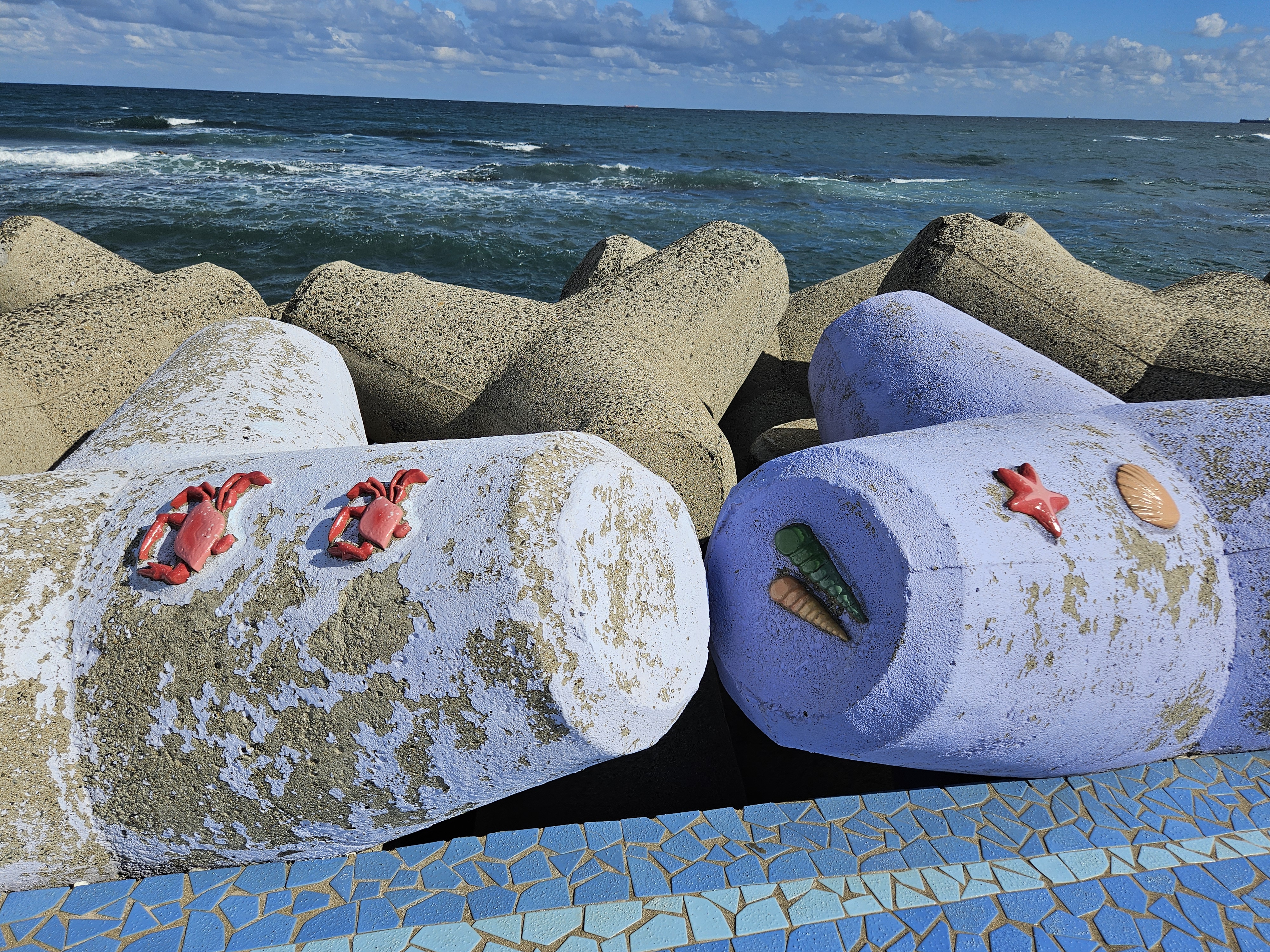 방파제에 새겨진 게와 불가사리, 조개 모형