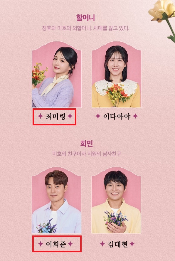 치매를 앓고 있는 정후와 미호의 외할머니 역에는 최미령과 이다아야가 연기합니다.