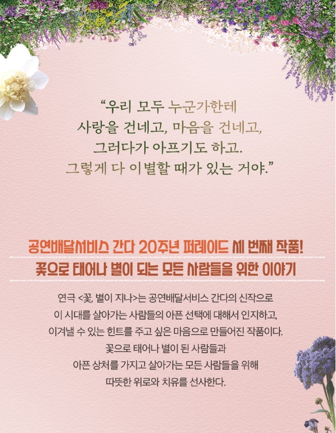 연극 '꽃, 별이 지나'는 공연배달서비스 간다는 극단 창립 20주년을 맞아 '템플', '그때도 오늘'에 이은 세 번째 작품인데요.