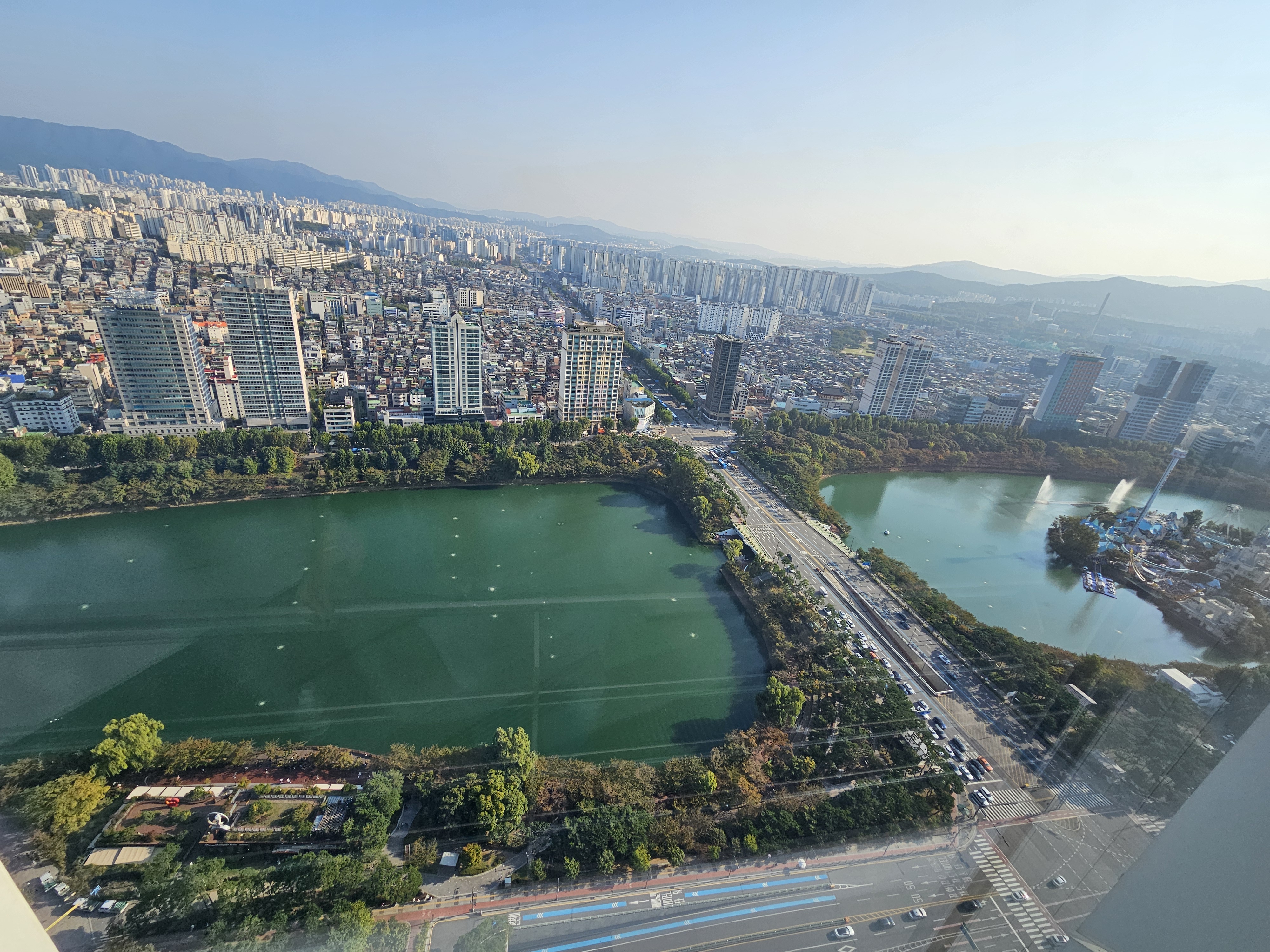 롯데월드타워 SKY31에서 보이는 풍경은 석촌호수와 서울 동부지역의 조망입니다.