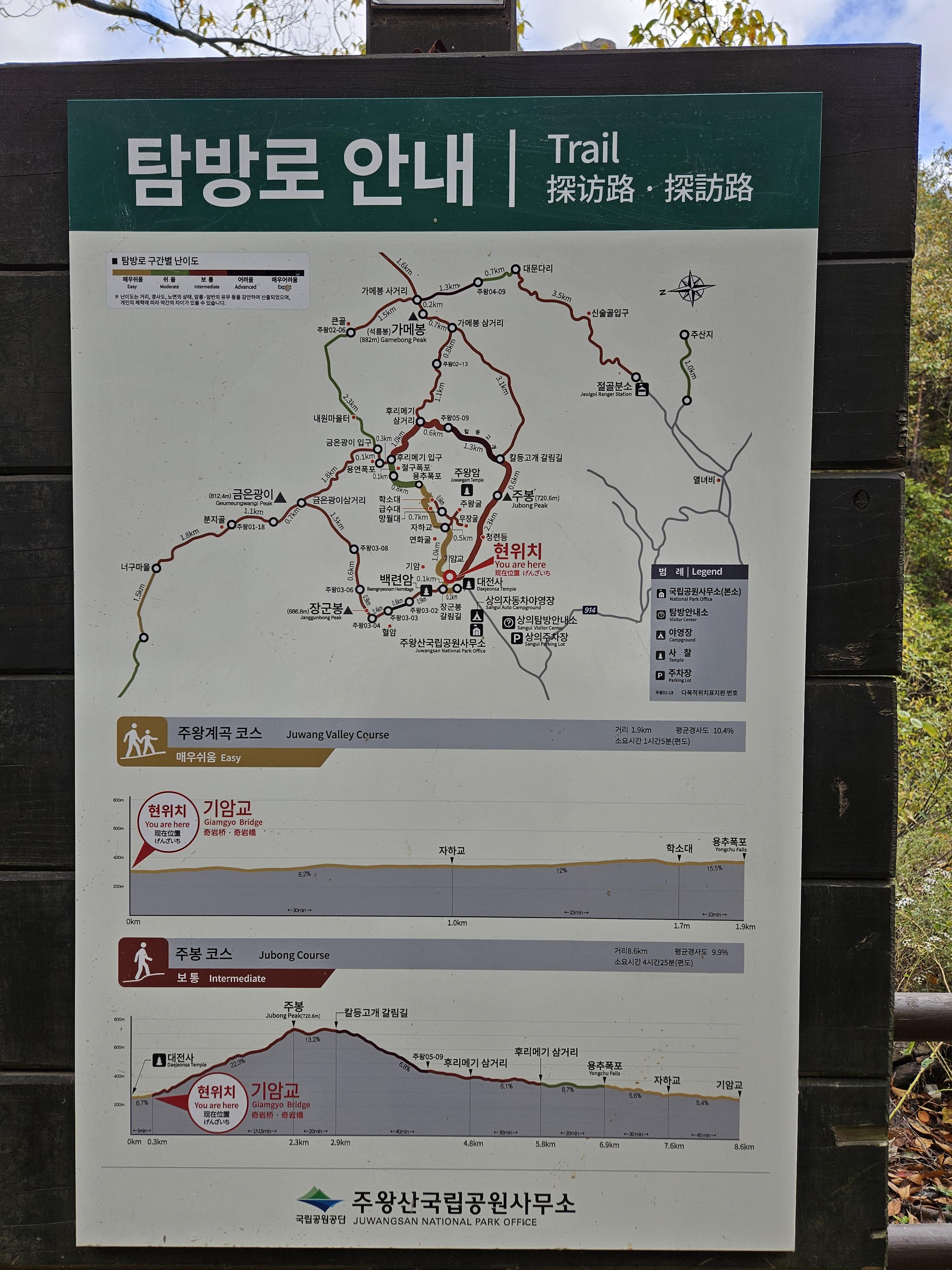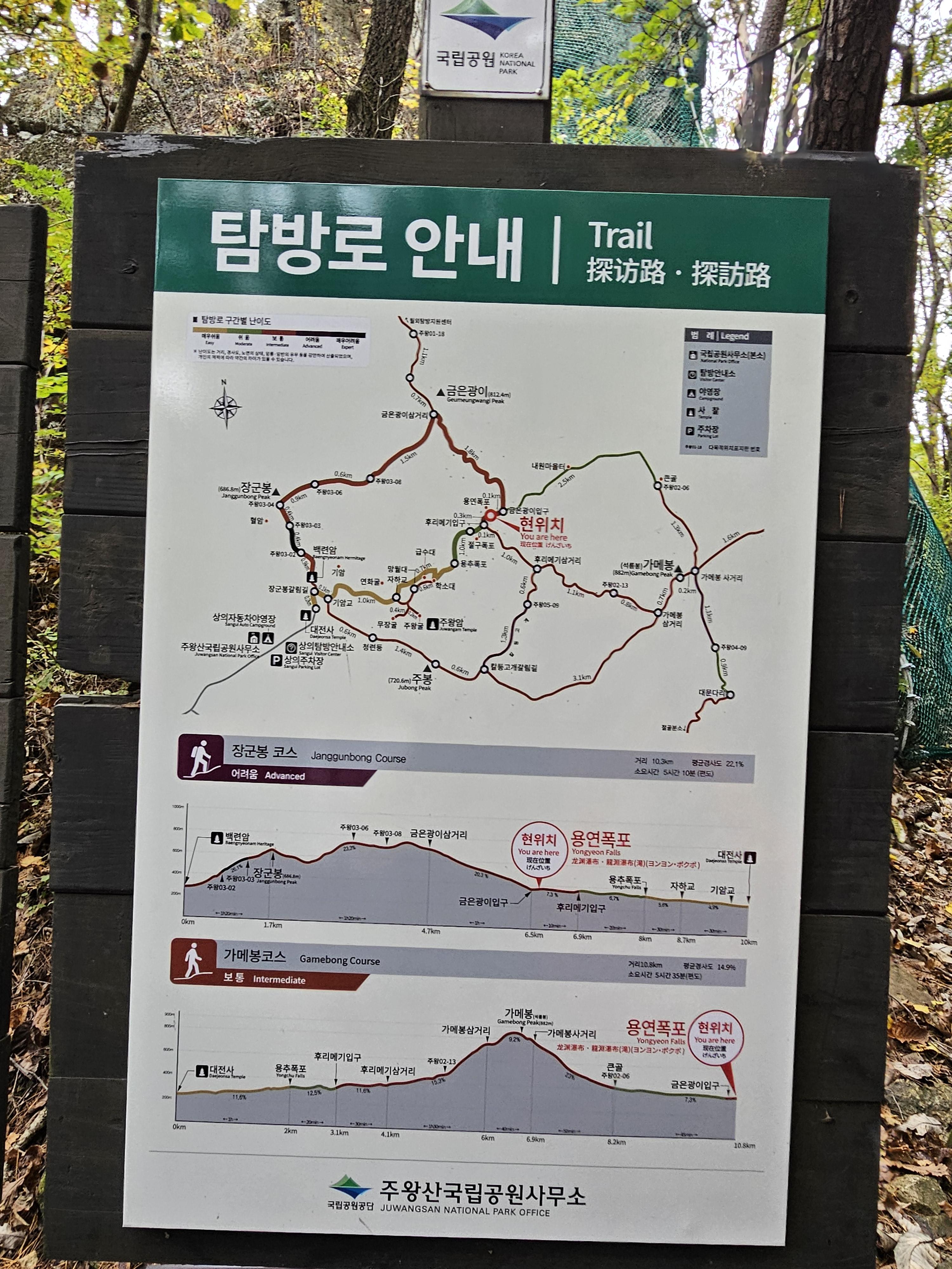 대전사~주봉~용추폭포~기암교 구간으로 거리는 8.6km, 소요시간은 4시간 30분 정도입니다.