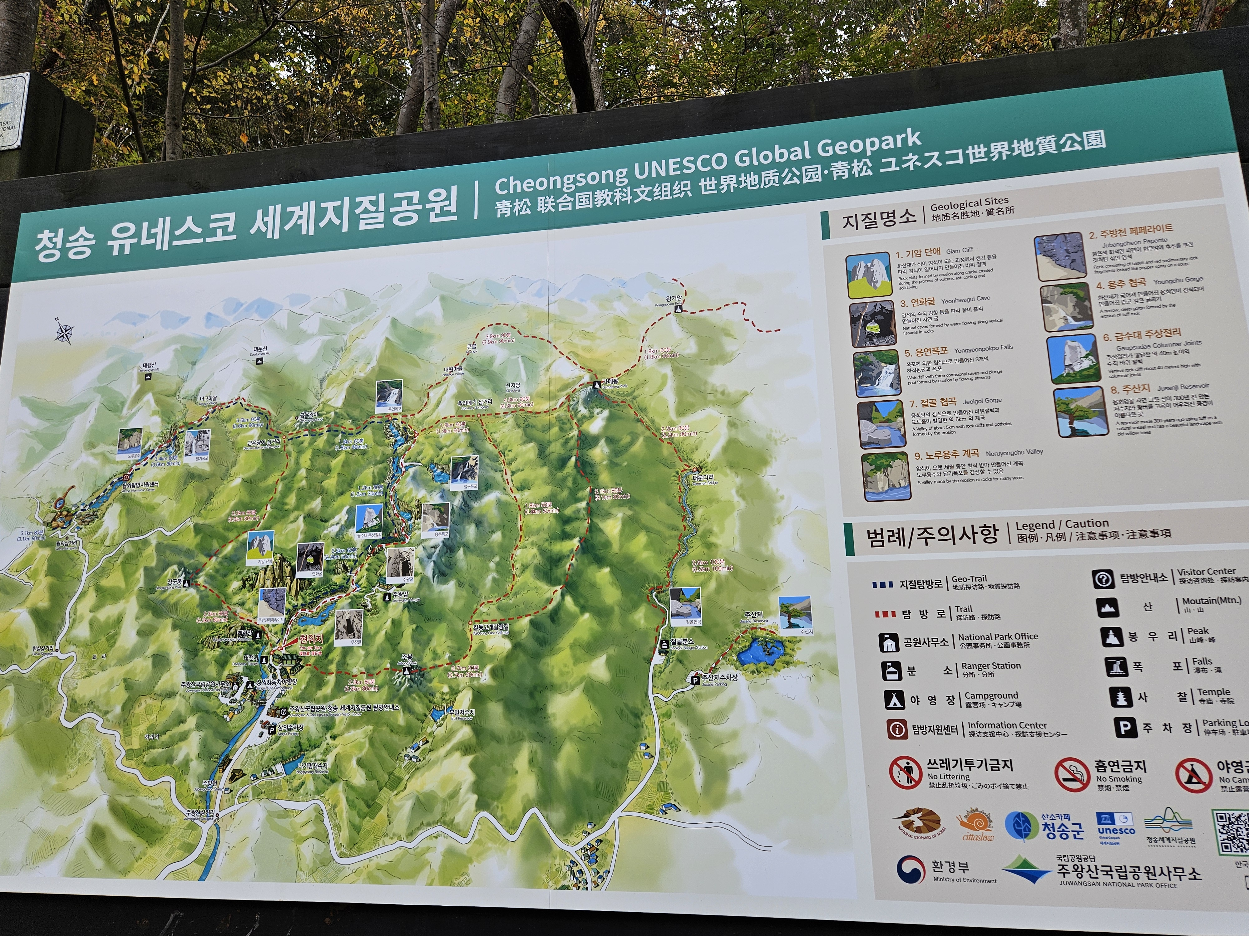 주왕산 권역과 신성계곡 권역으로 나뉘며, 총 24개의 지질명소로 이루어져 있다고 합니다.