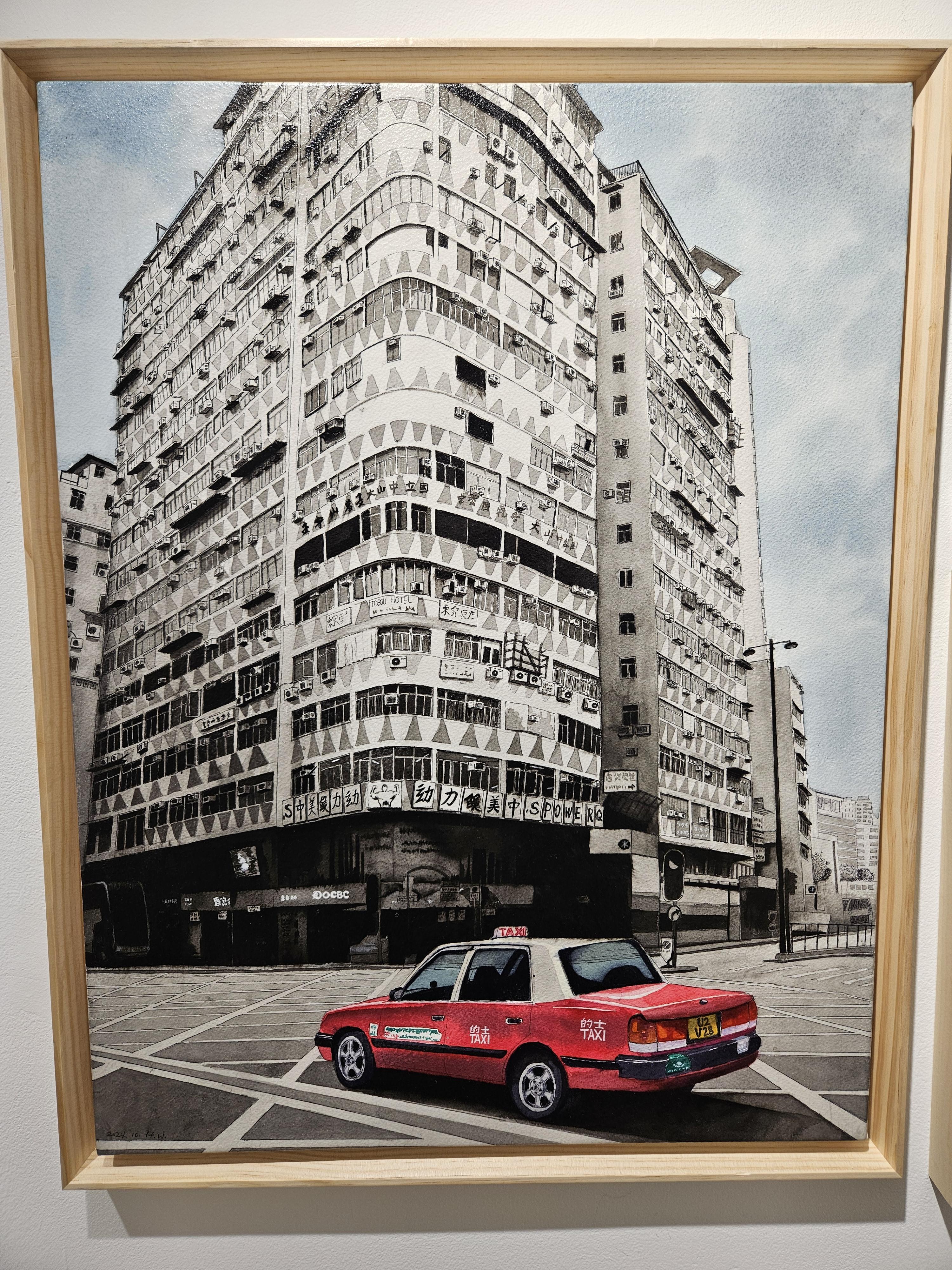 중국이나 일본의 어느 흑색의 고층빌딩 아래 빨간 택시 풍경을 그린 작품인데, 무척이라 아름답게 그렸네요.