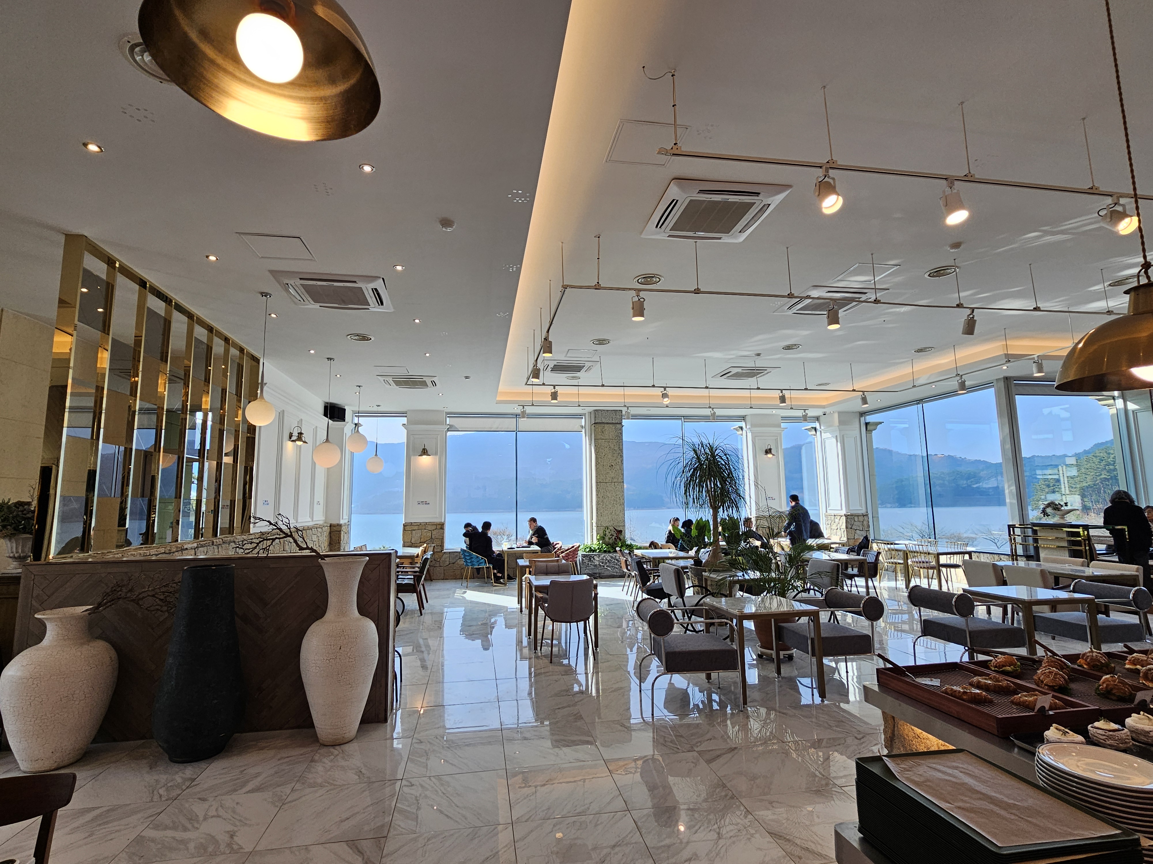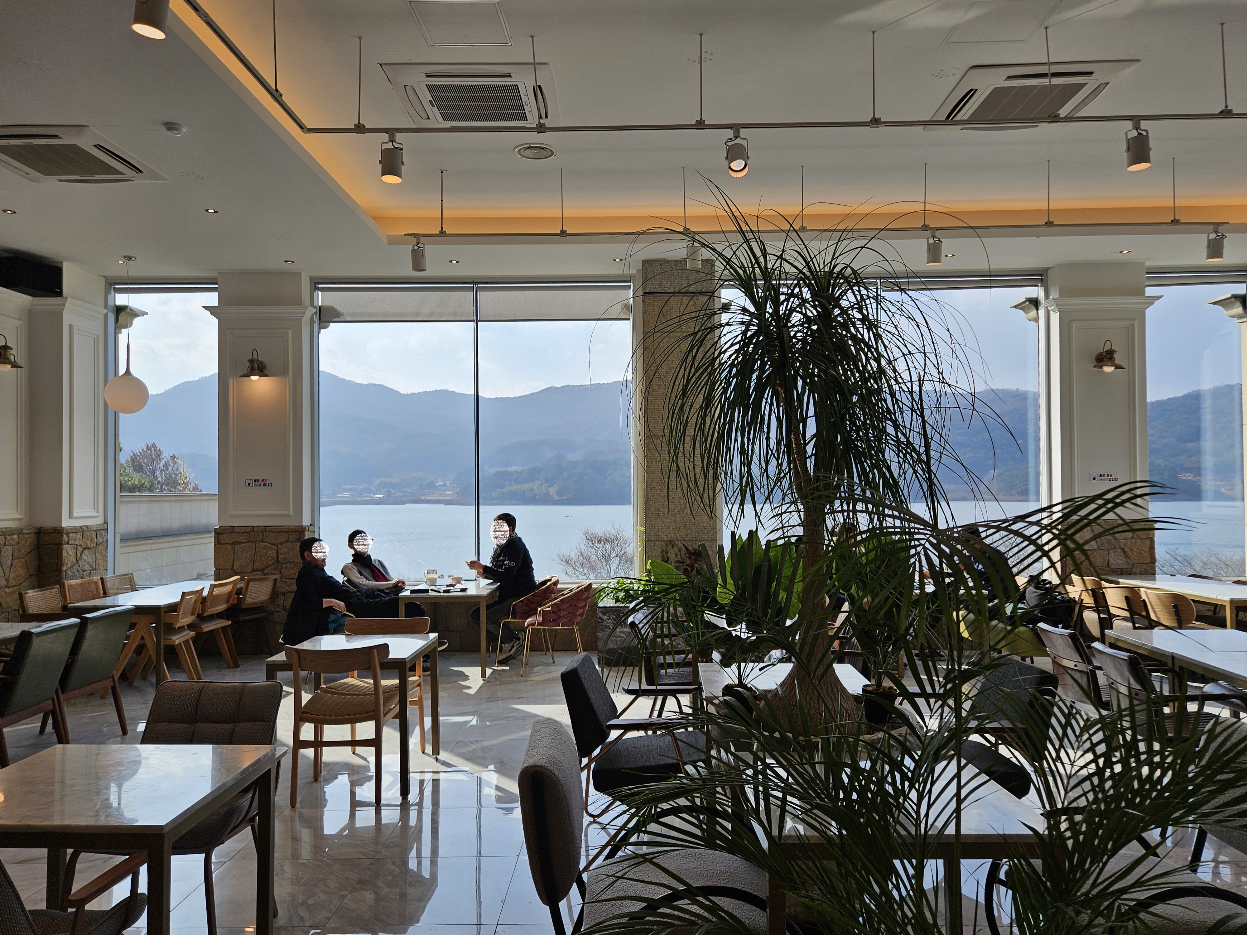 2층으로 올라가면 넓은 카페가 보이고, 통 큰 창으로는 광주호가 훤하게 보입니다.