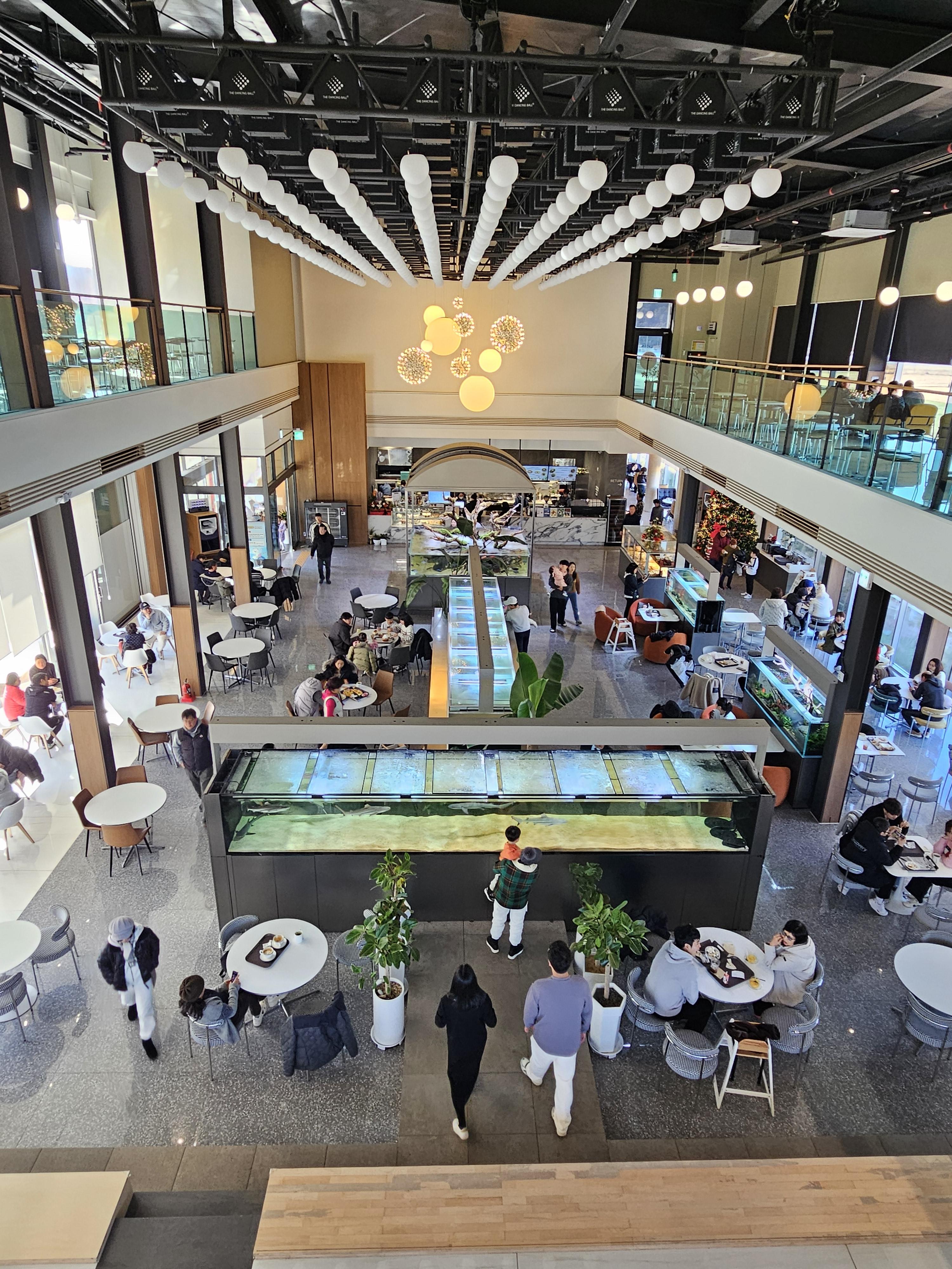 1층 중앙에 수족관들이 놓여 있고, 좌석은 1층과 2층 창가 쪽으로 둘러서 앉을 수 있습니다.