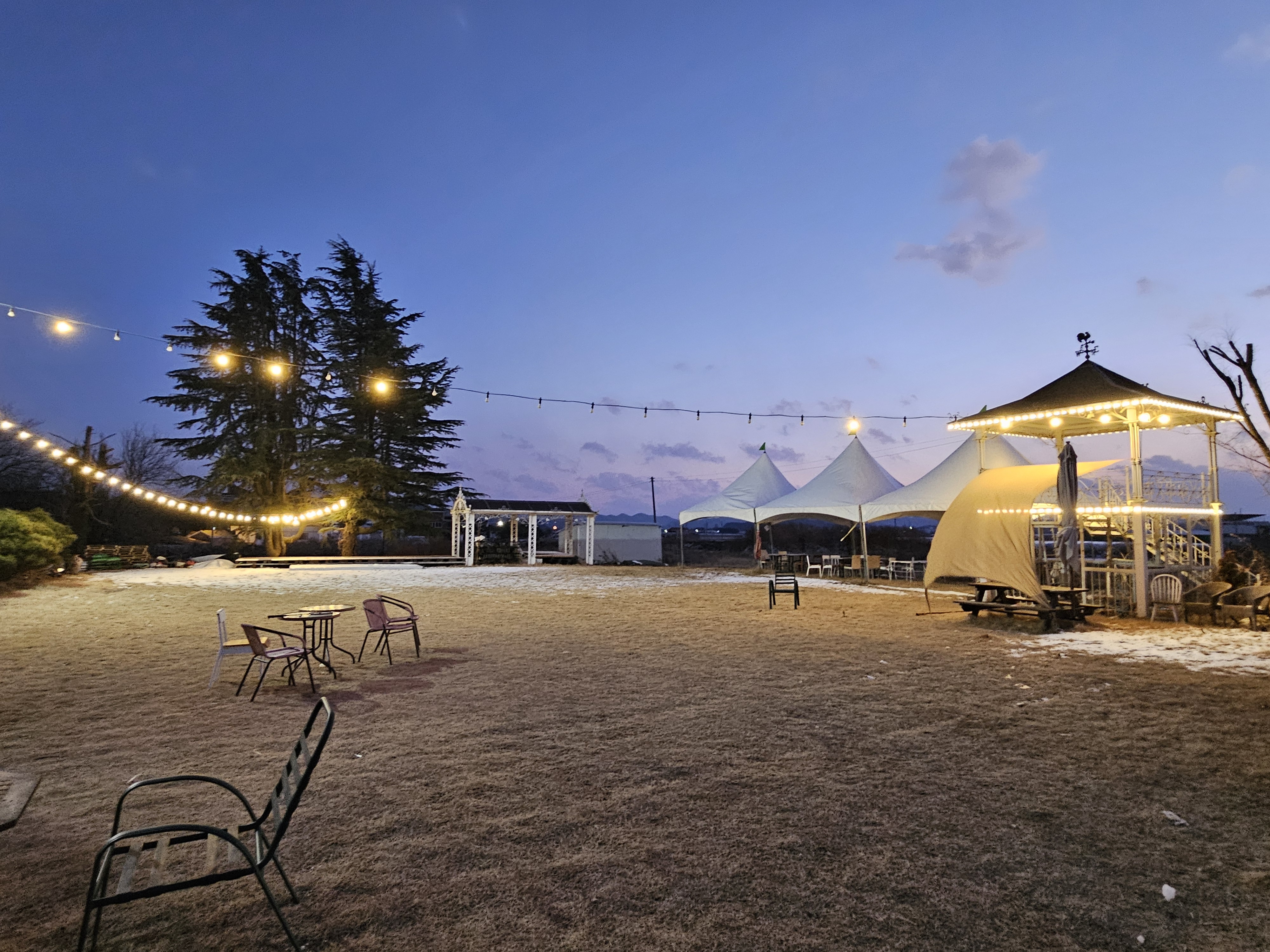 밖으로 나오니 해가 떨어지고 야외 잔디마당엔 조명들이 하나 둘 켜지고 있습니다.