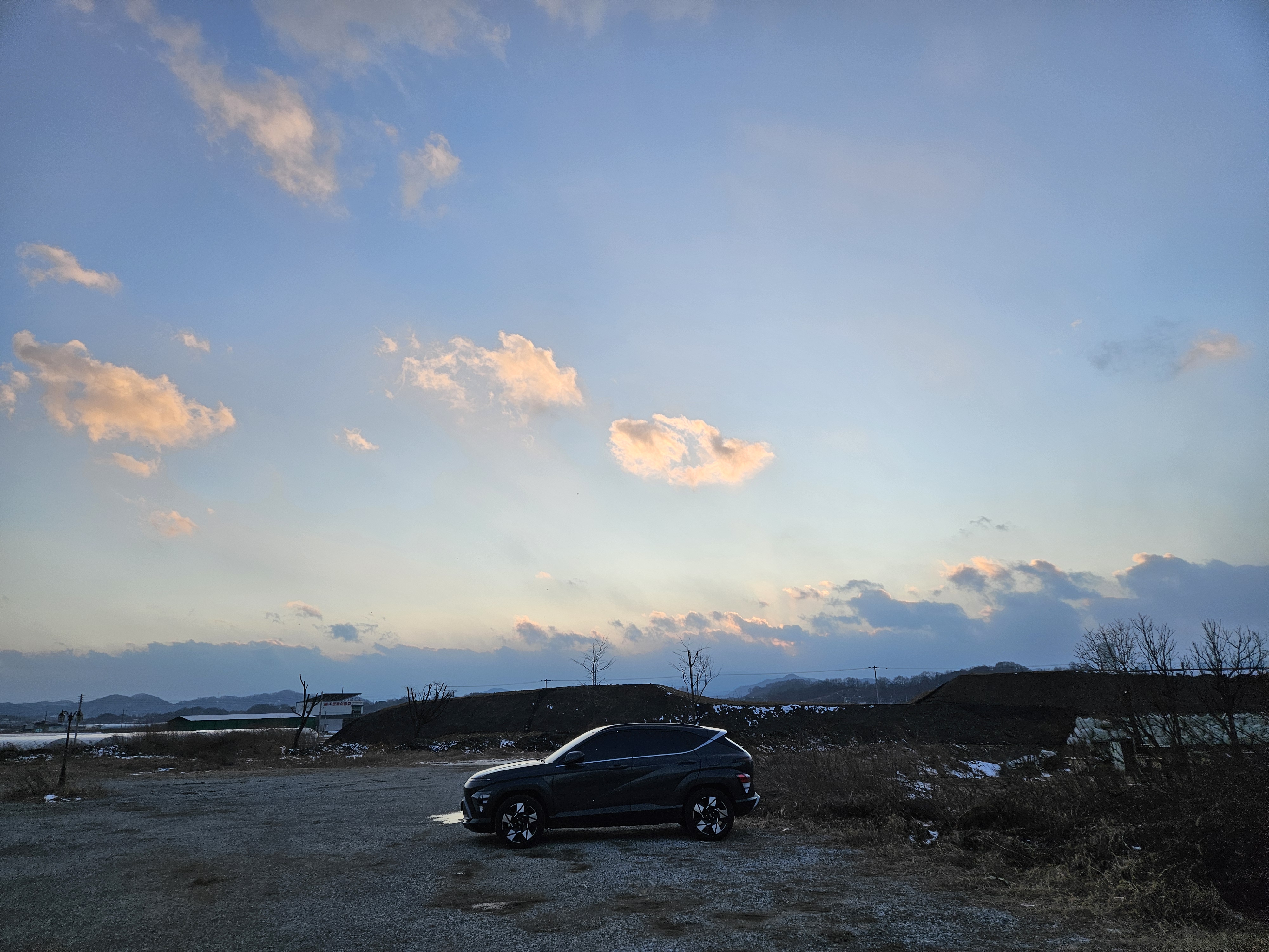 넓은 주차장 너머로 해가 지며 석양이 시작됩니다.