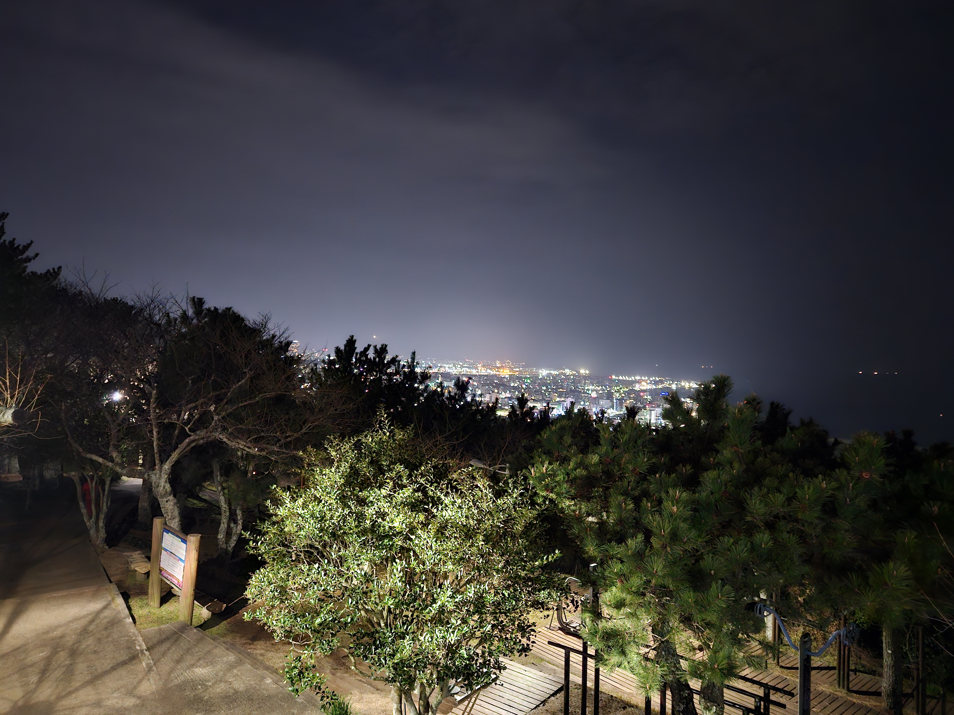 제주시의 화려한 야경과 함께 일몰을 볼 수 있는 서쪽 바다가 펼쳐져 있습니다.