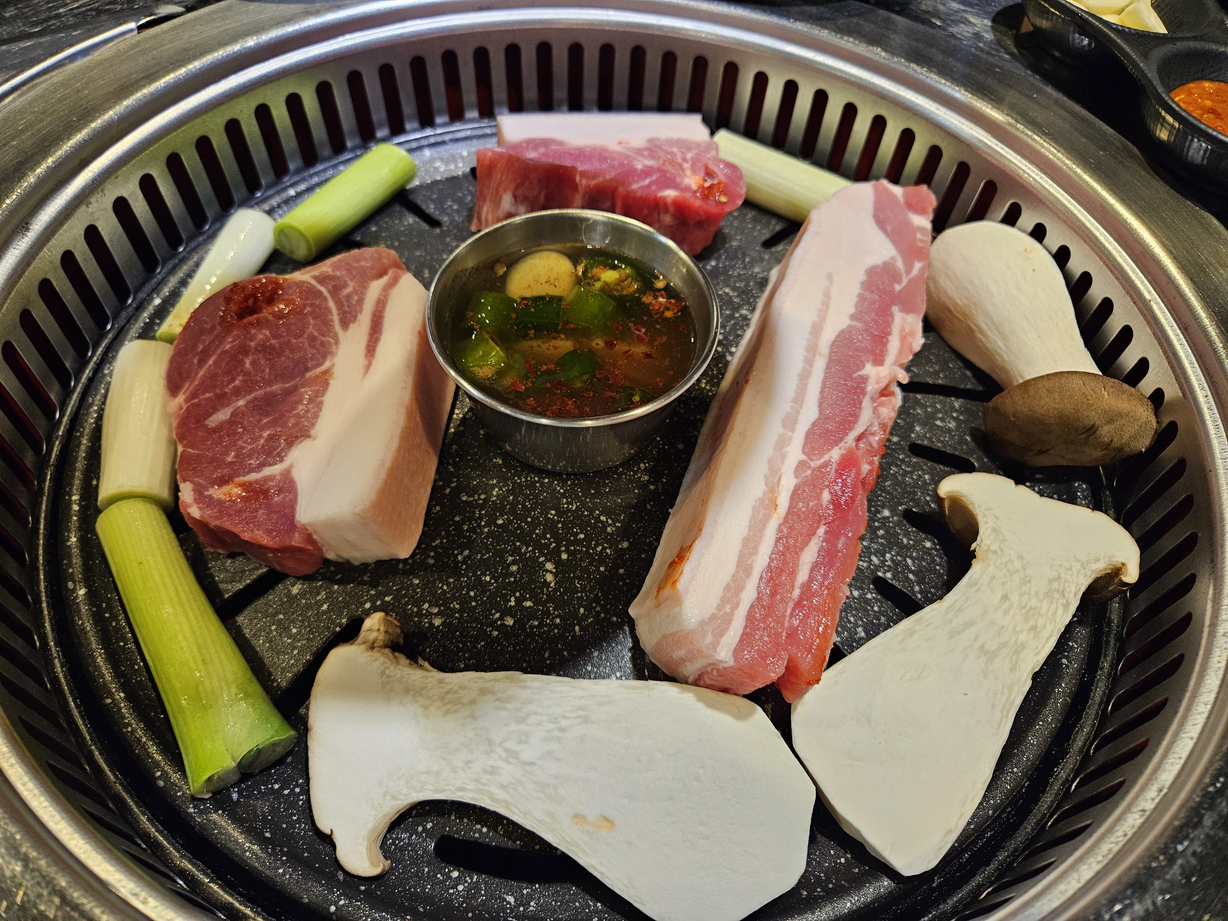 대파와 버섯도 함께 구웠고, 고기 소스도 함께 올라갑니다.