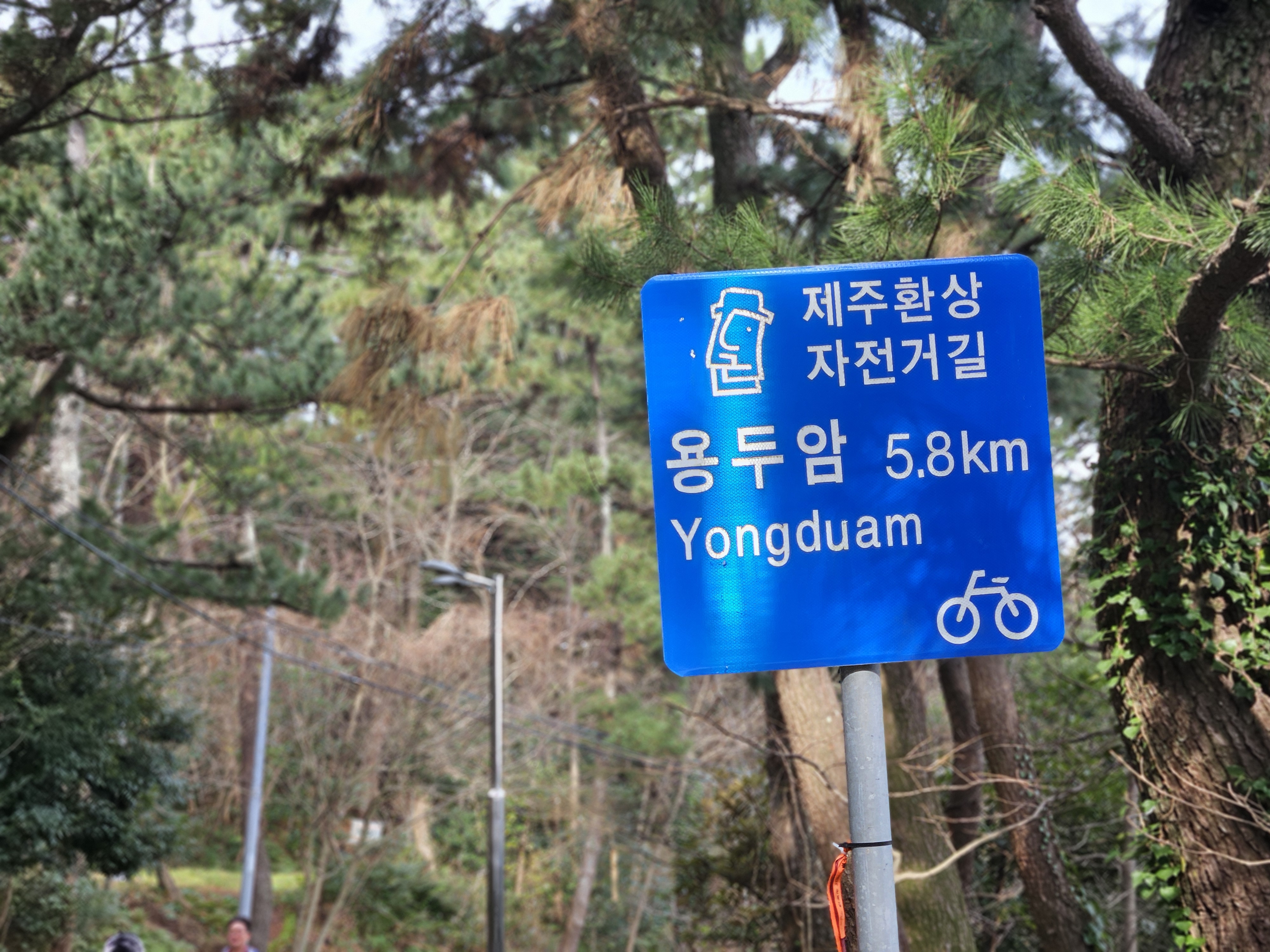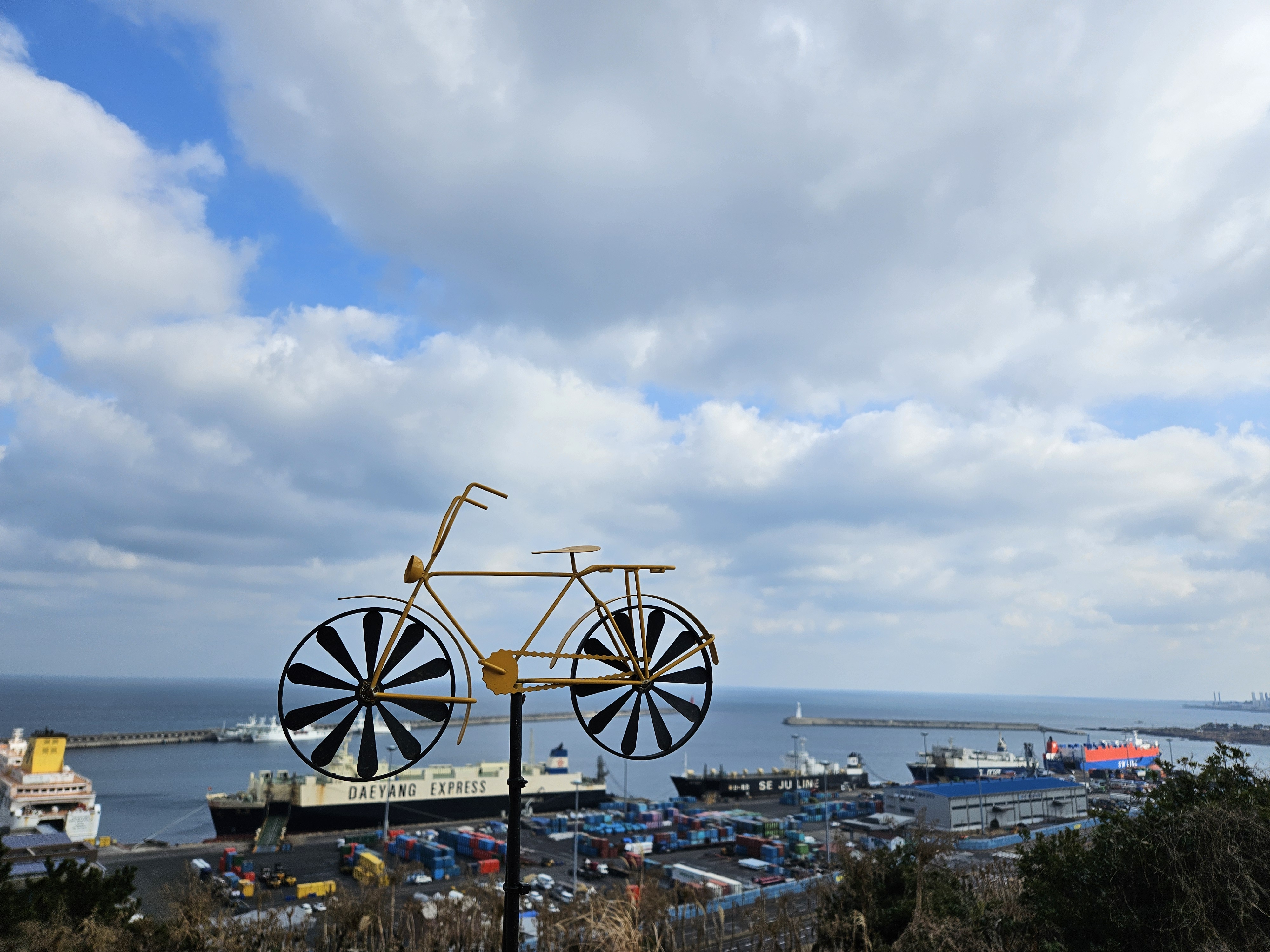 자전거를 배경으로 제주 앞바다 전망을 찍었습니다.