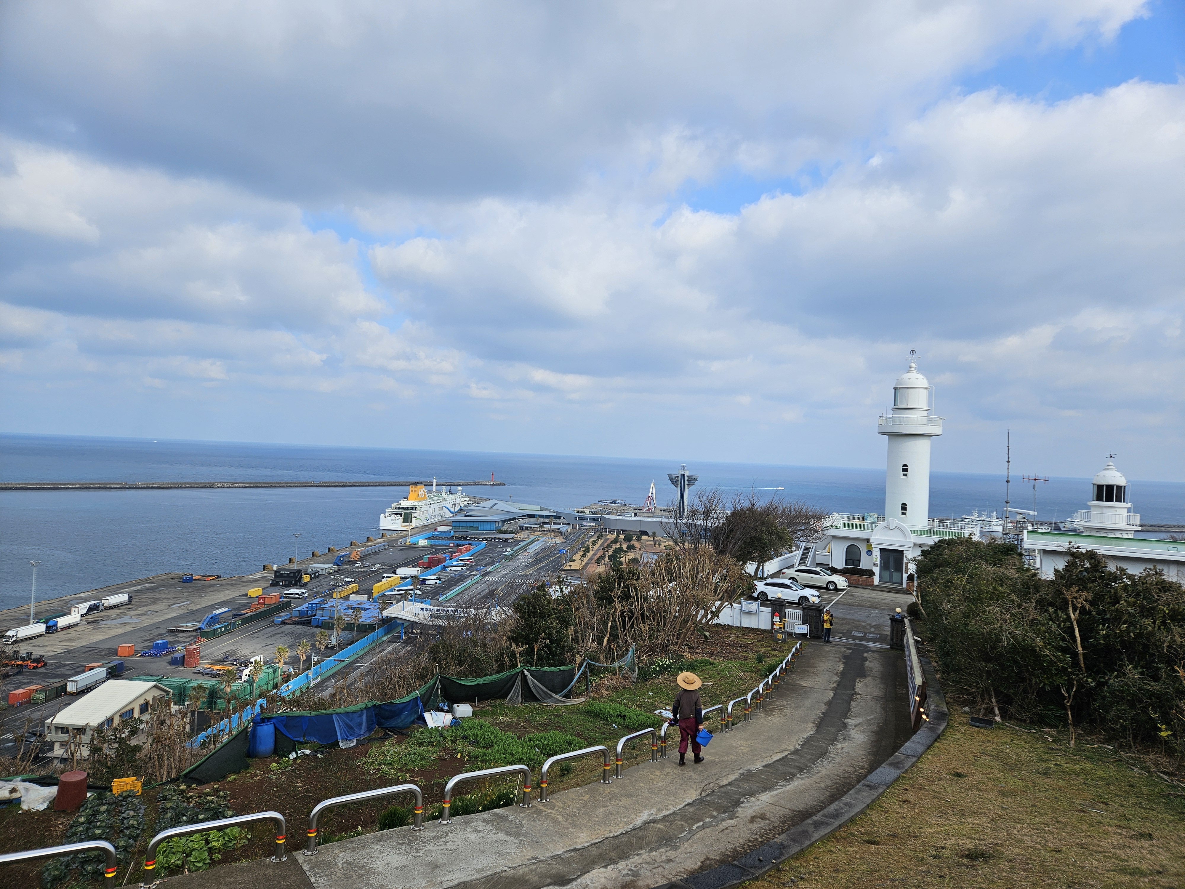 제주항 국제여객터미널 위에는 제주항을 드나드는 선박들의 길잡이 역할을 하는 산지등대가 있습니다.